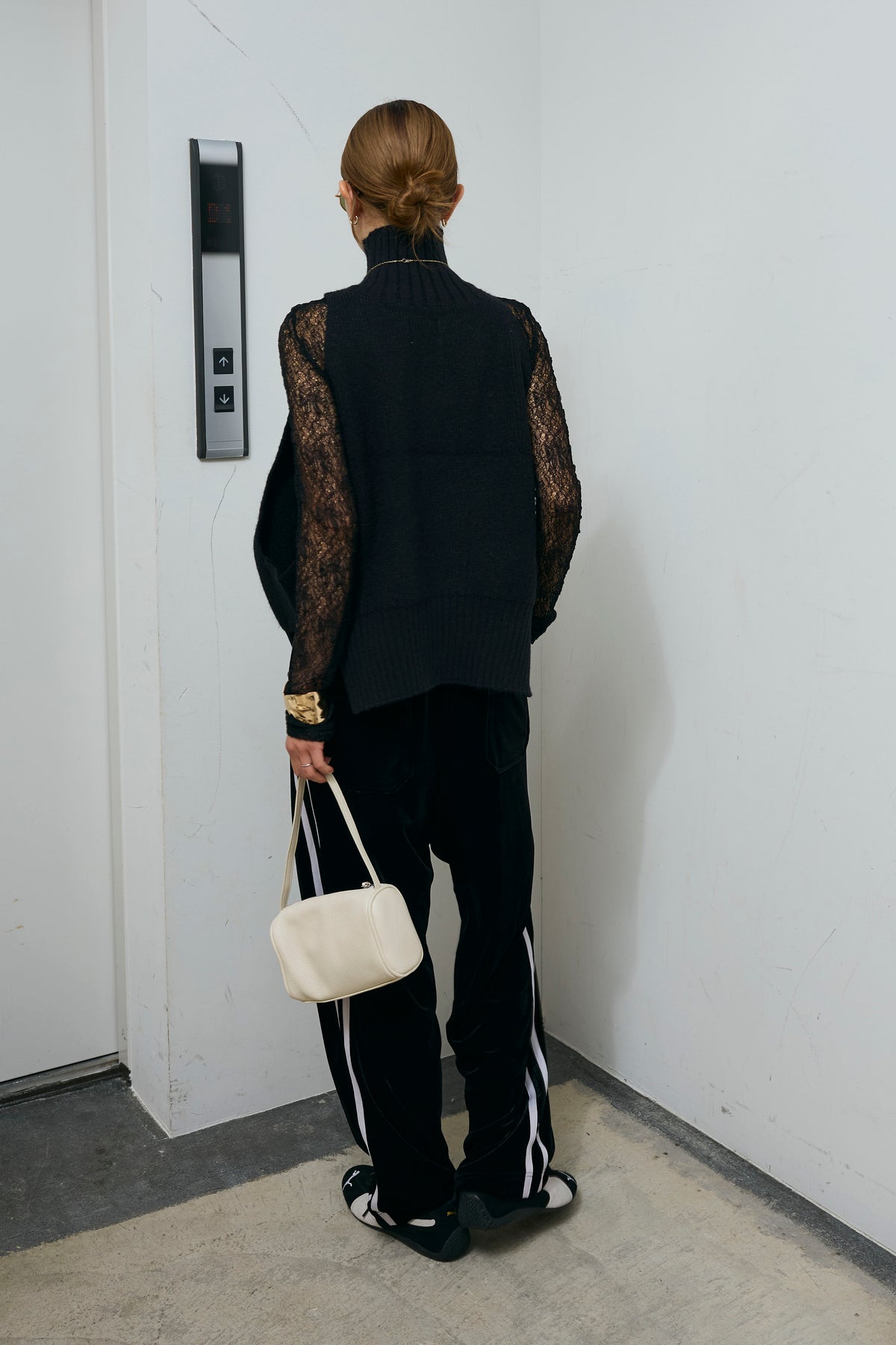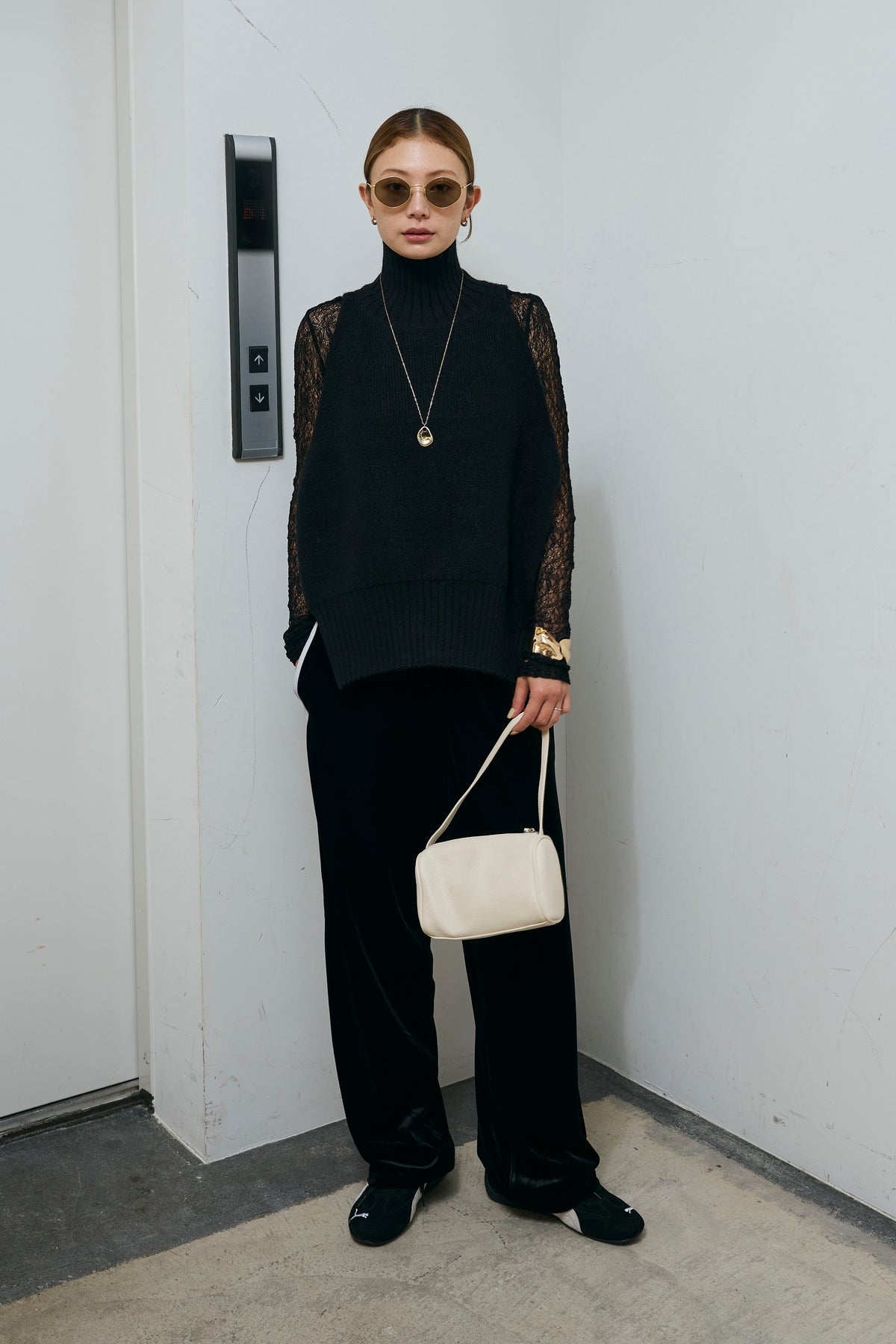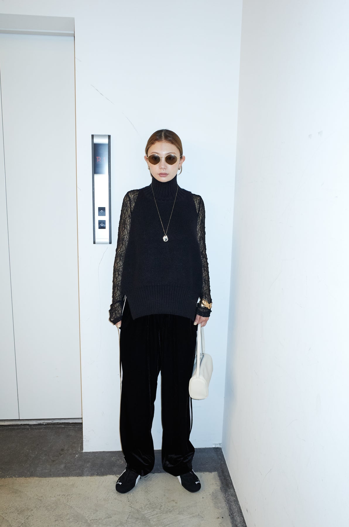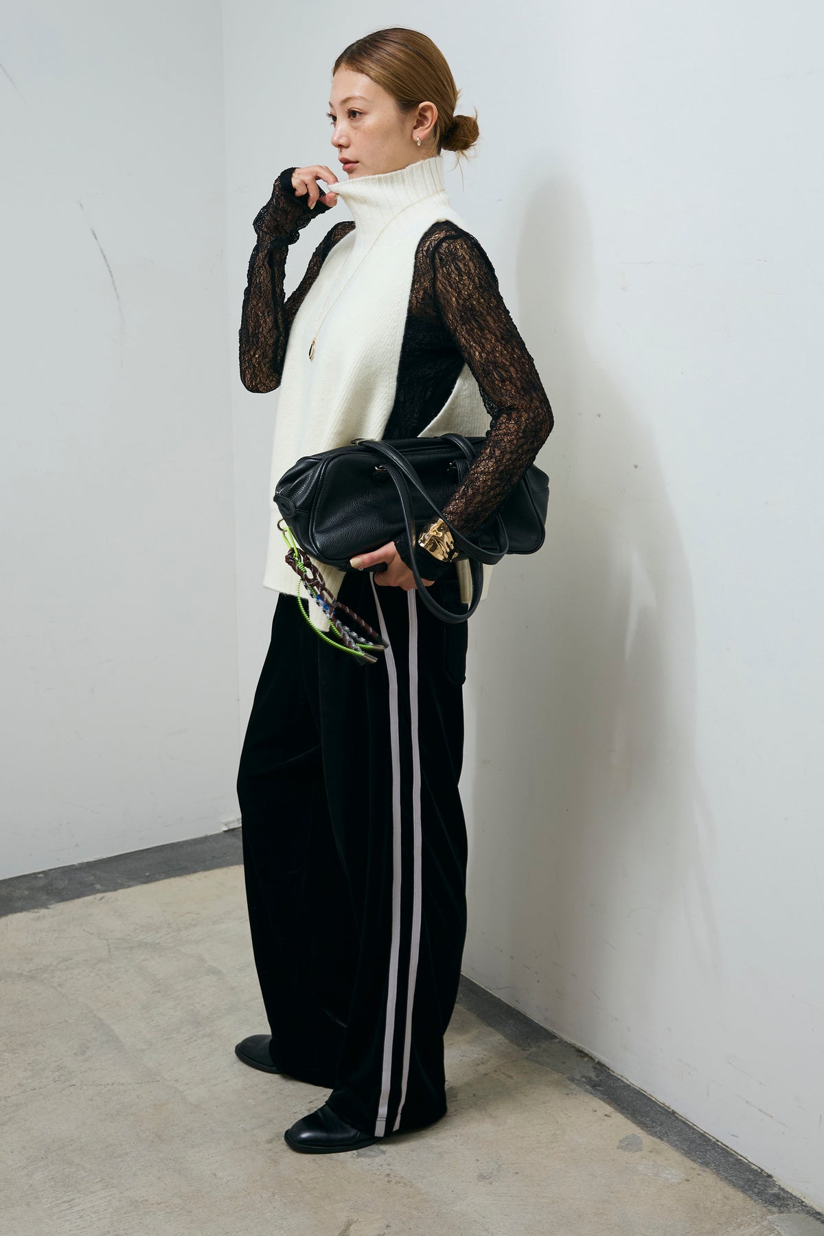 [予約/SET]ハイネックワイドーオープンニットベスト+シアーレーストップス+サイドラインベロアパンツ(3set)