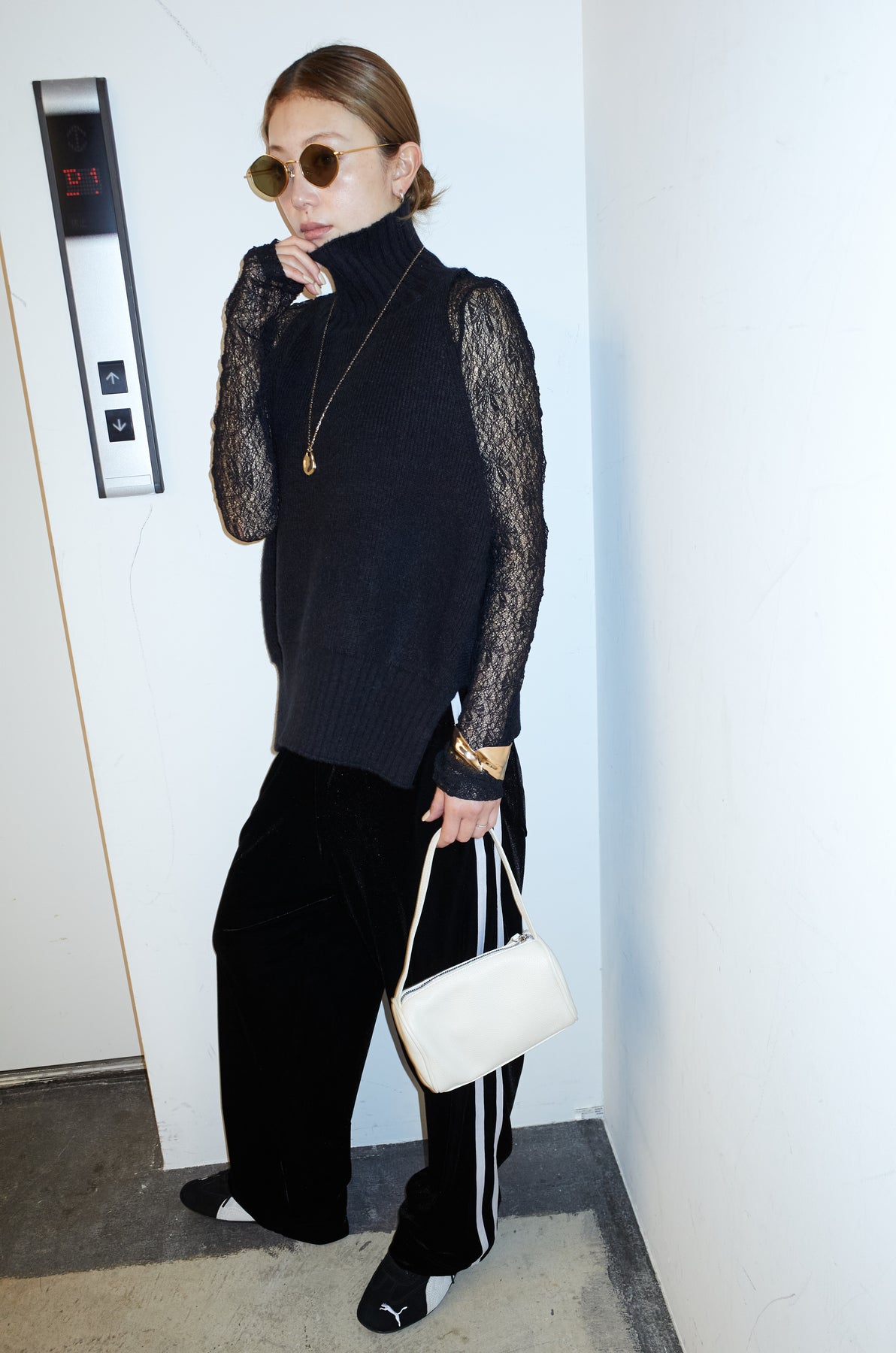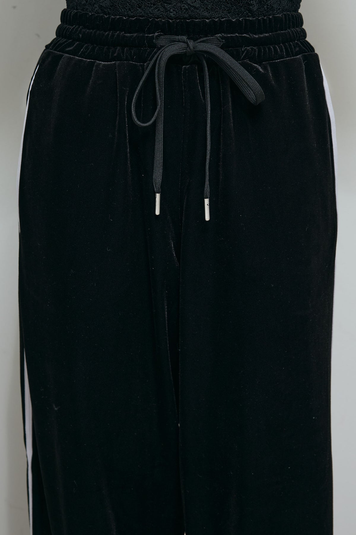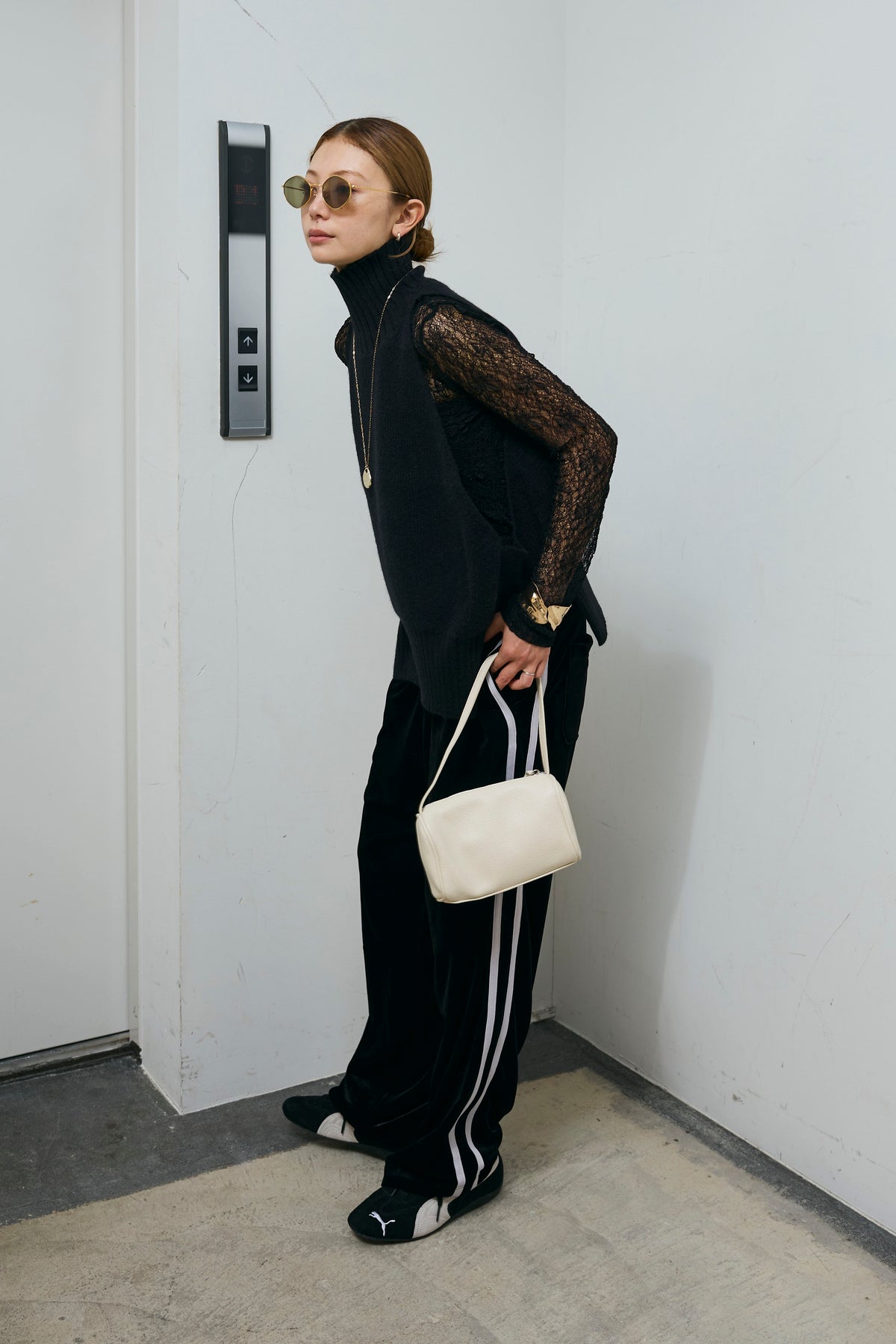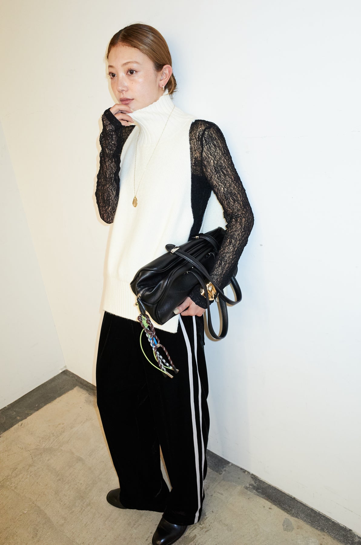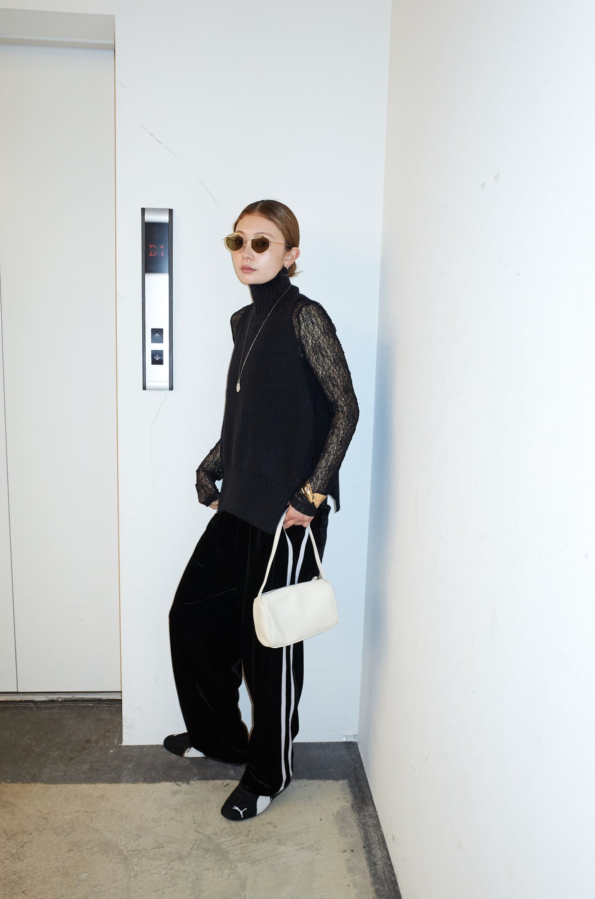 [予約/SET]ハイネックワイドーオープンニットベスト+シアーレーストップス+サイドラインベロアパンツ(3set)