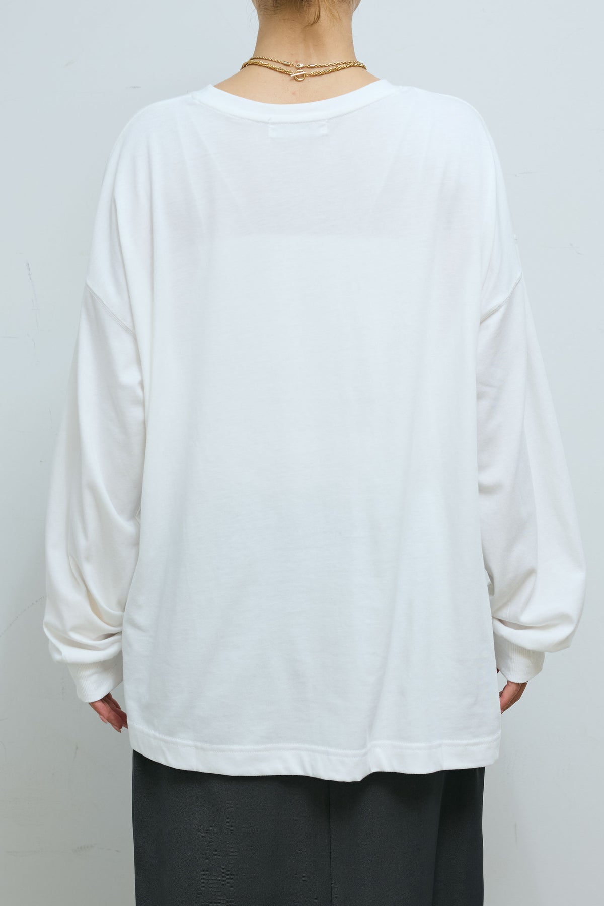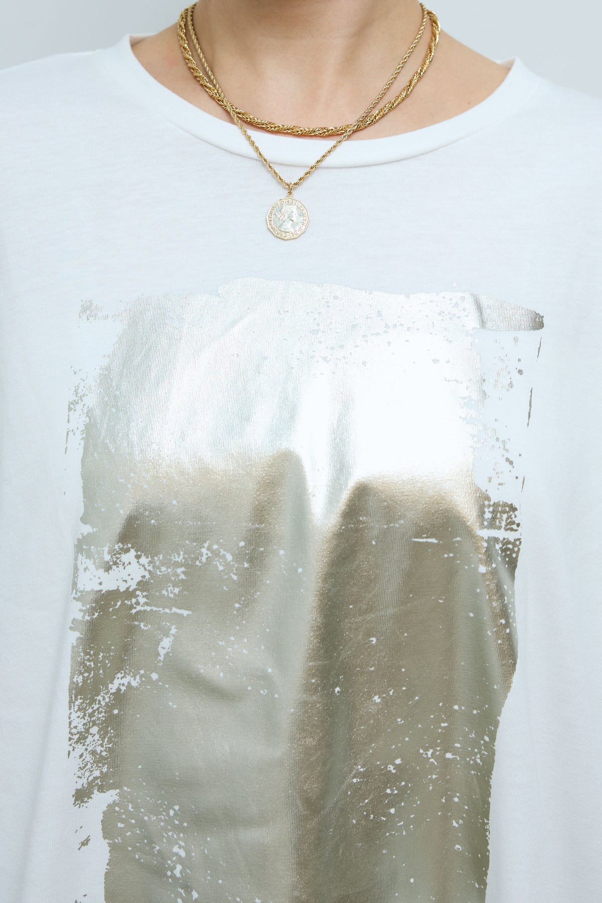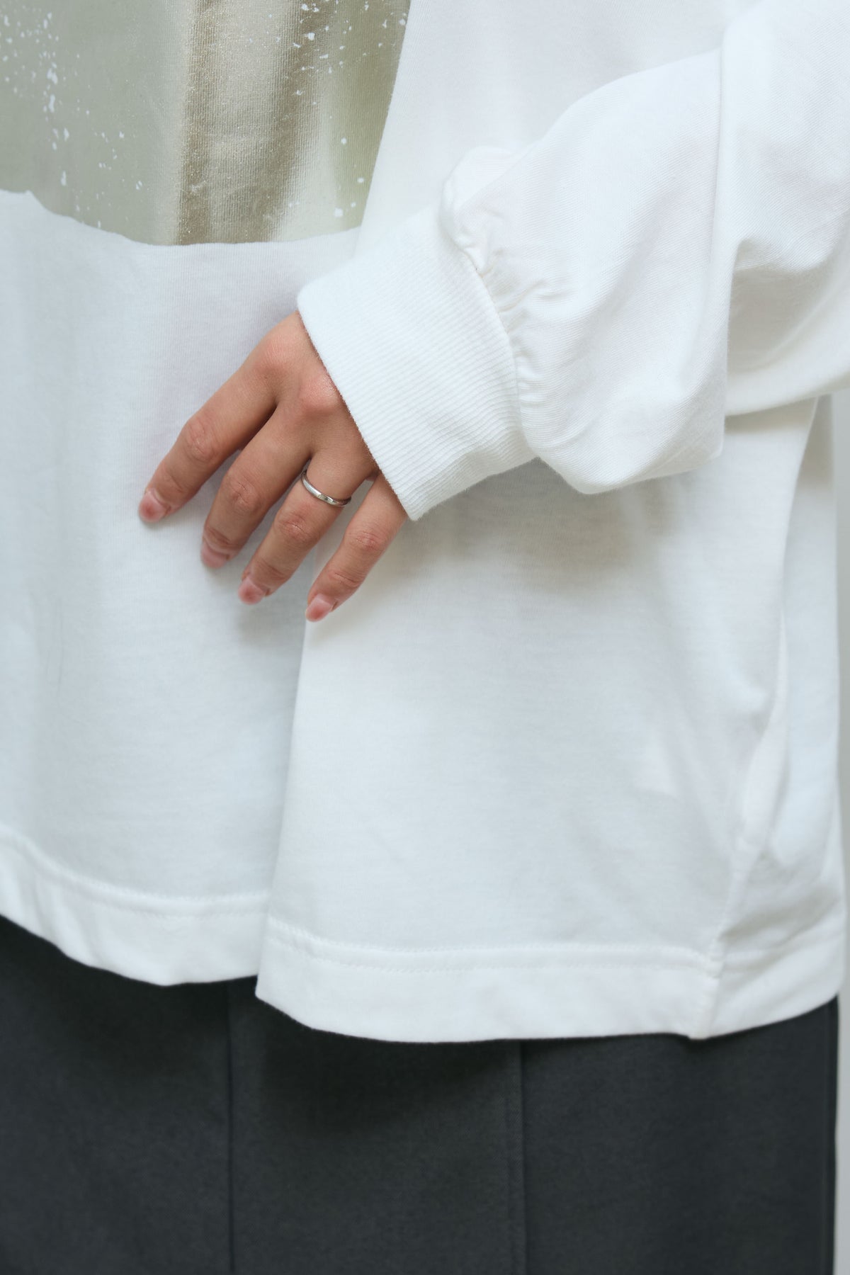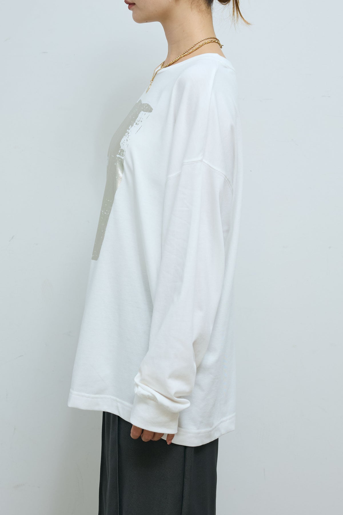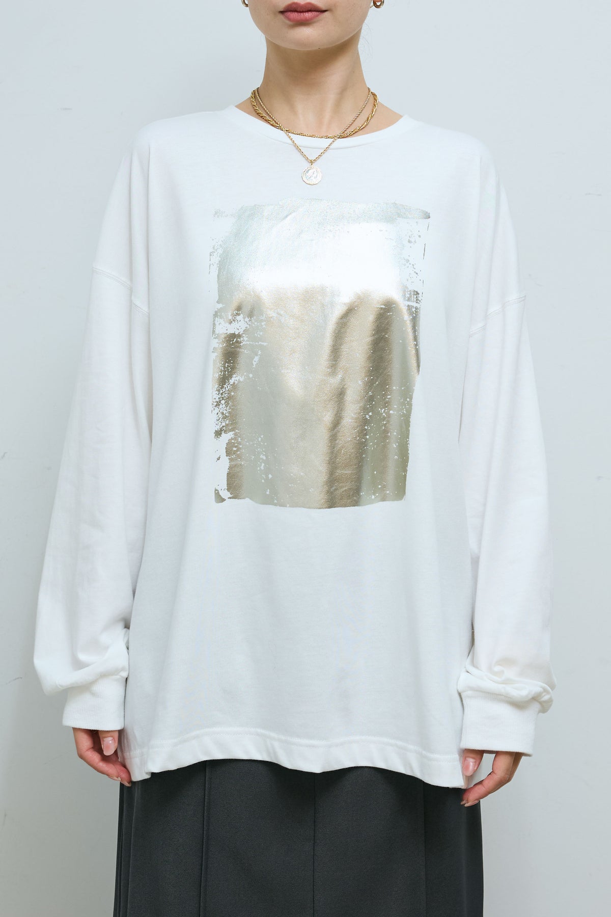 メタリックな箔プリントが目を惹くロングスリーブTシャツ。程よくゆとりのあるシルエットがこなれ感を演出し、ラフに着こなしても様になります。柔らかな生地感で肌当たりが良く、デイリーに着やすい一枚。ベーシックなカラーとミニマルなデザインで、合わせるボトムを選ばず、カジュアルからキレイめまで幅広いスタイルにマッチします。コーディネートのアクセントとしても活躍するアイテムです。