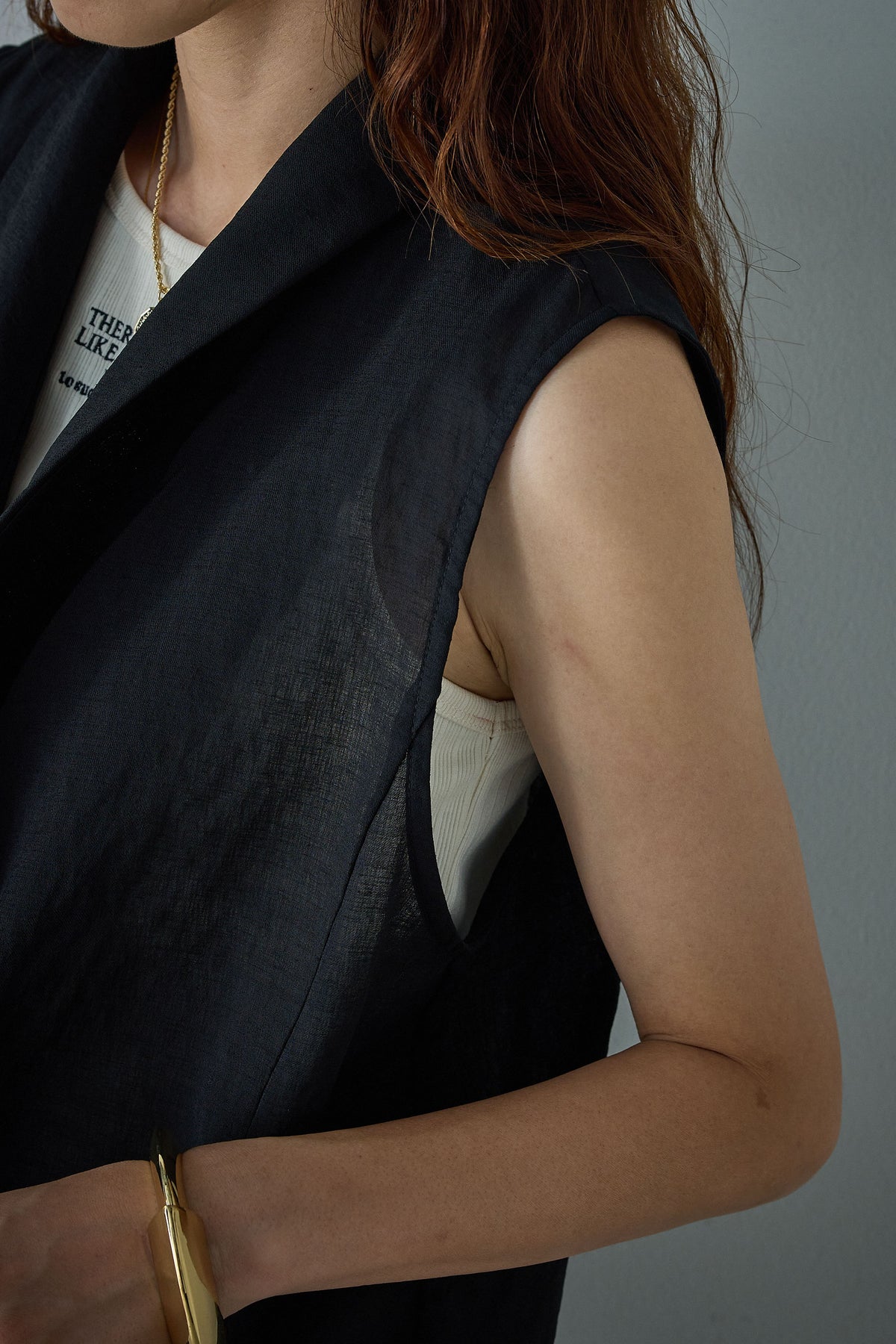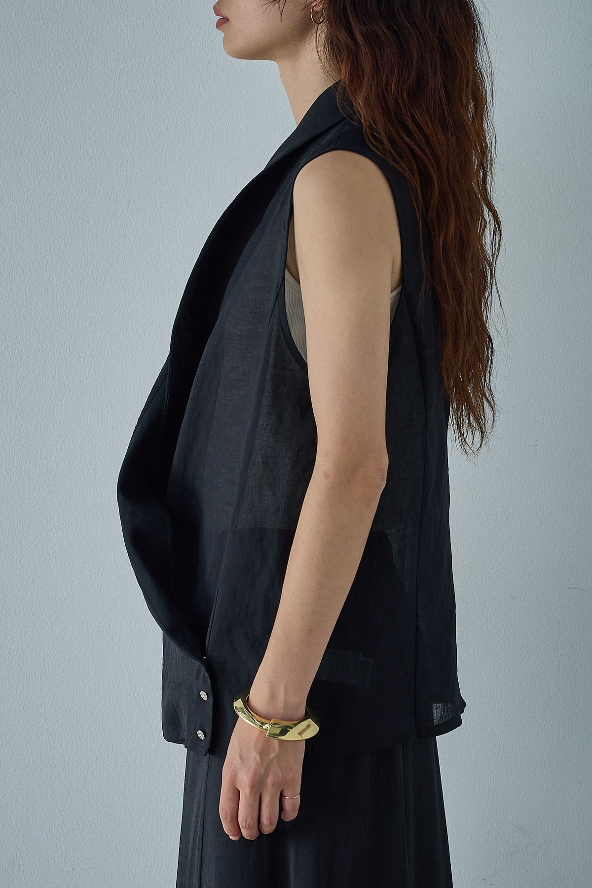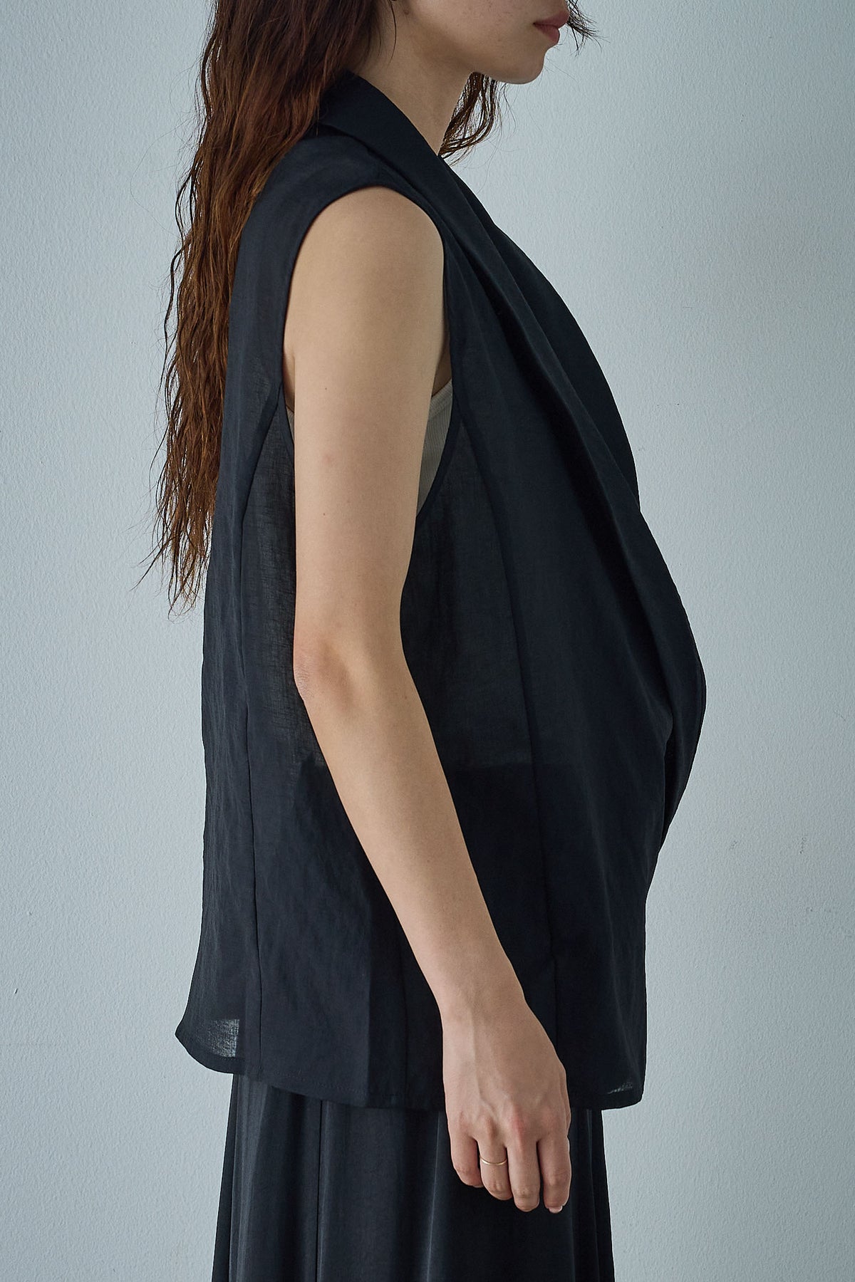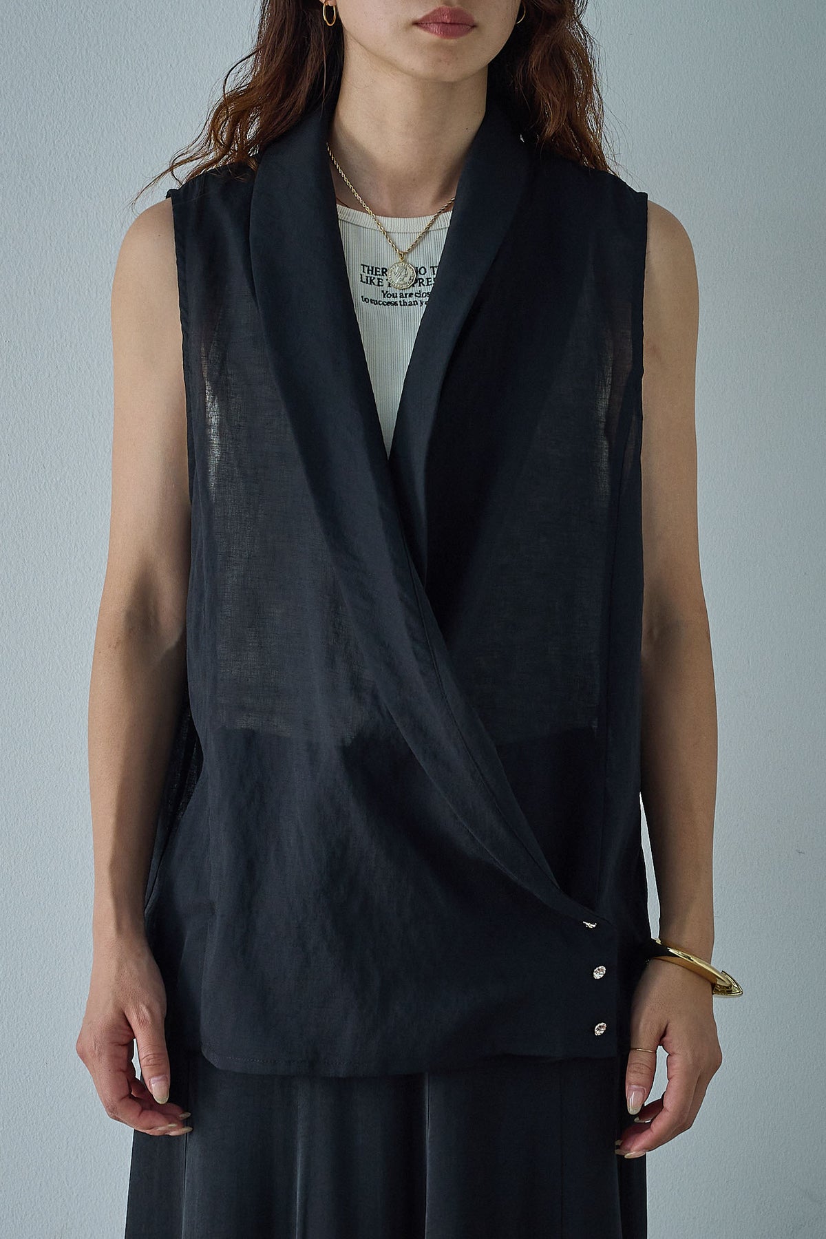こちらはカシュクールシアーベストです。シアー素材を使用し、軽やかな印象を与えるデザインで、フロントのカシュクールスタイルとボタンが特徴的です。シンプルながらも洗練されたスタイルを作り出し、合わせやすいアイテムです。