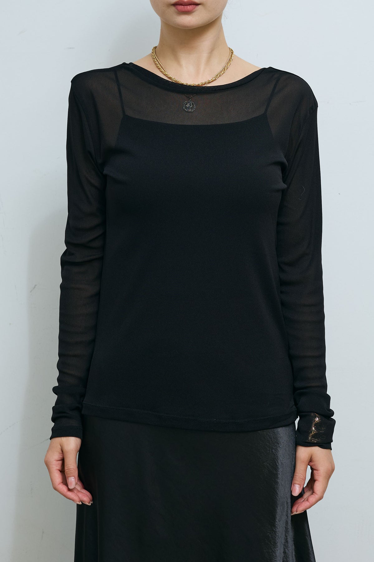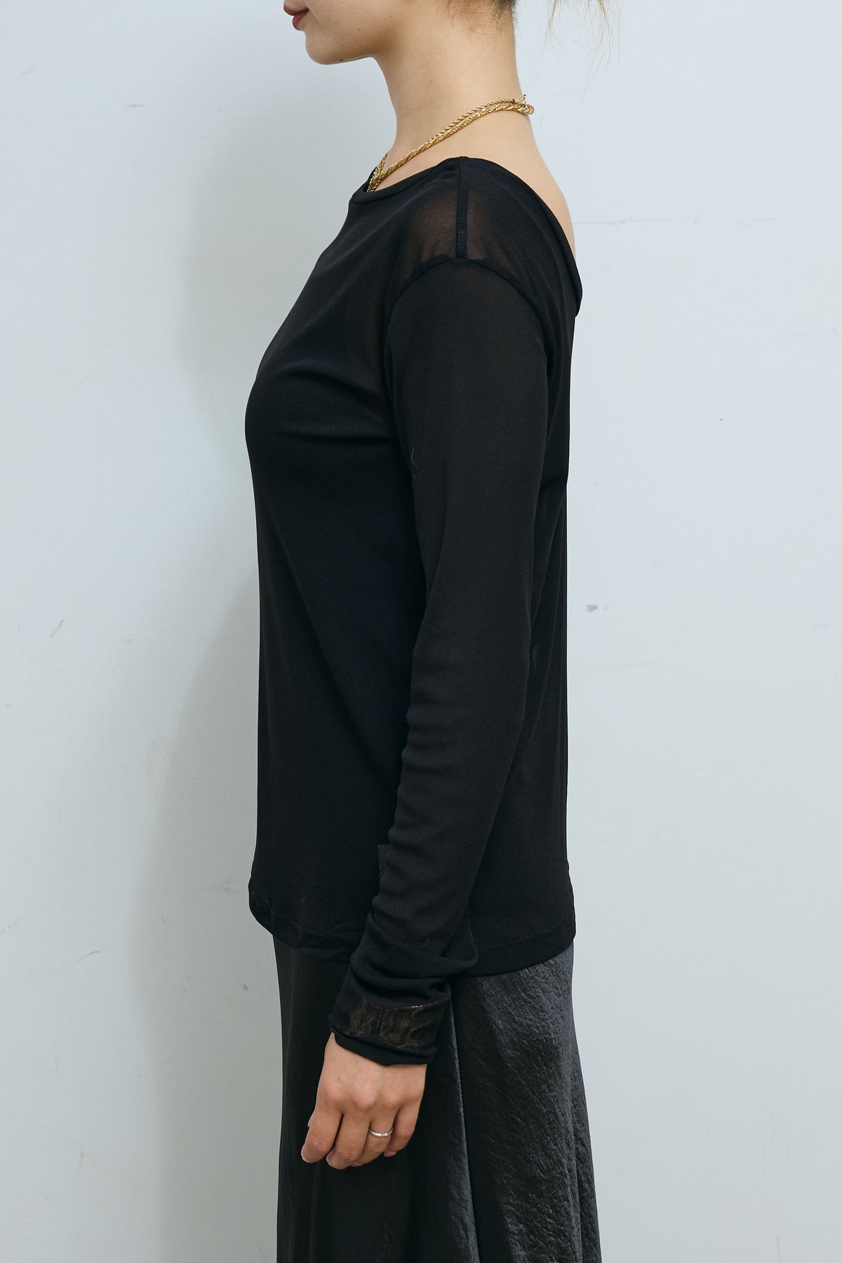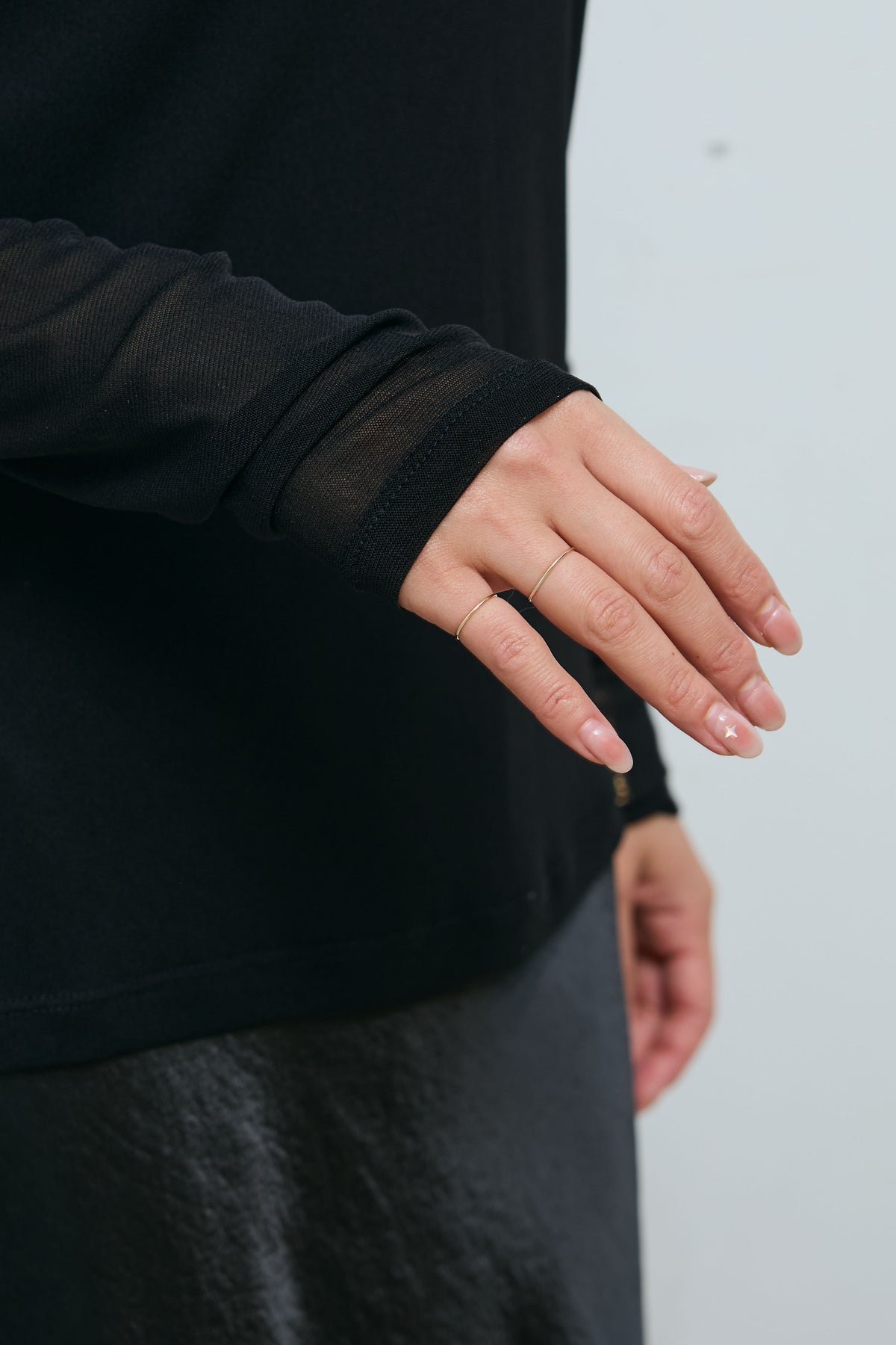 柔らかな肌触りのカットソーに、繊細なシアー素材を重ねたレイヤード風トップス。首元や袖、背中にほんのり透け感があり、シンプルながらも抜け感を演出してくれます。1枚で主役になるデザインながら、インナーやキャミワンピとのレイヤードにも活躍。程よくゆとりのあるシルエットで、カジュアルからフェミニンまで幅広く着まわせる万能アイテムです。