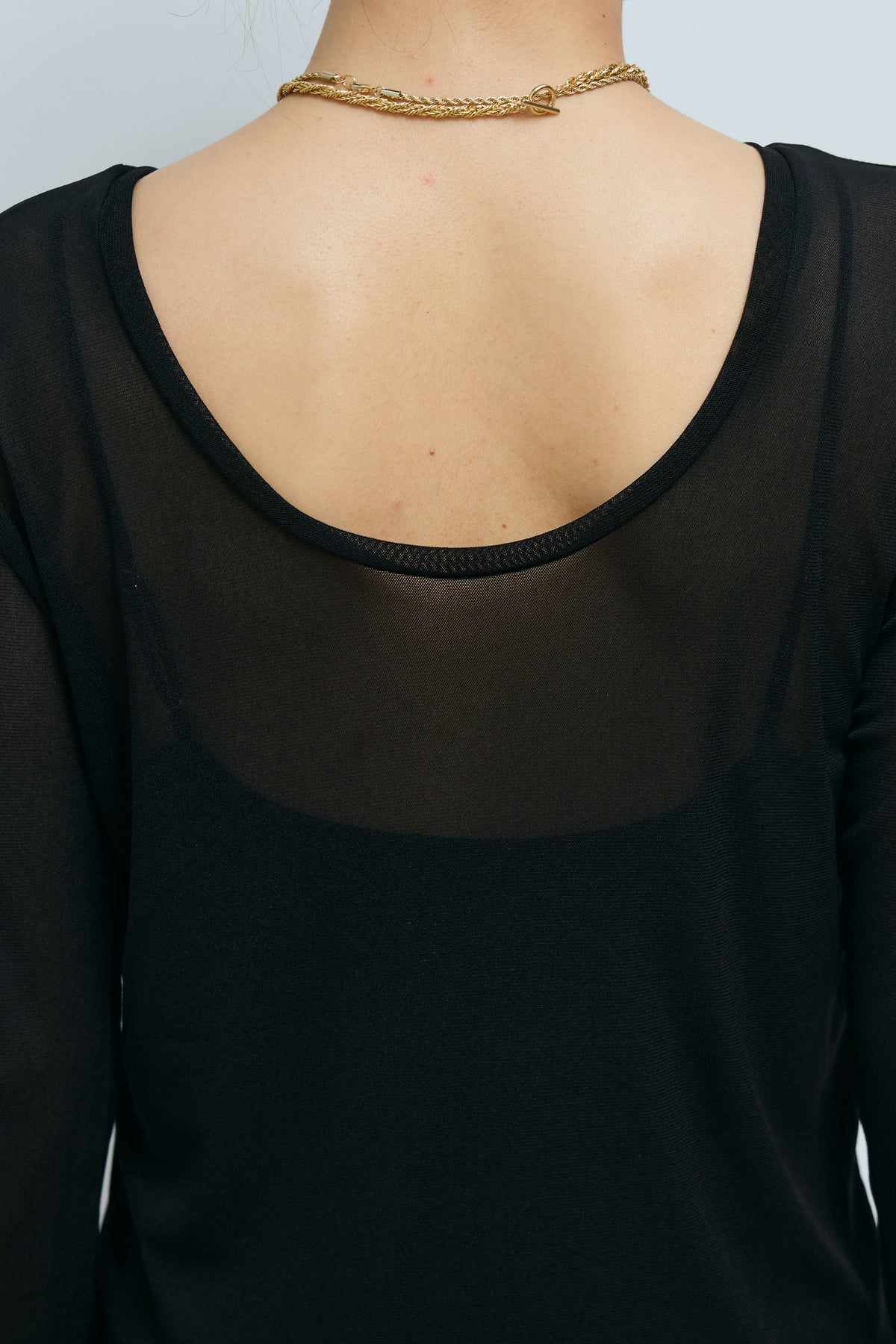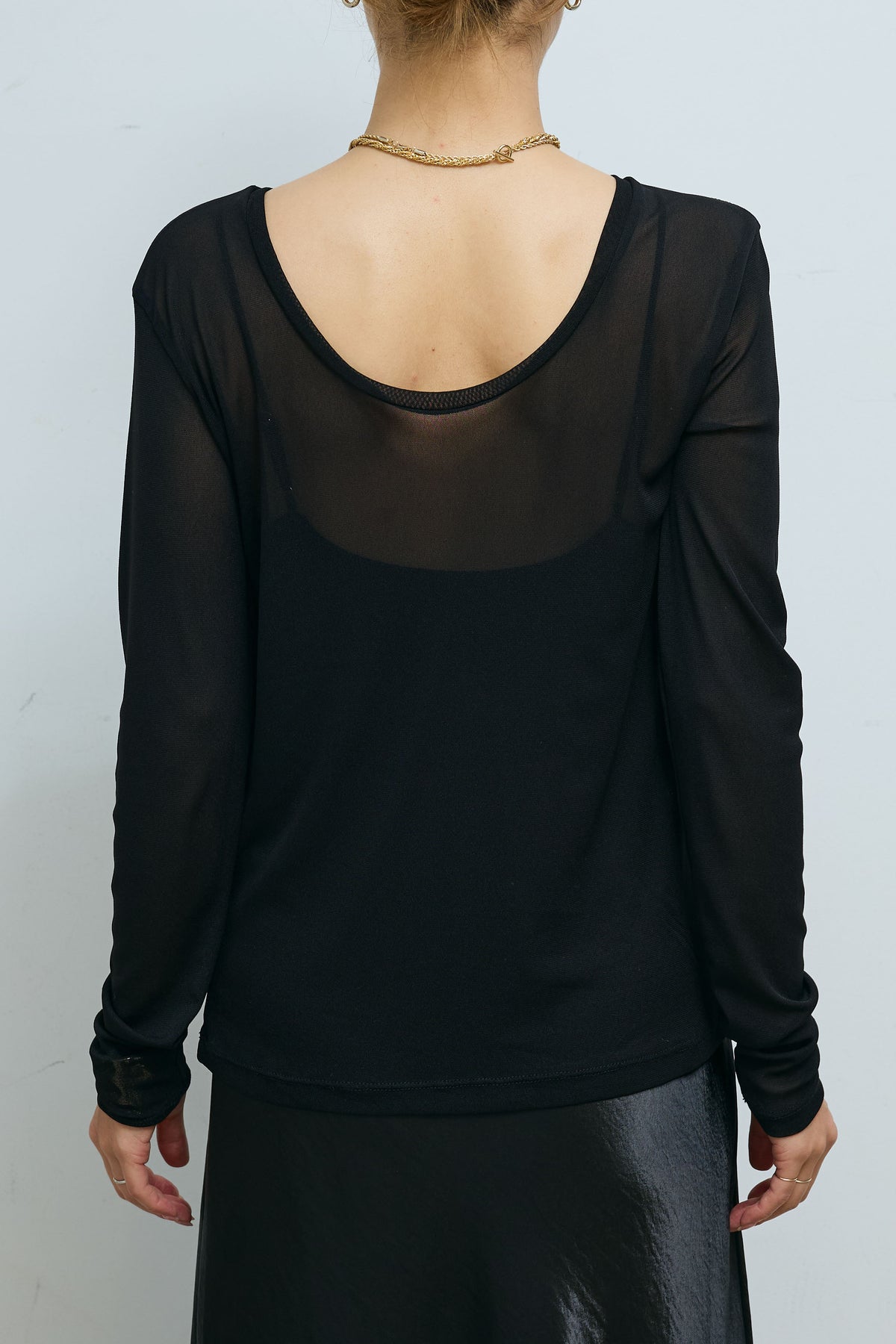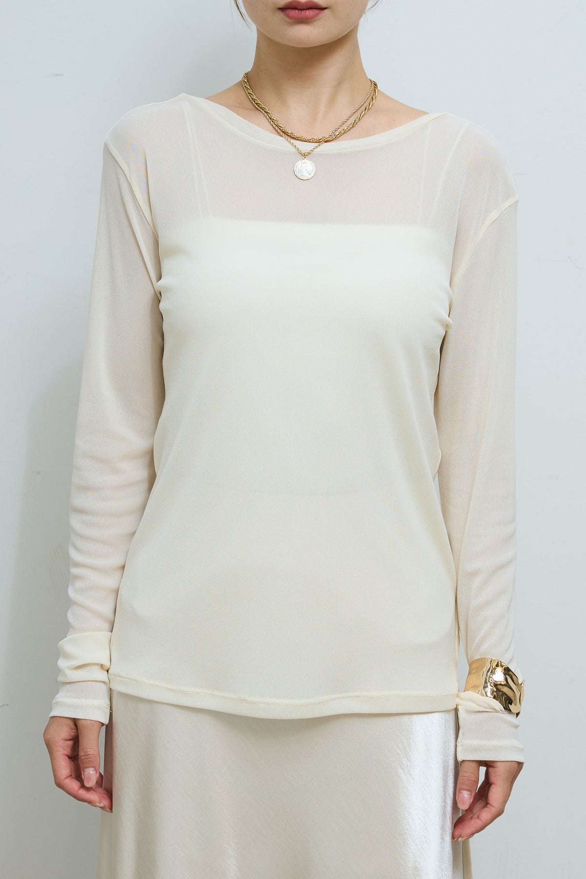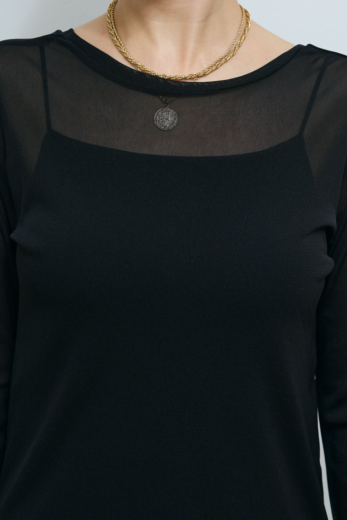 柔らかな肌触りのカットソーに、繊細なシアー素材を重ねたレイヤード風トップス。首元や袖、背中にほんのり透け感があり、シンプルながらも抜け感を演出してくれます。1枚で主役になるデザインながら、インナーやキャミワンピとのレイヤードにも活躍。程よくゆとりのあるシルエットで、カジュアルからフェミニンまで幅広く着まわせる万能アイテムです。