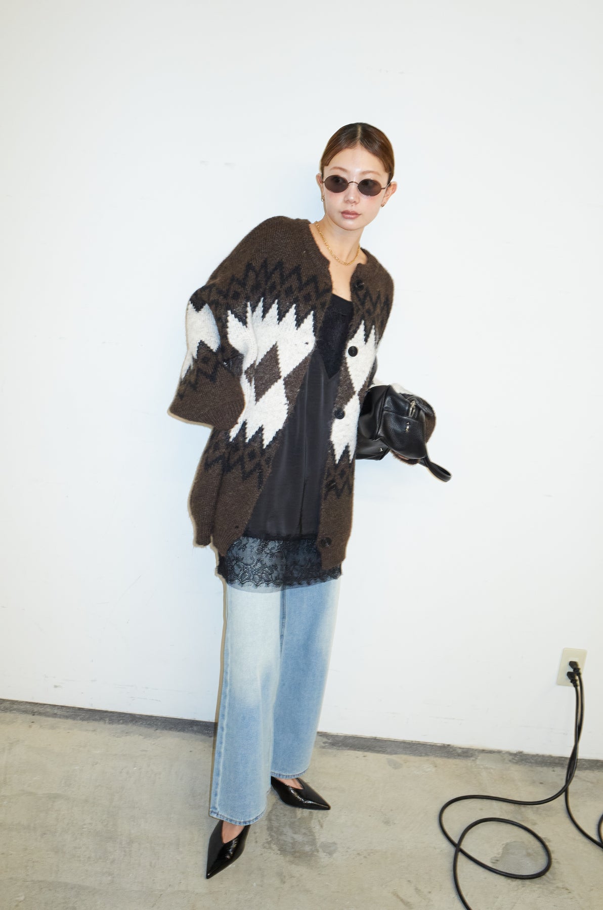 [予約/SET]ネイティブ柄オーバーカーディガン+ウエスト切り替えストレートデニム(2set)