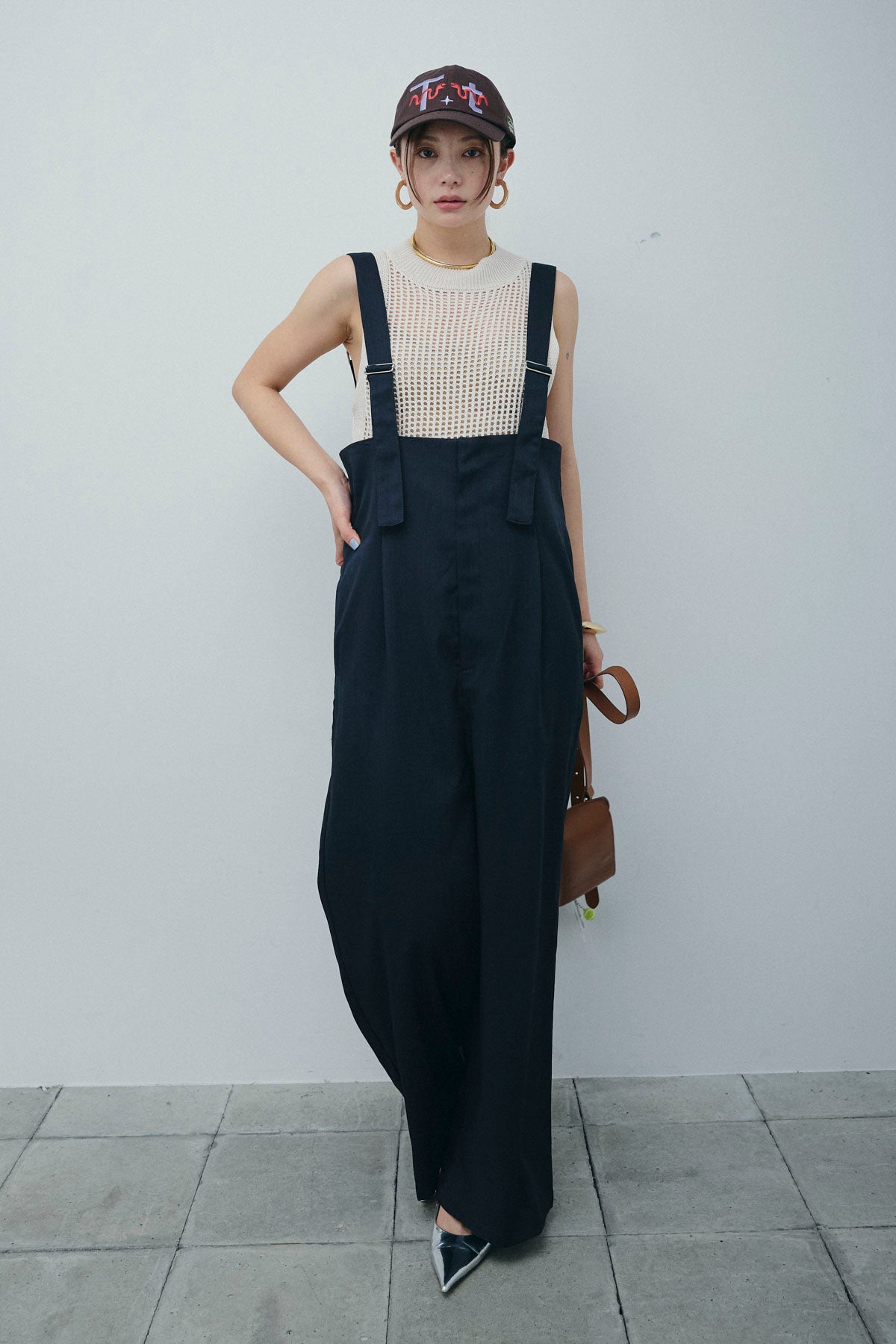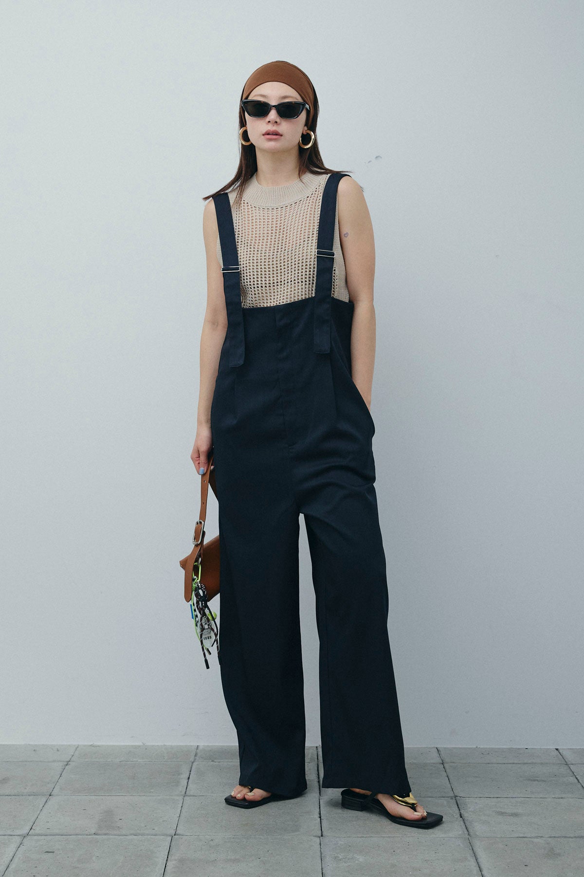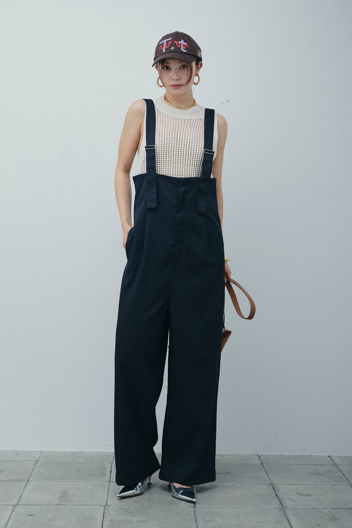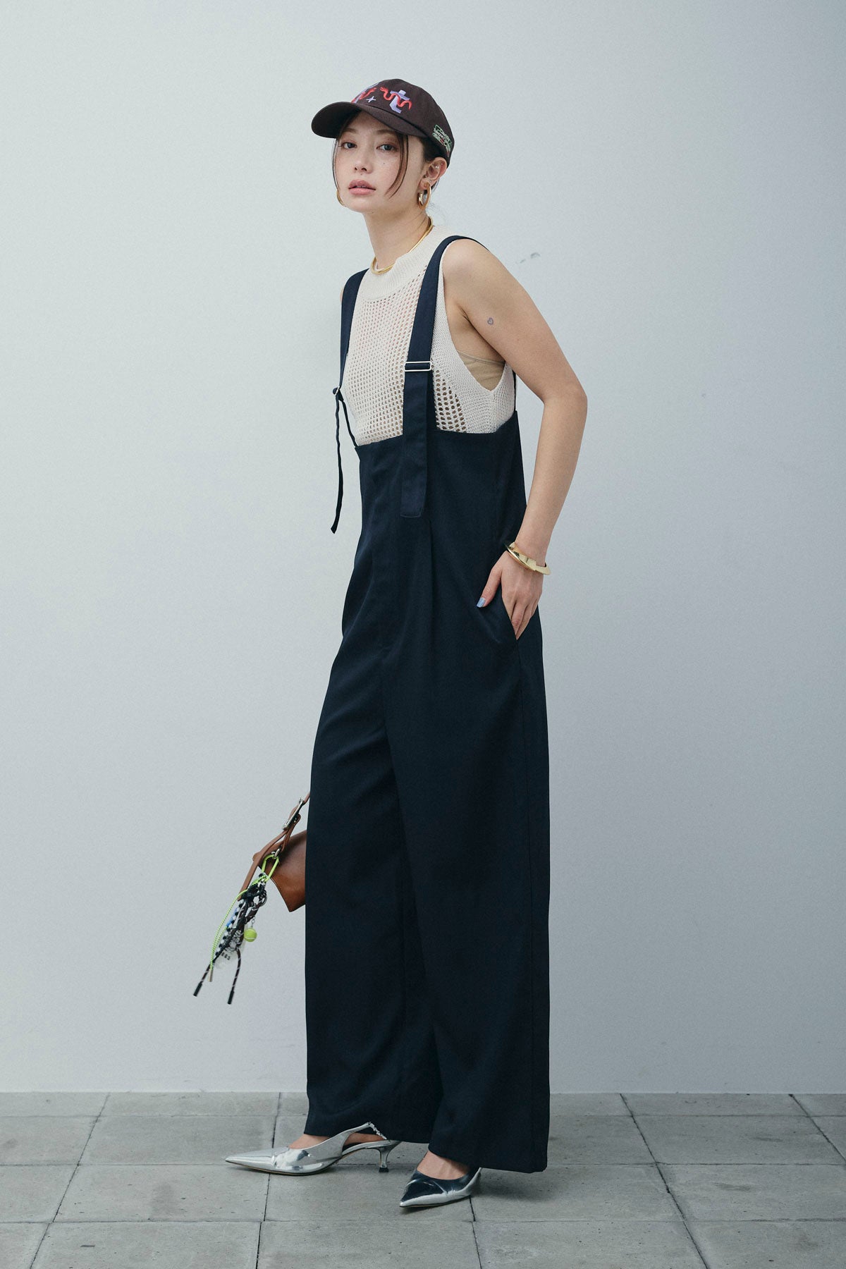 [予約/SET]フィッシュネットノースリーブニット+ハイウエストワイドサロペット(2set)