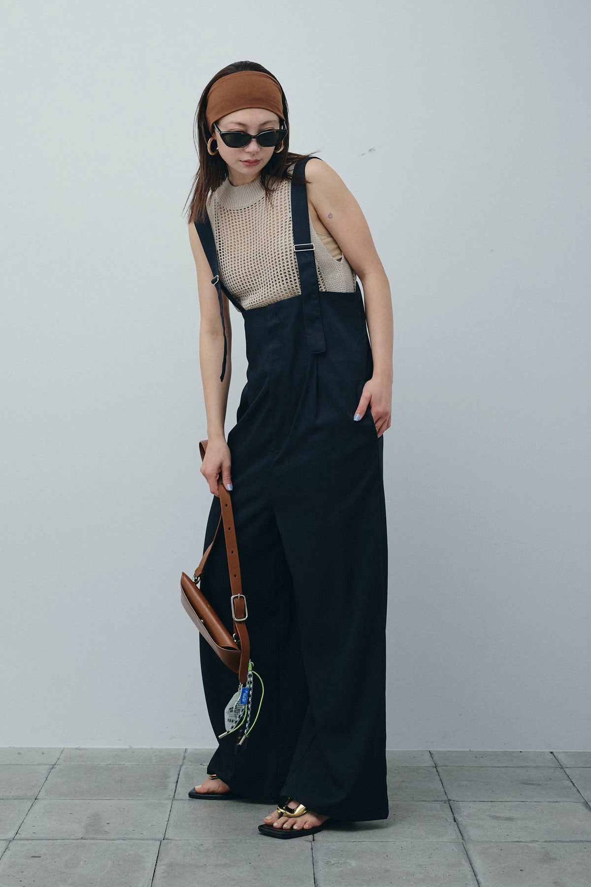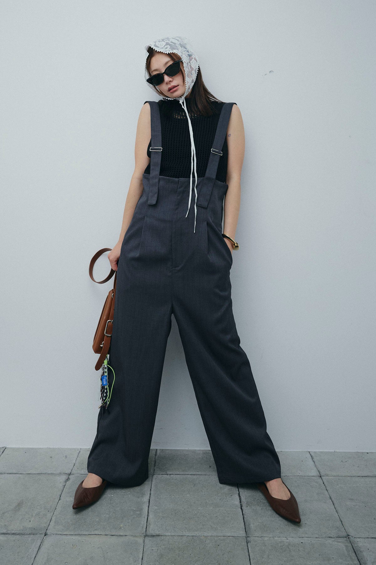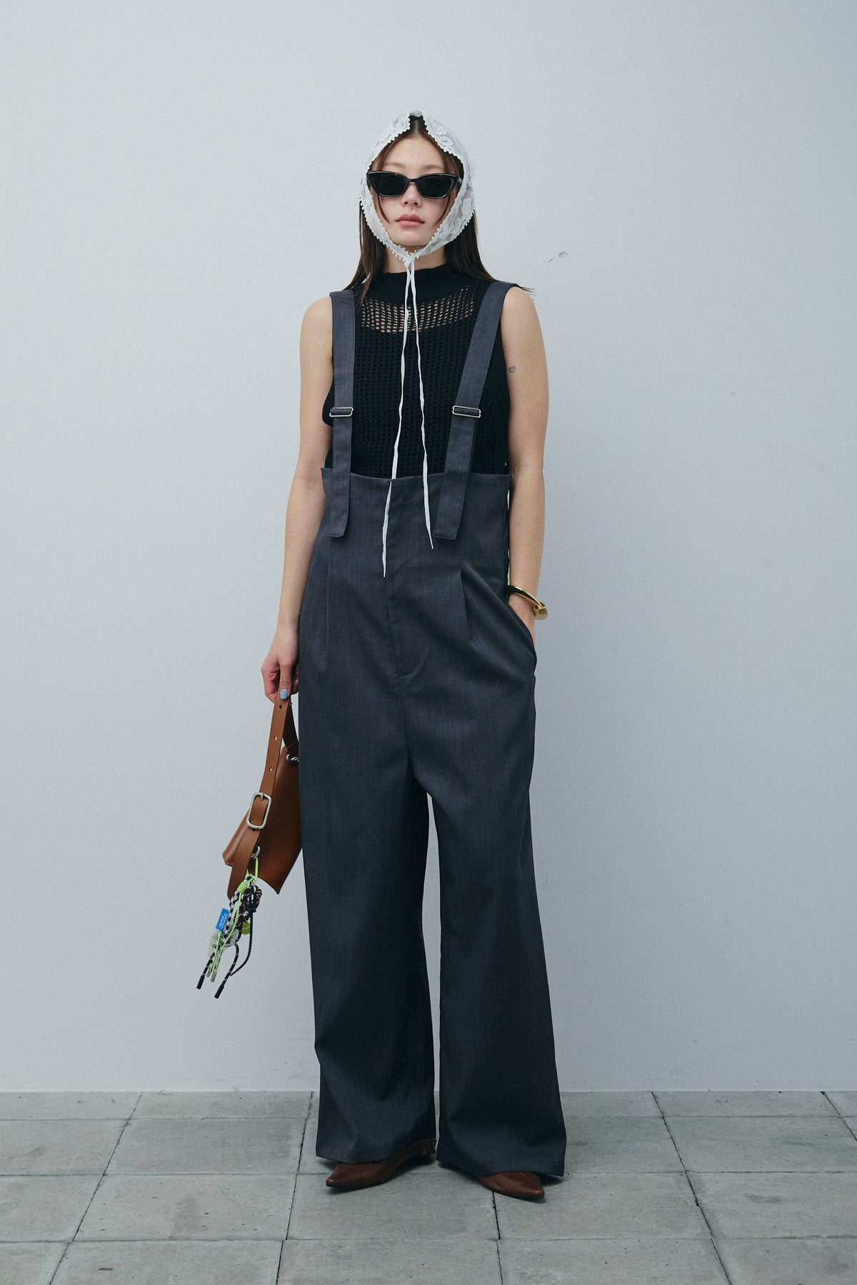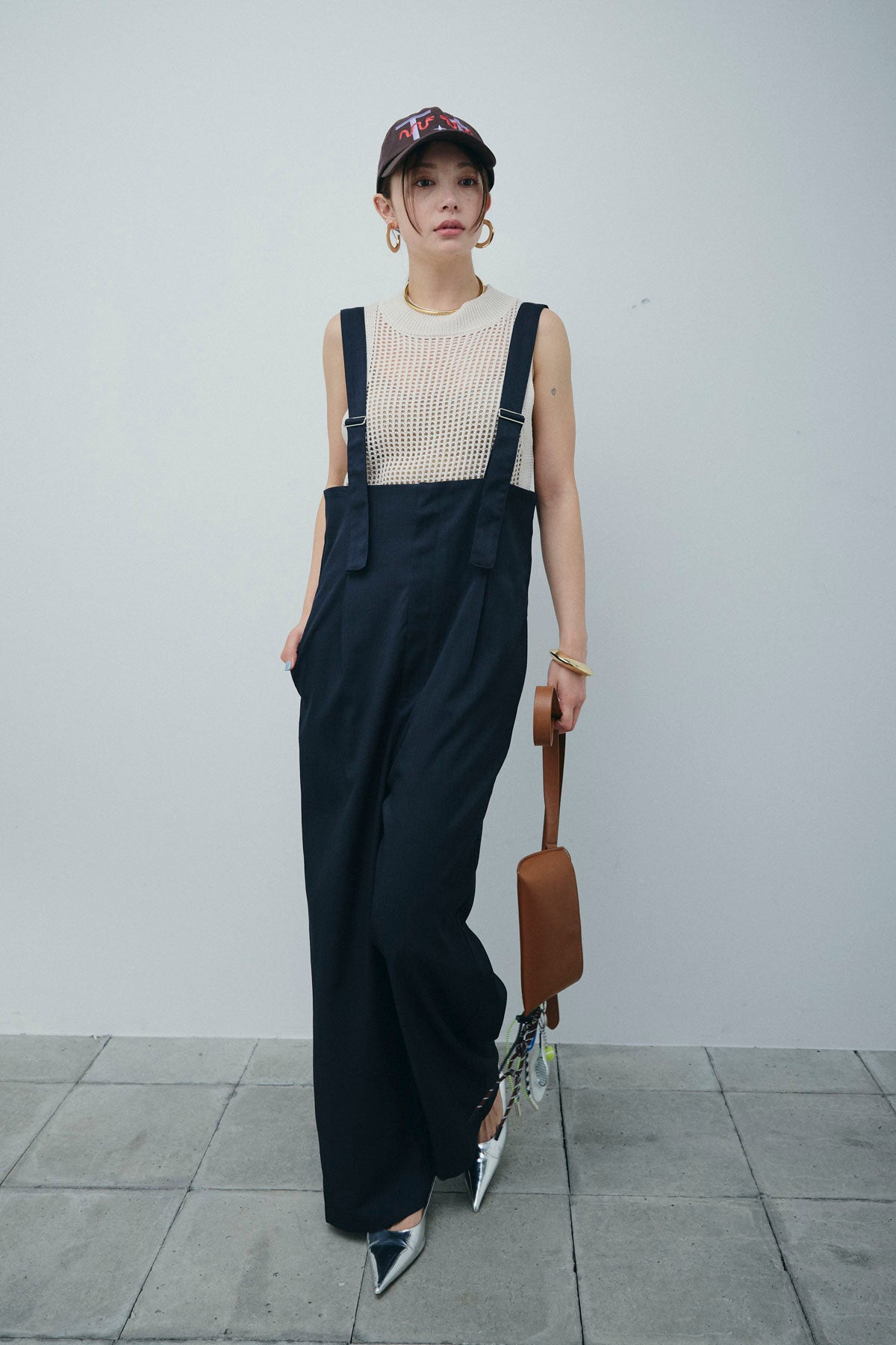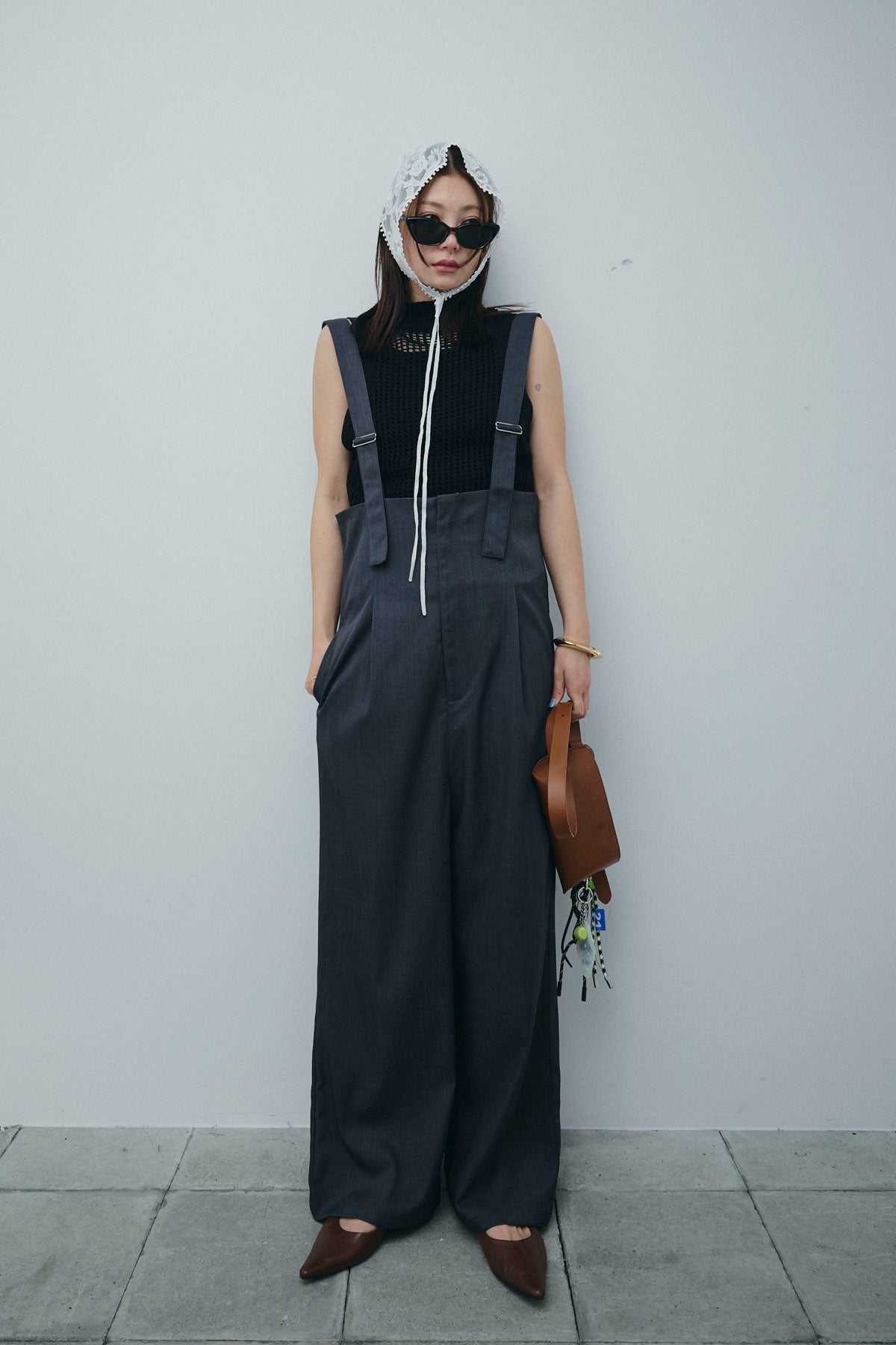 [予約/SET]フィッシュネットノースリーブニット+ハイウエストワイドサロペット(2set)