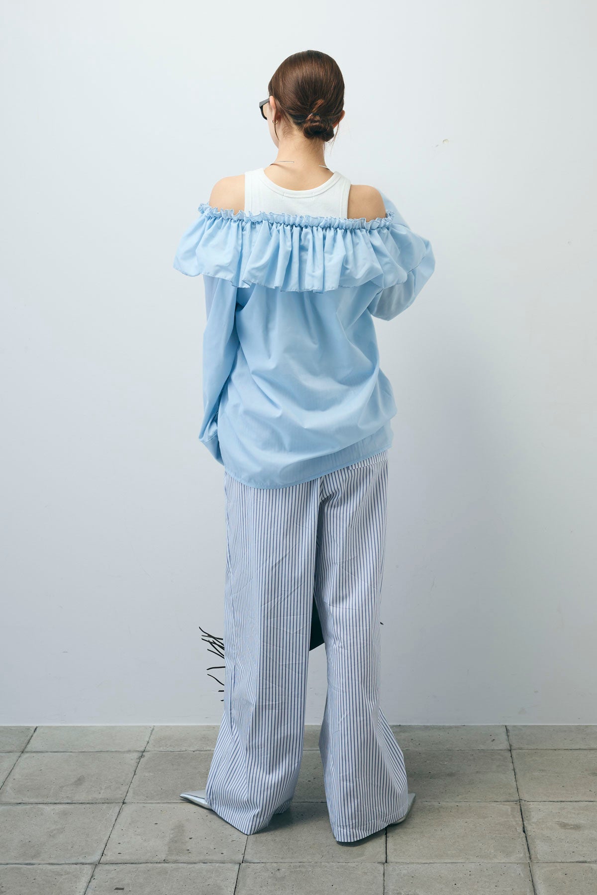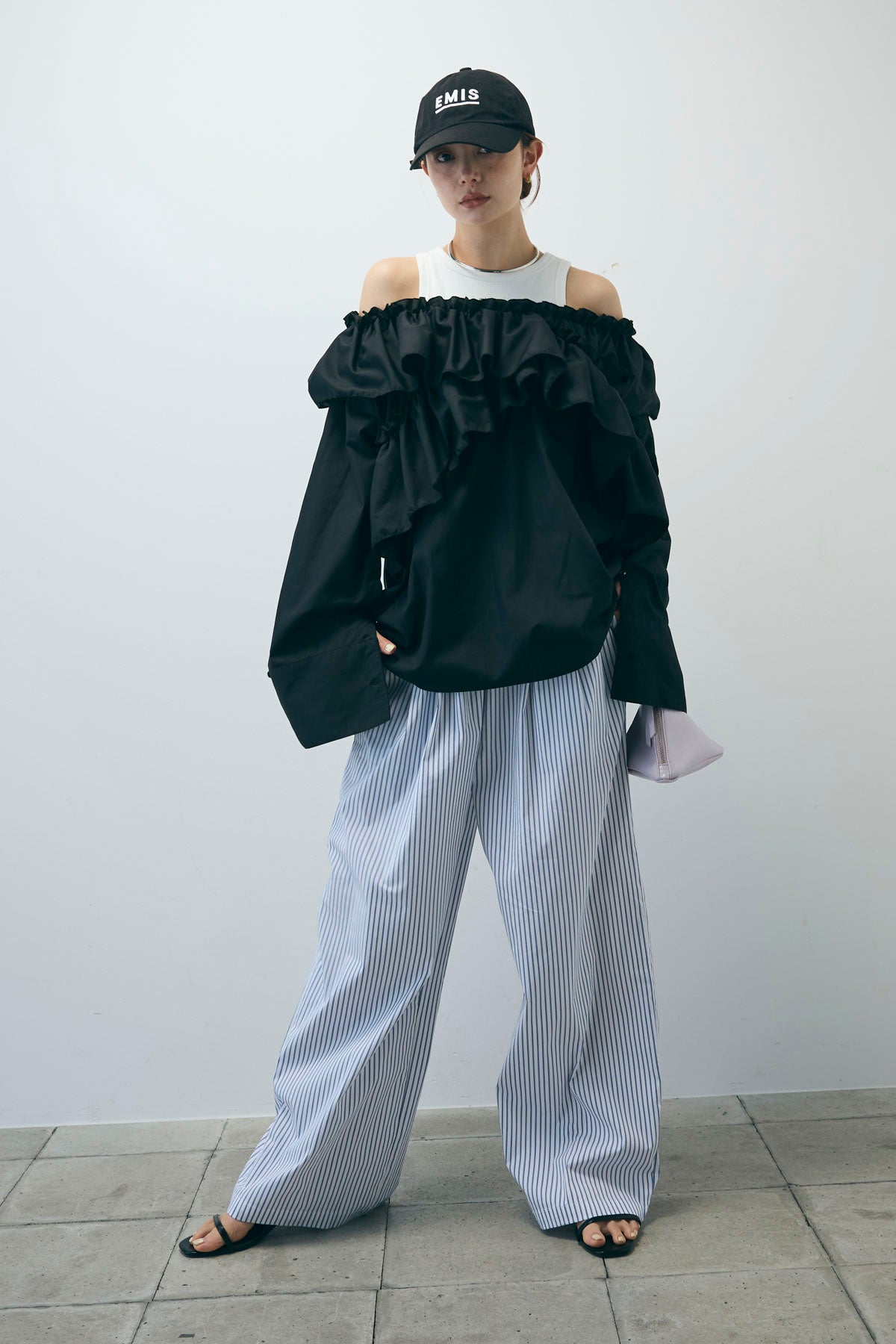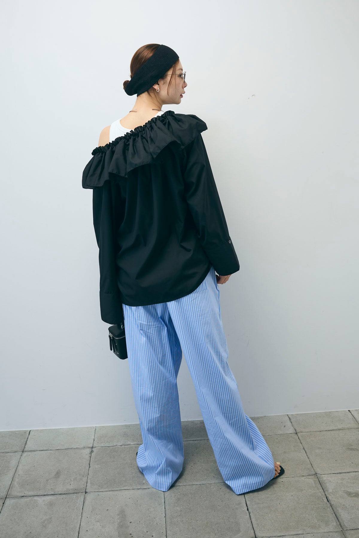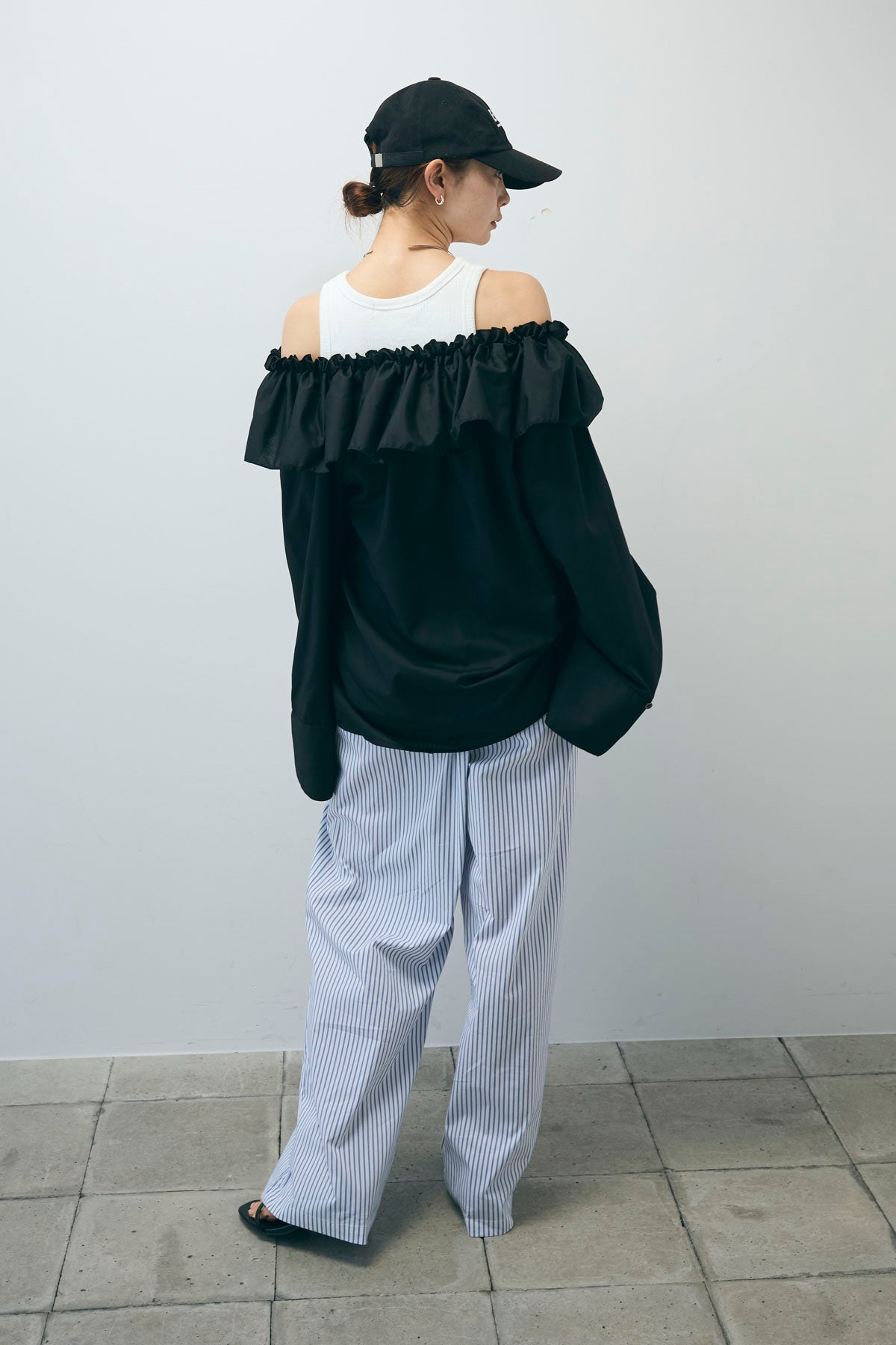 [予約/SET]TCブロード2wayフリルオフショルブラウス+ストライプ イージー ワイド パンツ(2set)