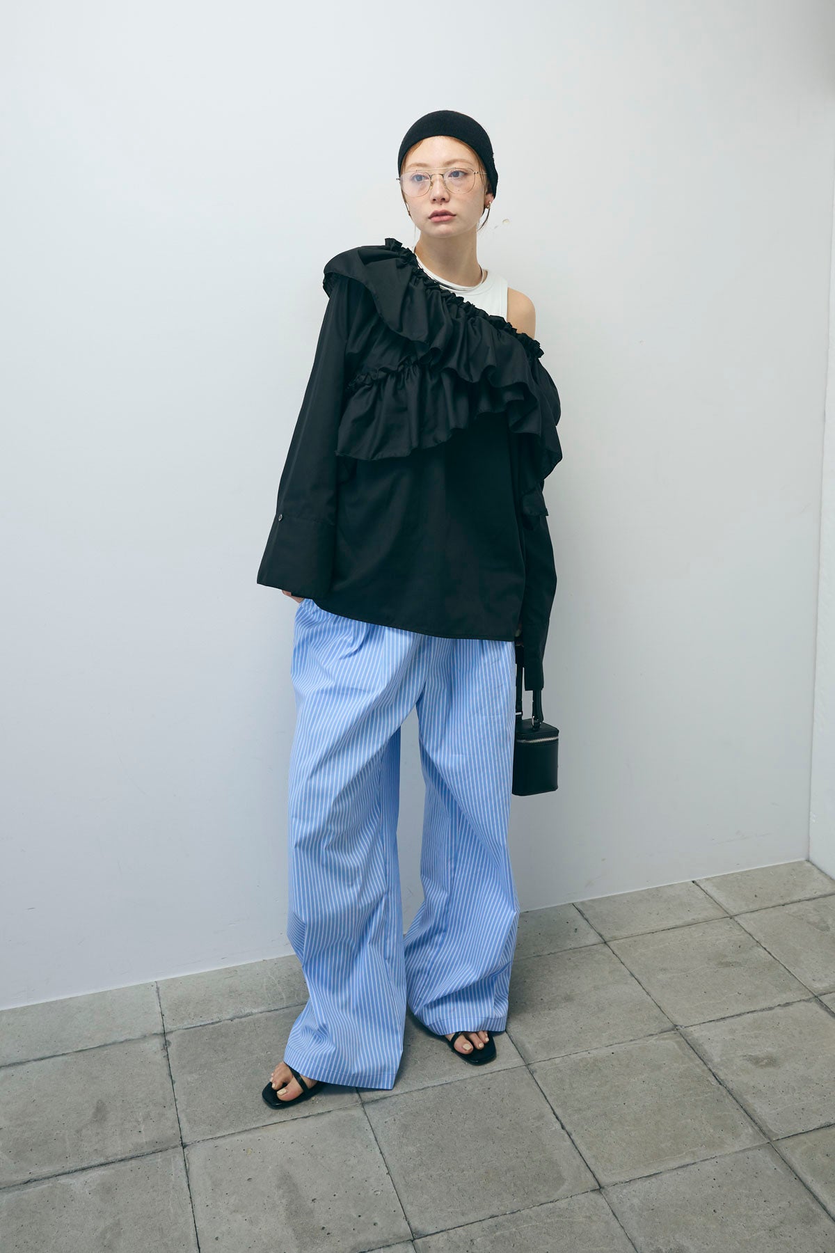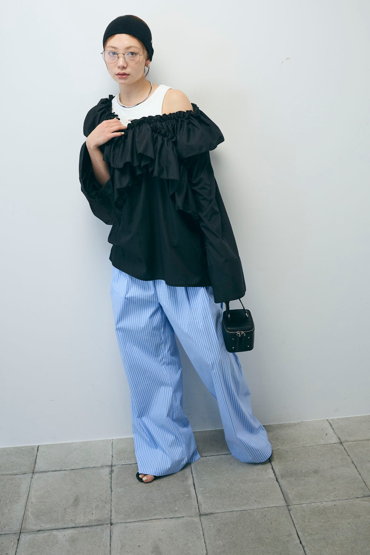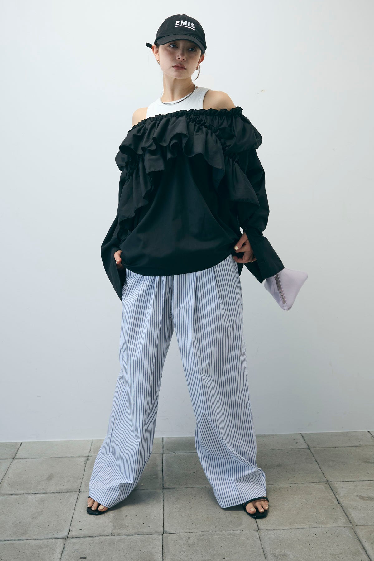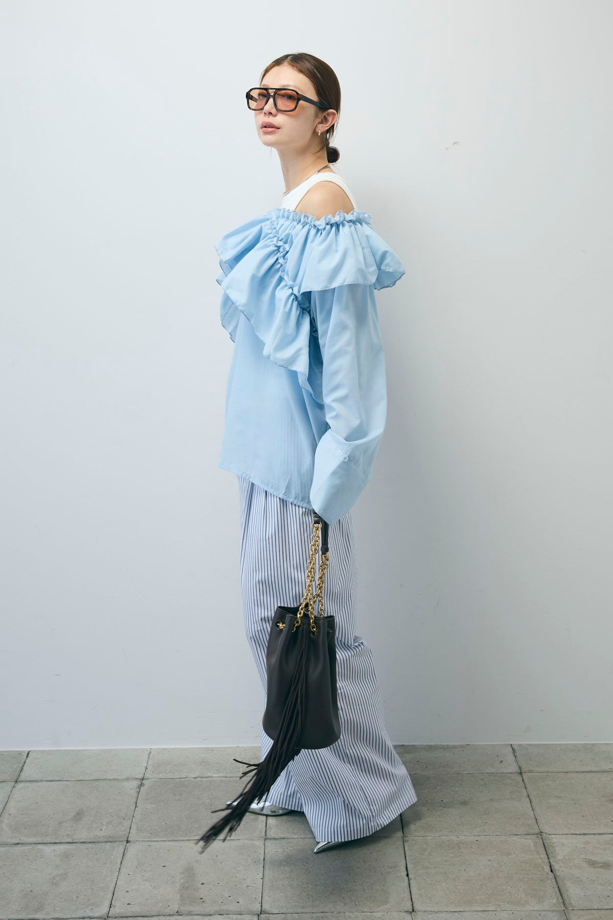 [予約/SET]TCブロード2wayフリルオフショルブラウス+ストライプ イージー ワイド パンツ(2set)