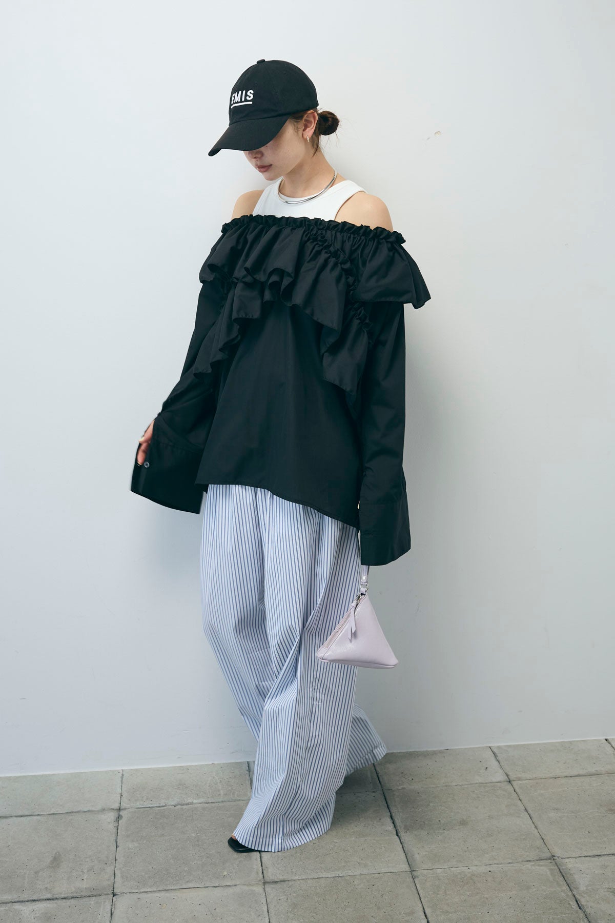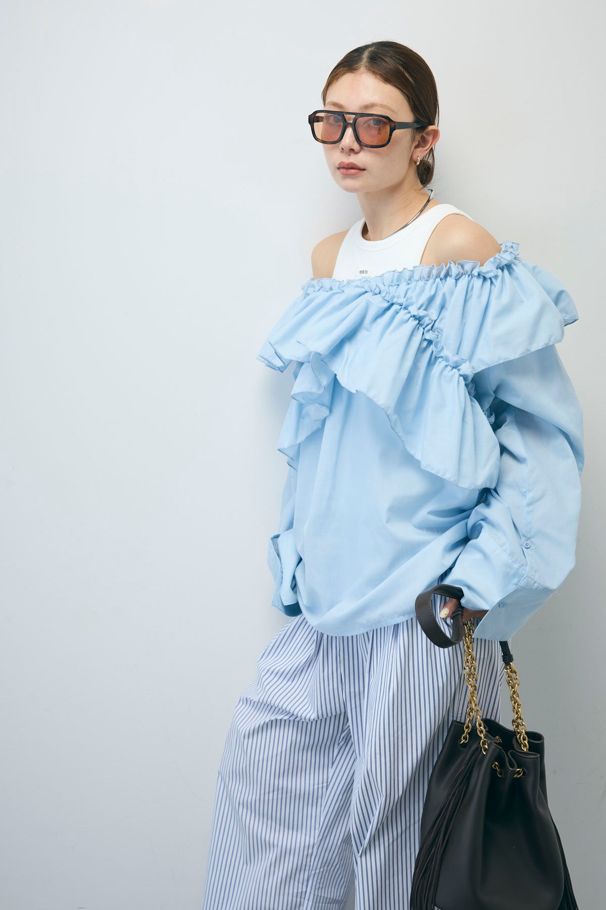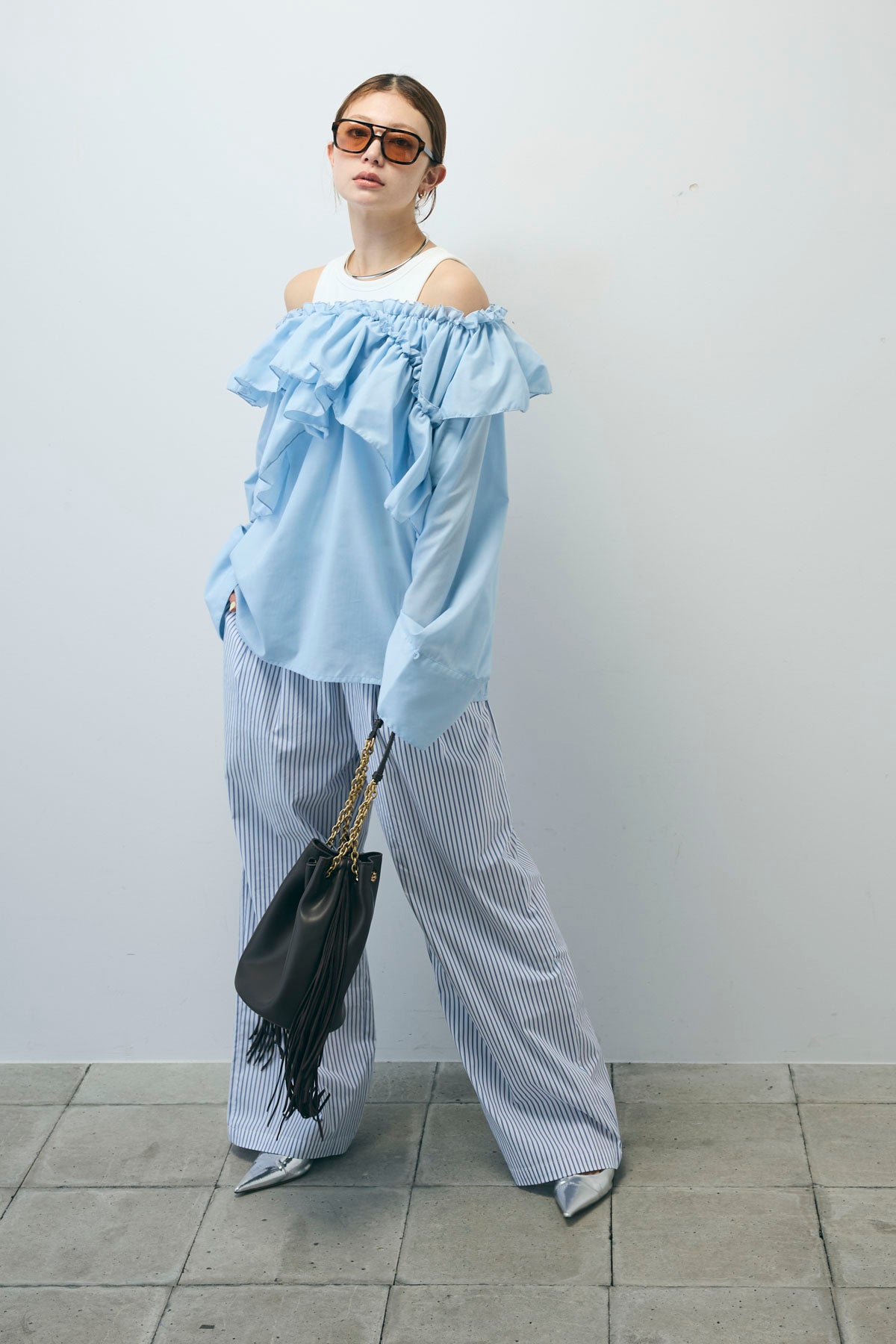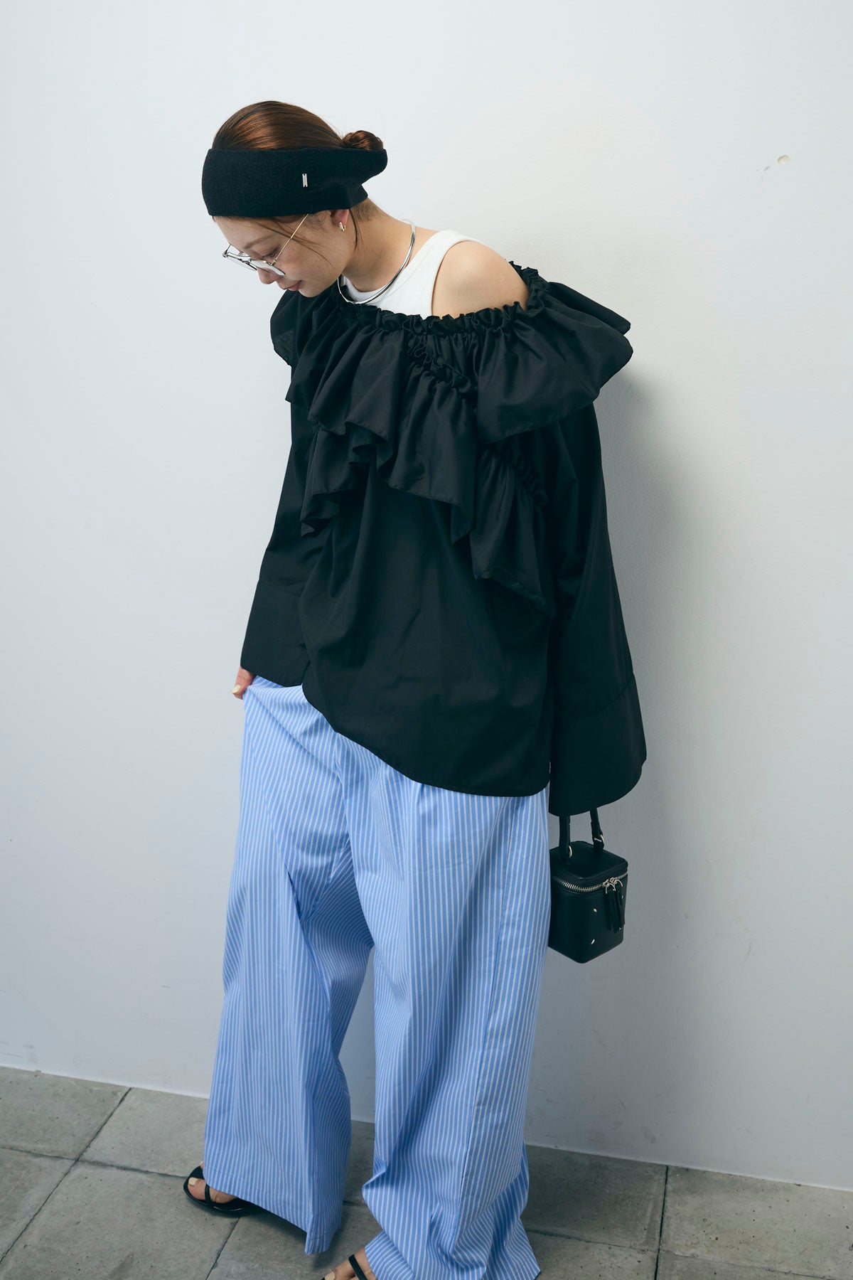 [予約/SET]TCブロード2wayフリルオフショルブラウス+ストライプ イージー ワイド パンツ(2set)