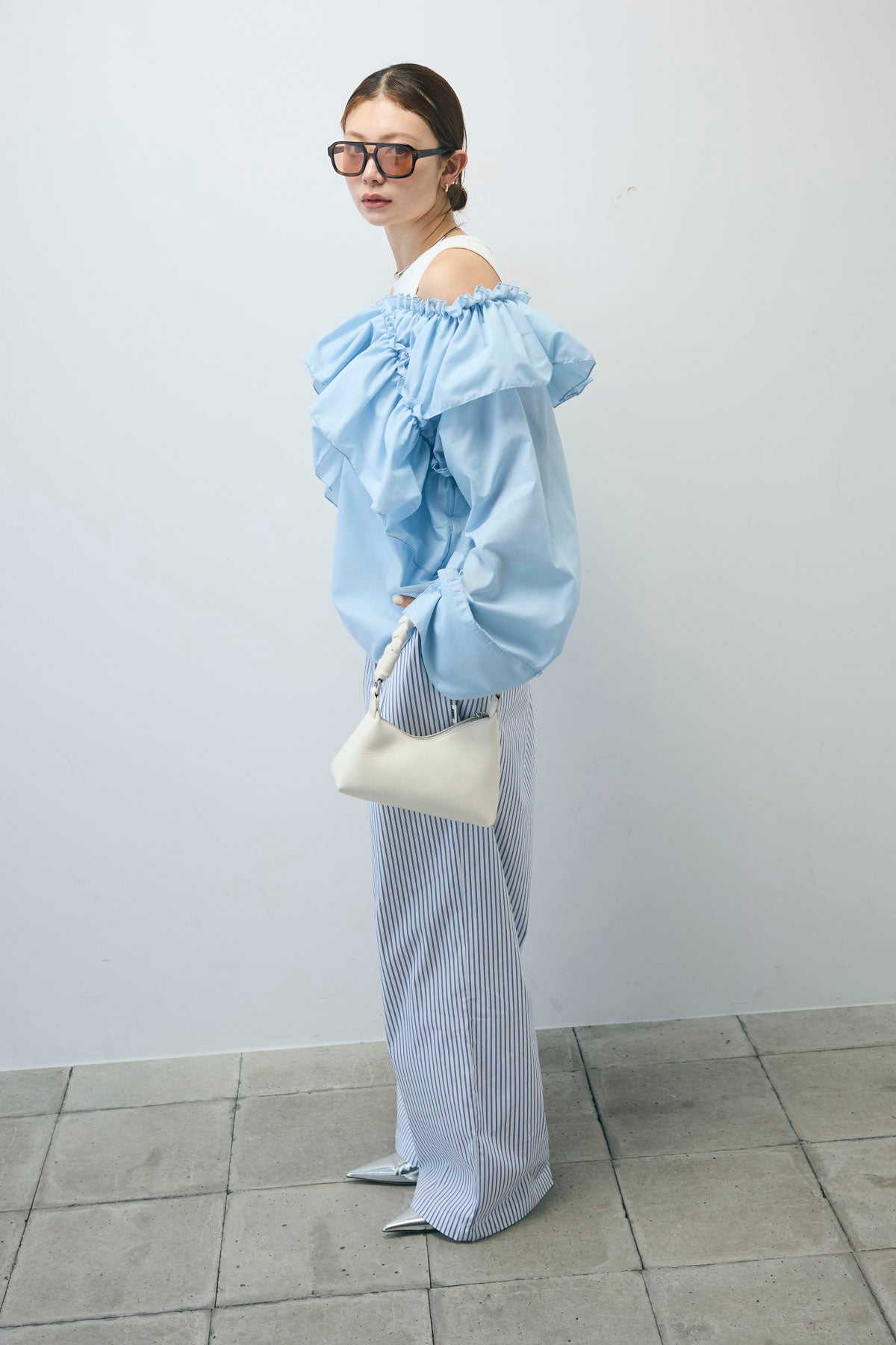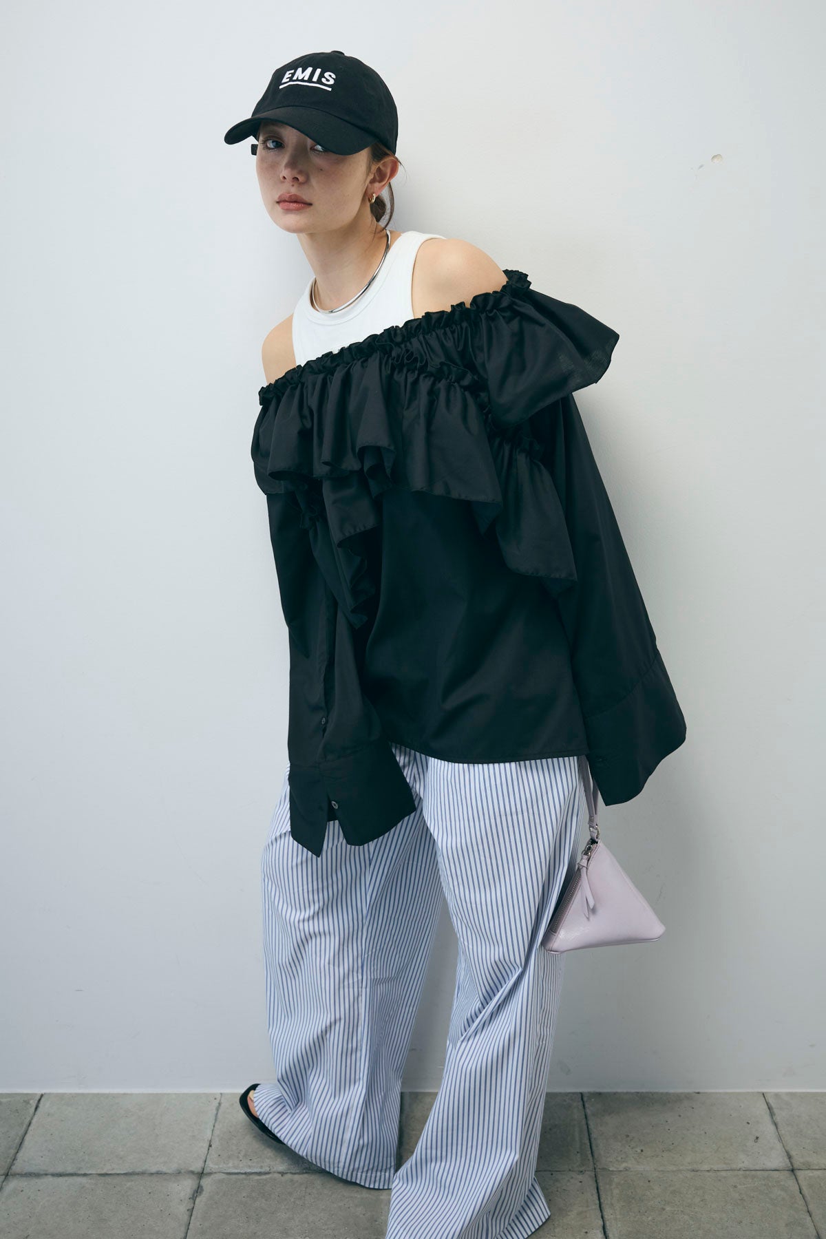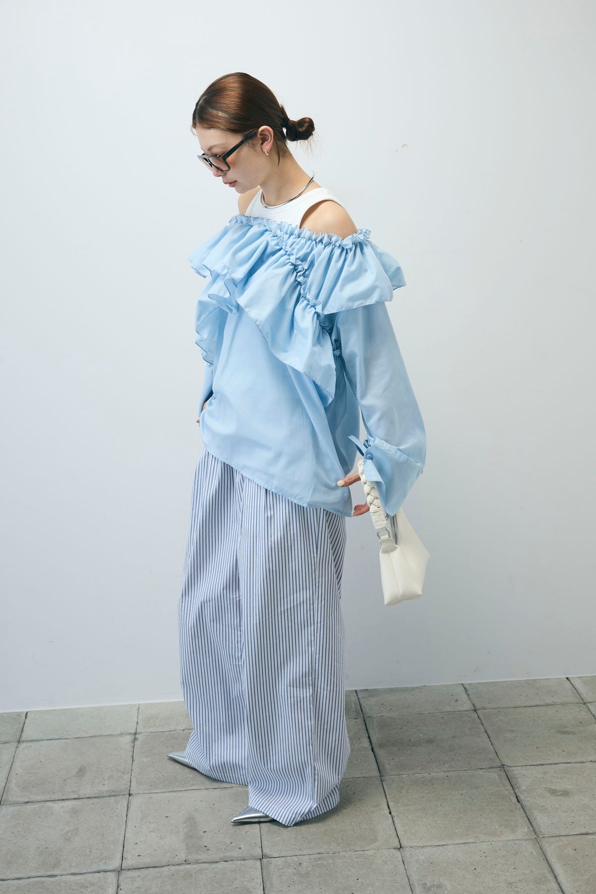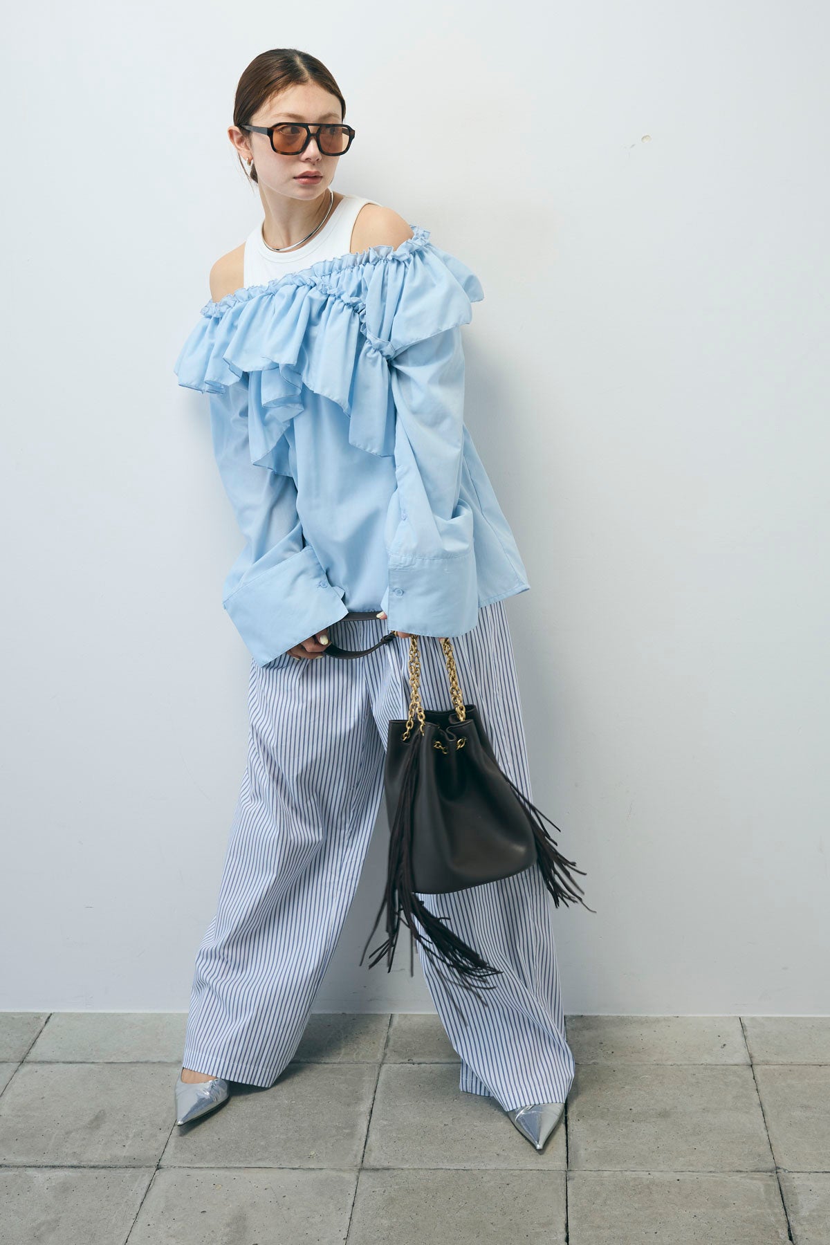 [予約/SET]TCブロード2wayフリルオフショルブラウス+ストライプ イージー ワイド パンツ(2set)