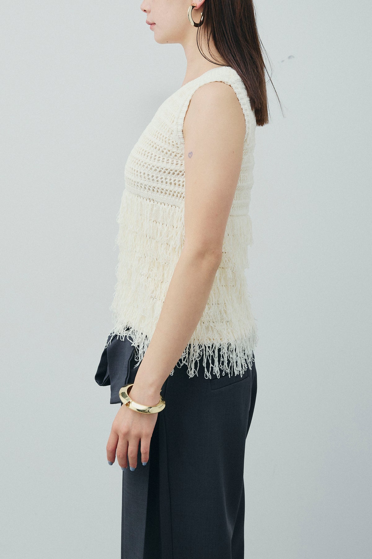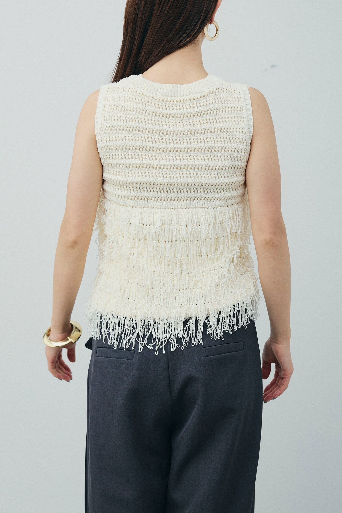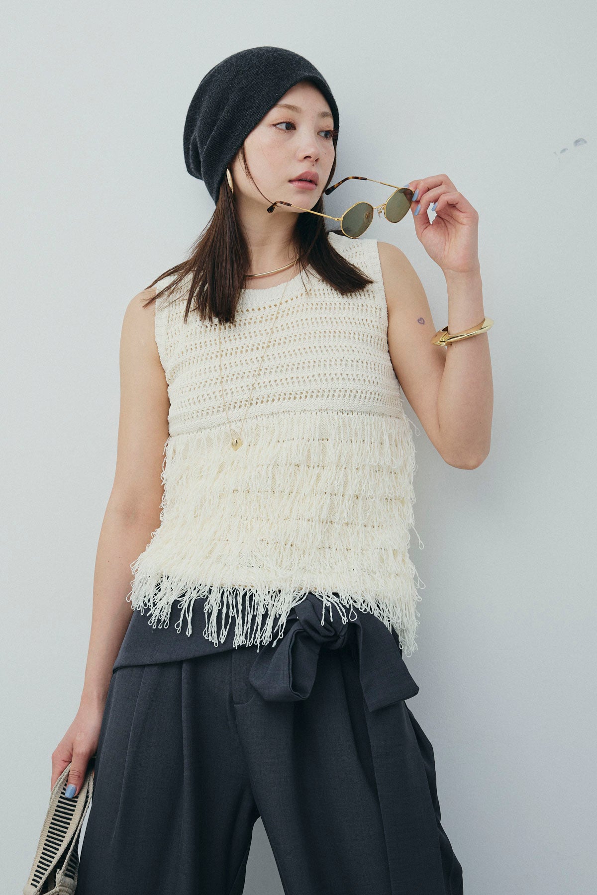 動くたびに揺れるフリンジが印象的なニットタンク。 繊細な透かし編みに大胆なフリンジをあしらったデザインで、シンプルながらも存在感のある一枚です。ニット素材ならではのナチュラルな風合いと、ほどよい肌見せが涼しげな印象をプラス。1枚での着用はもちろん、ジャケットやシャツのインナーとしても映え、レイヤードスタイルにも活躍します。春夏シーズンの着こなしに軽やかさを添える主役トップスです。