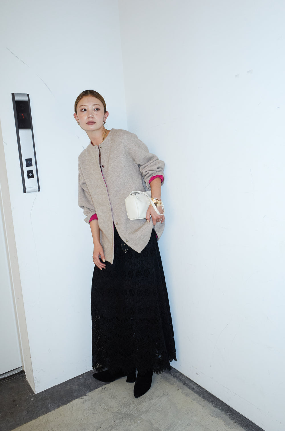 [予約/SET]ボア襟ジップブルゾン+ループ付きミニフェザーニット+レース刺繍ロングスカート(3set)