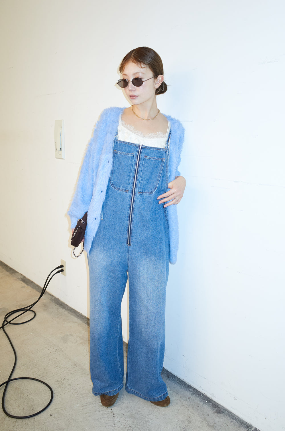 [予約/SET]起毛シャギーカーディガン+フロントジップストラップデザインデニムサロペット(2set)