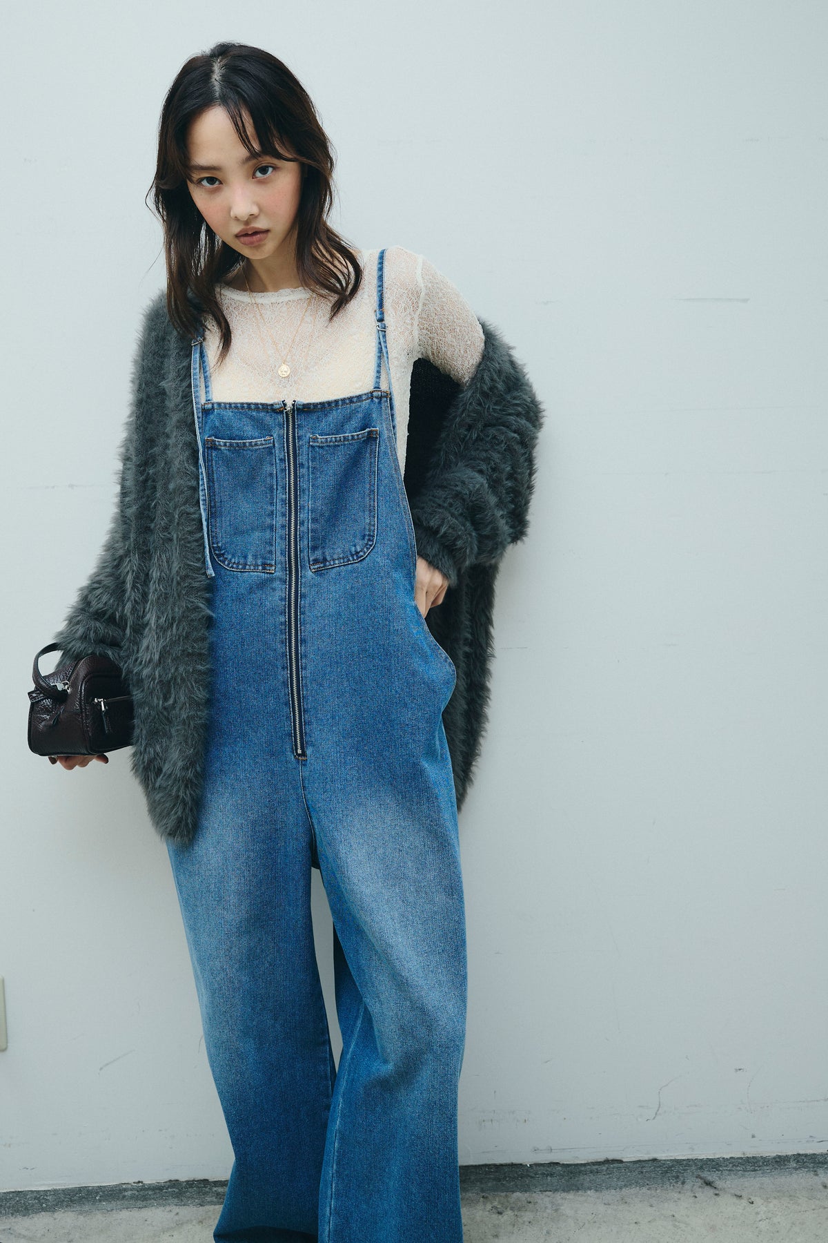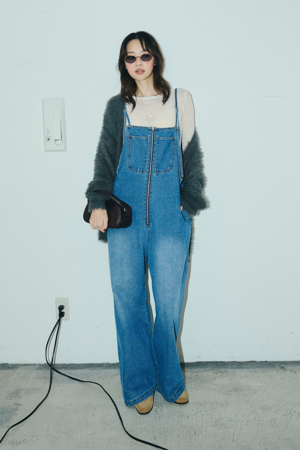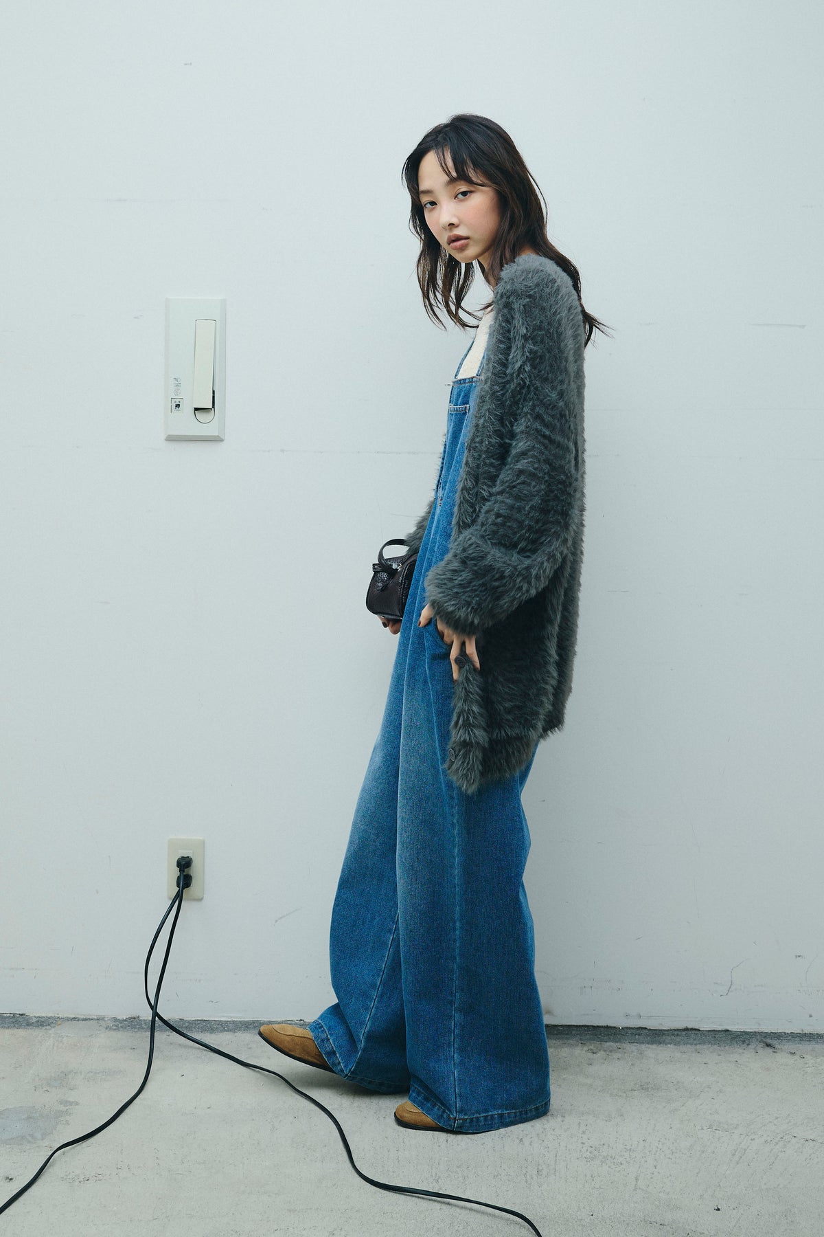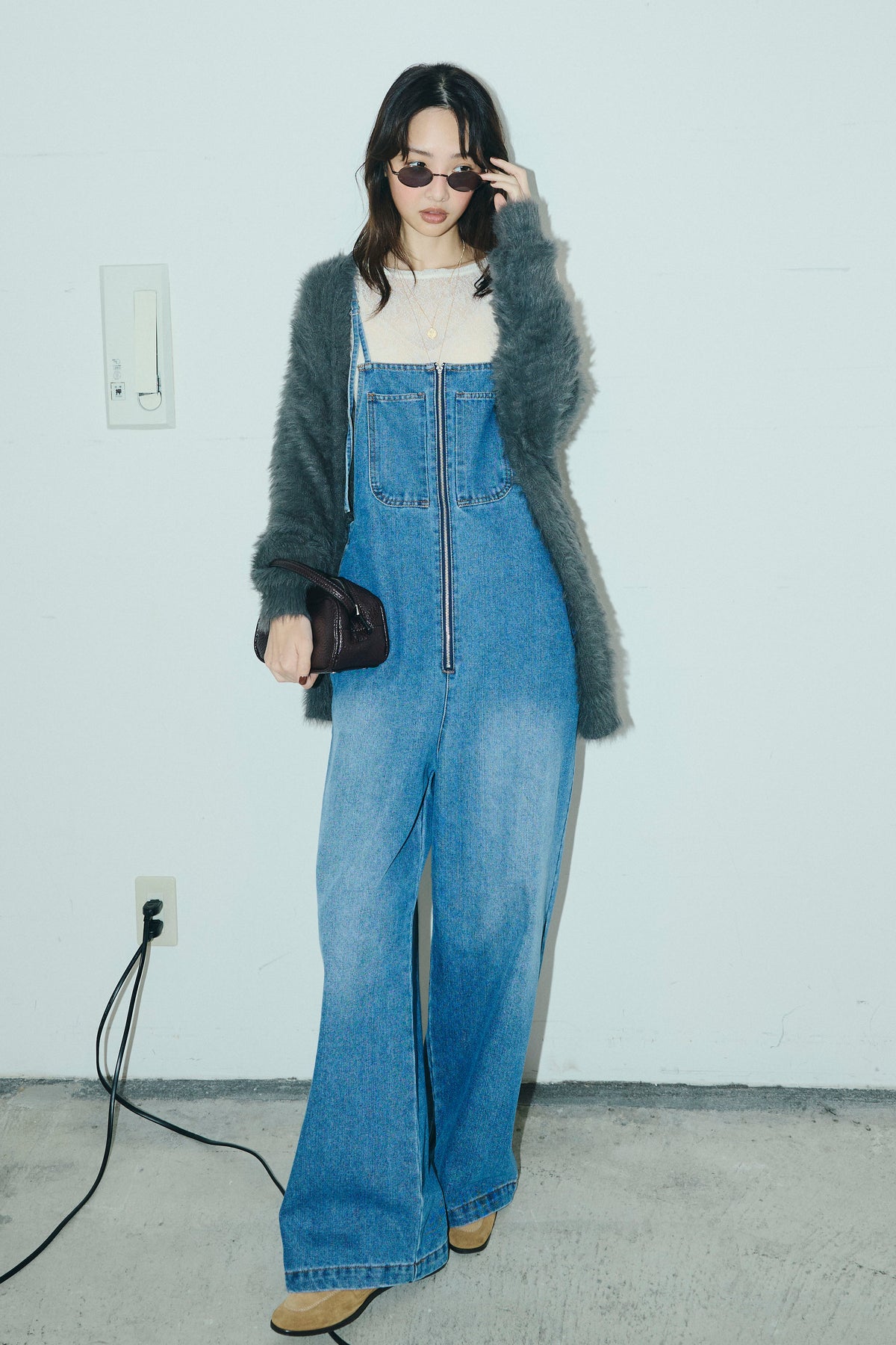 [予約/SET]起毛シャギーカーディガン+フロントジップストラップデザインデニムサロペット(2set)