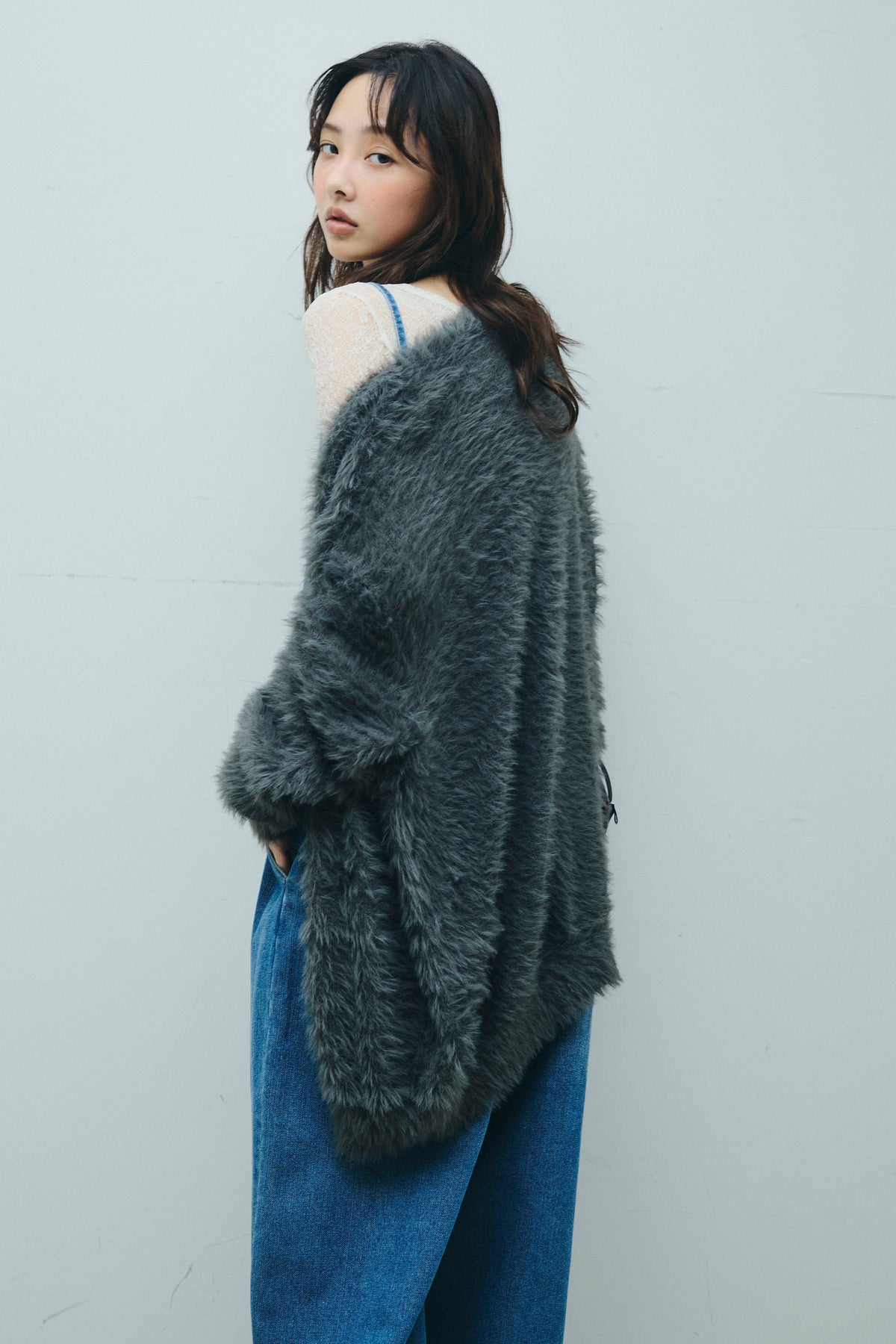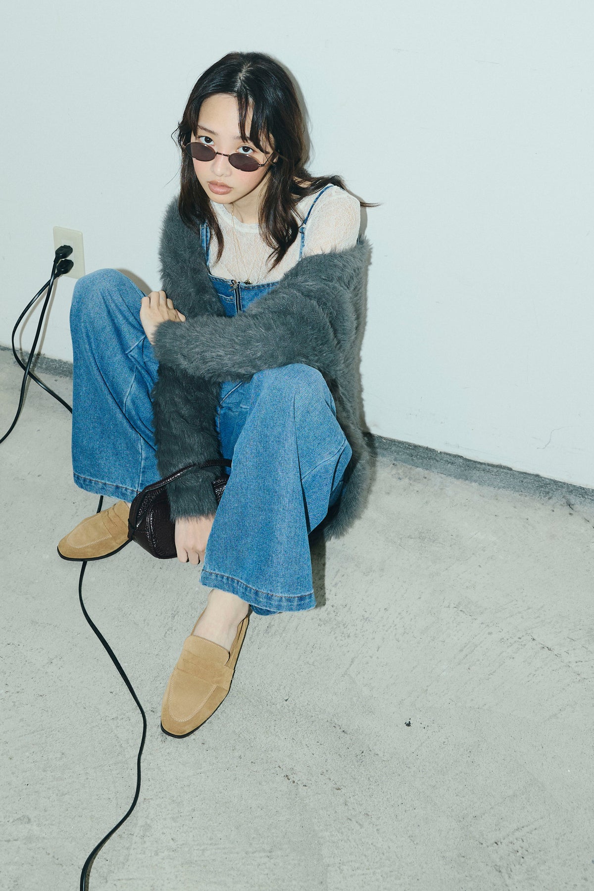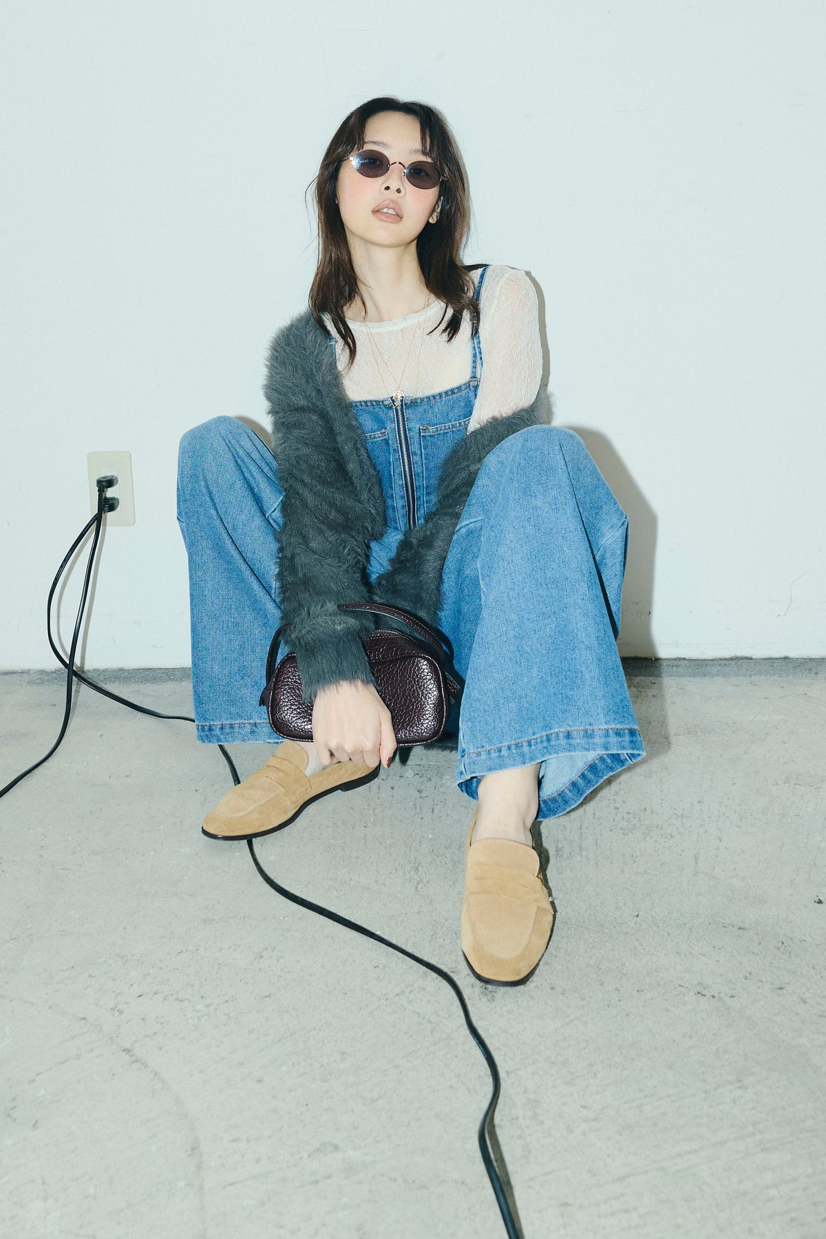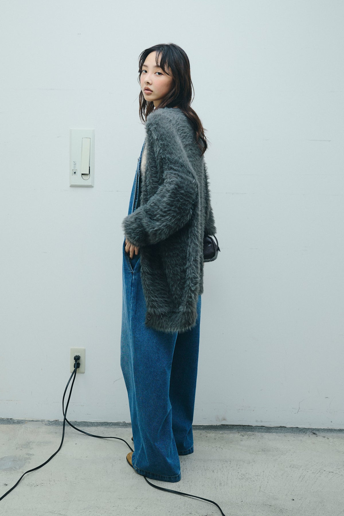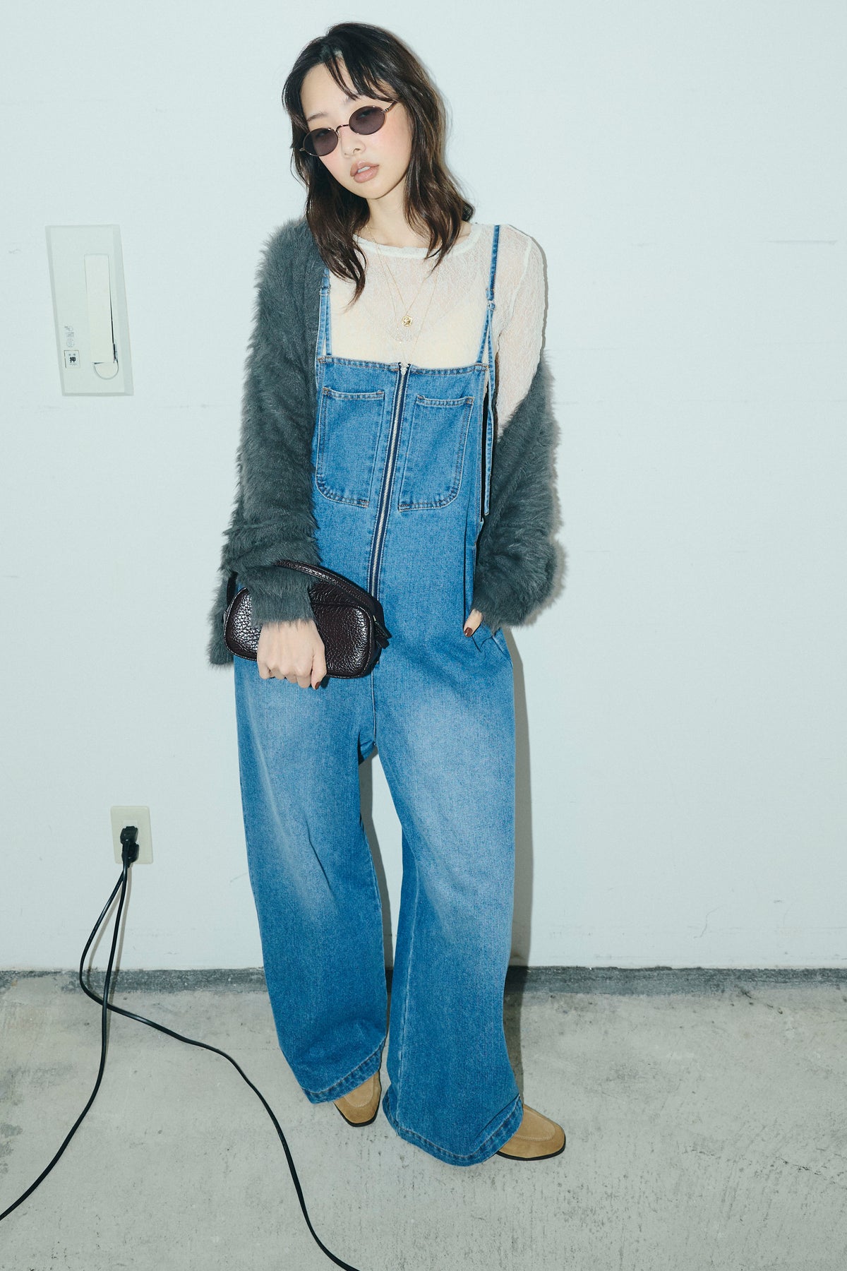 [予約/SET]起毛シャギーカーディガン+フロントジップストラップデザインデニムサロペット(2set)