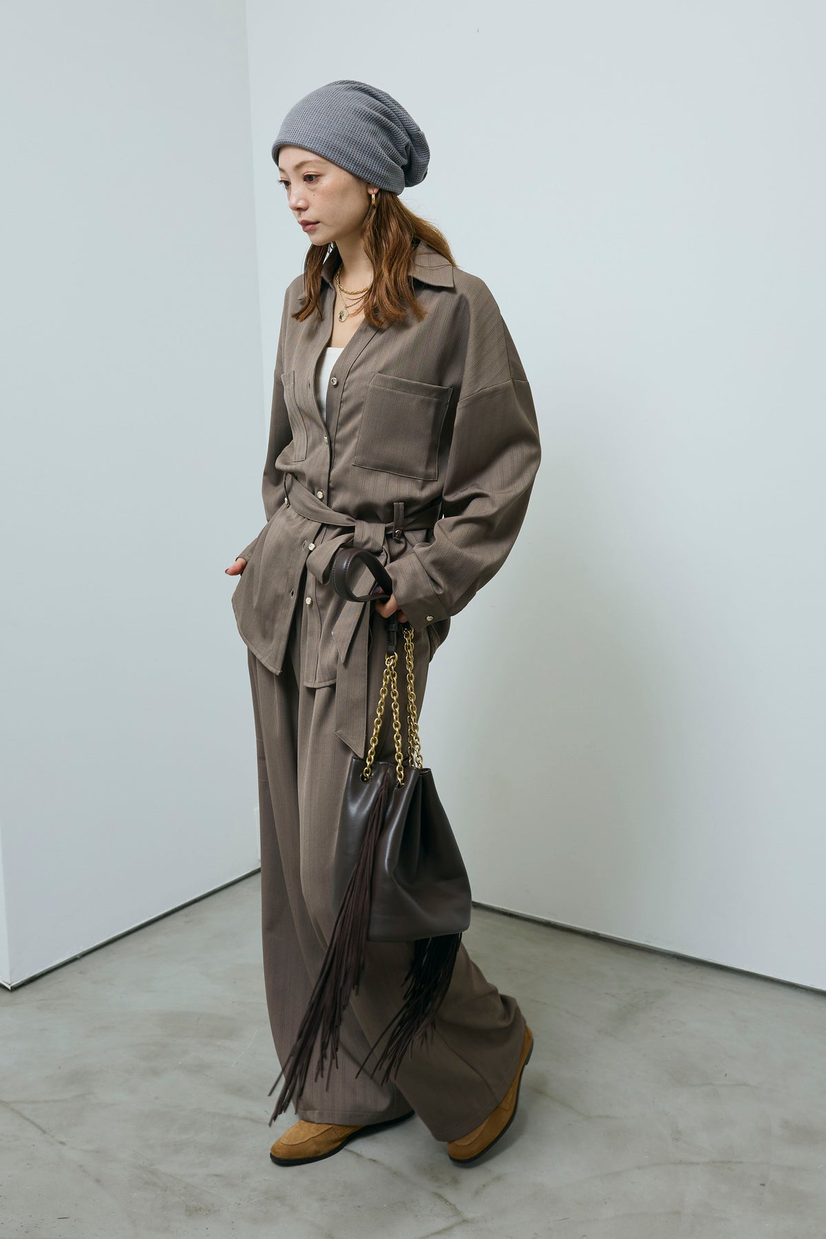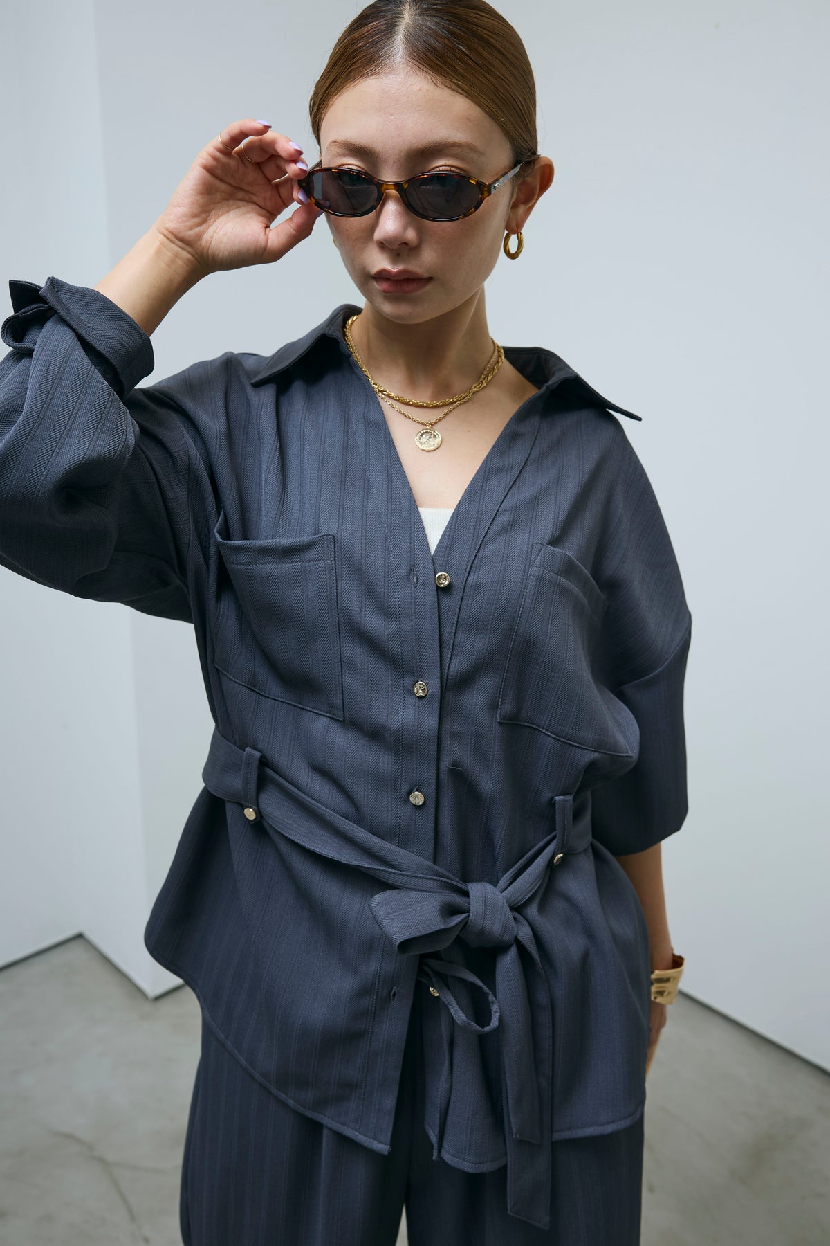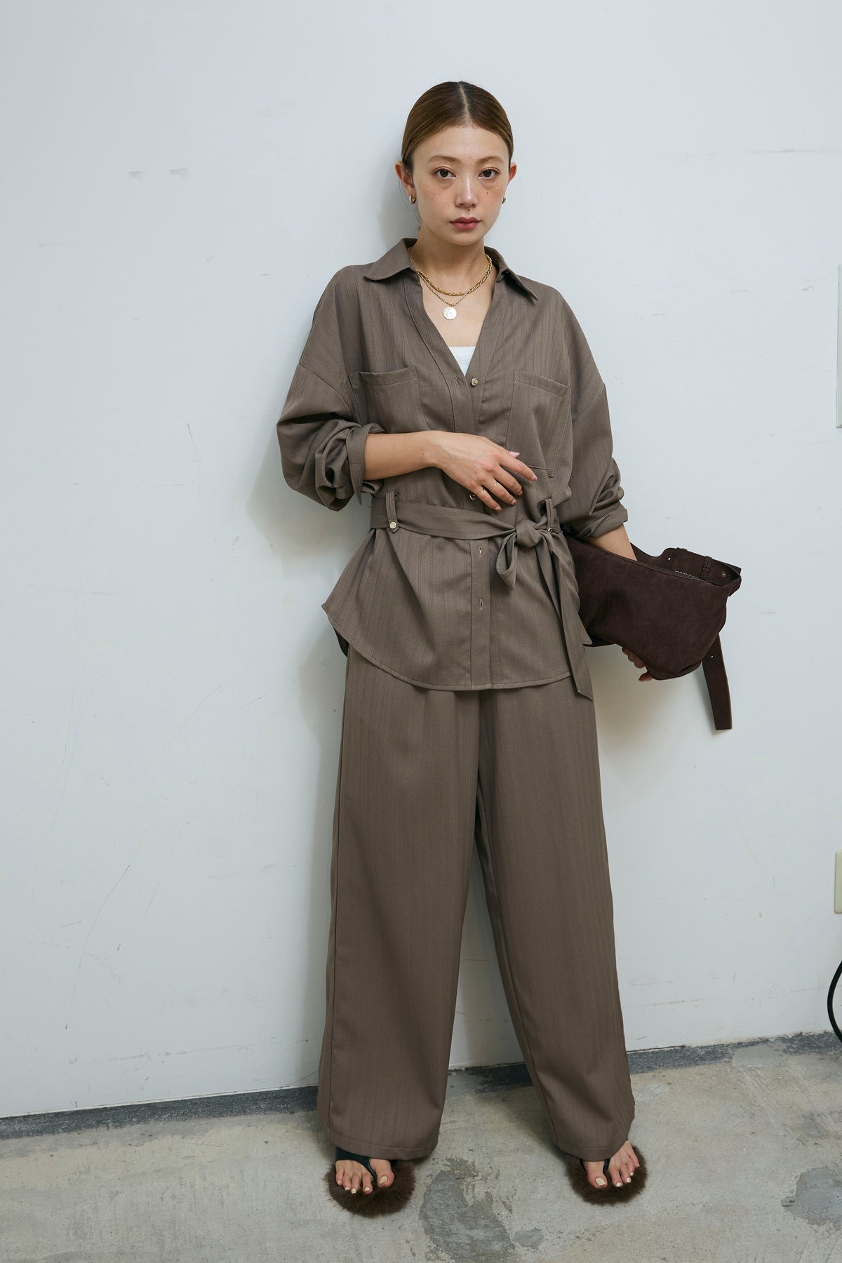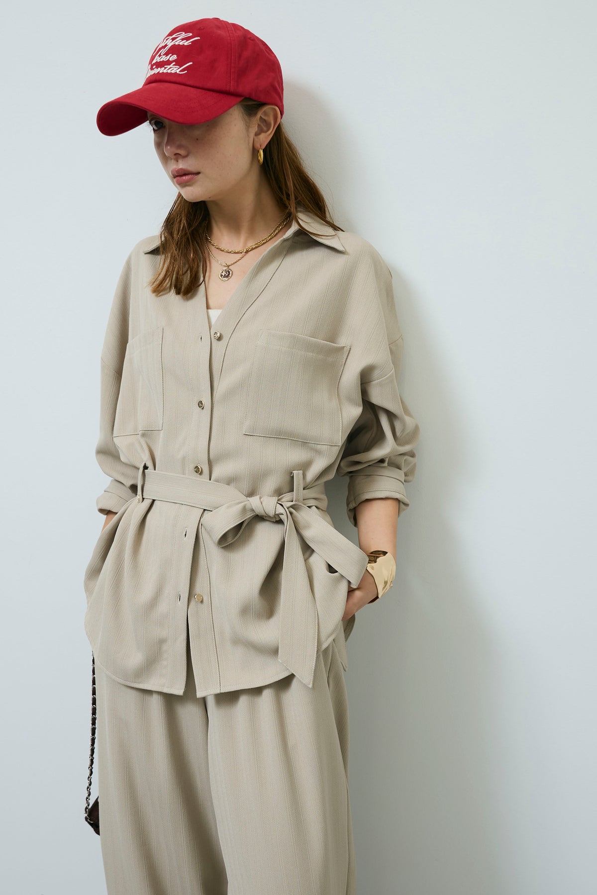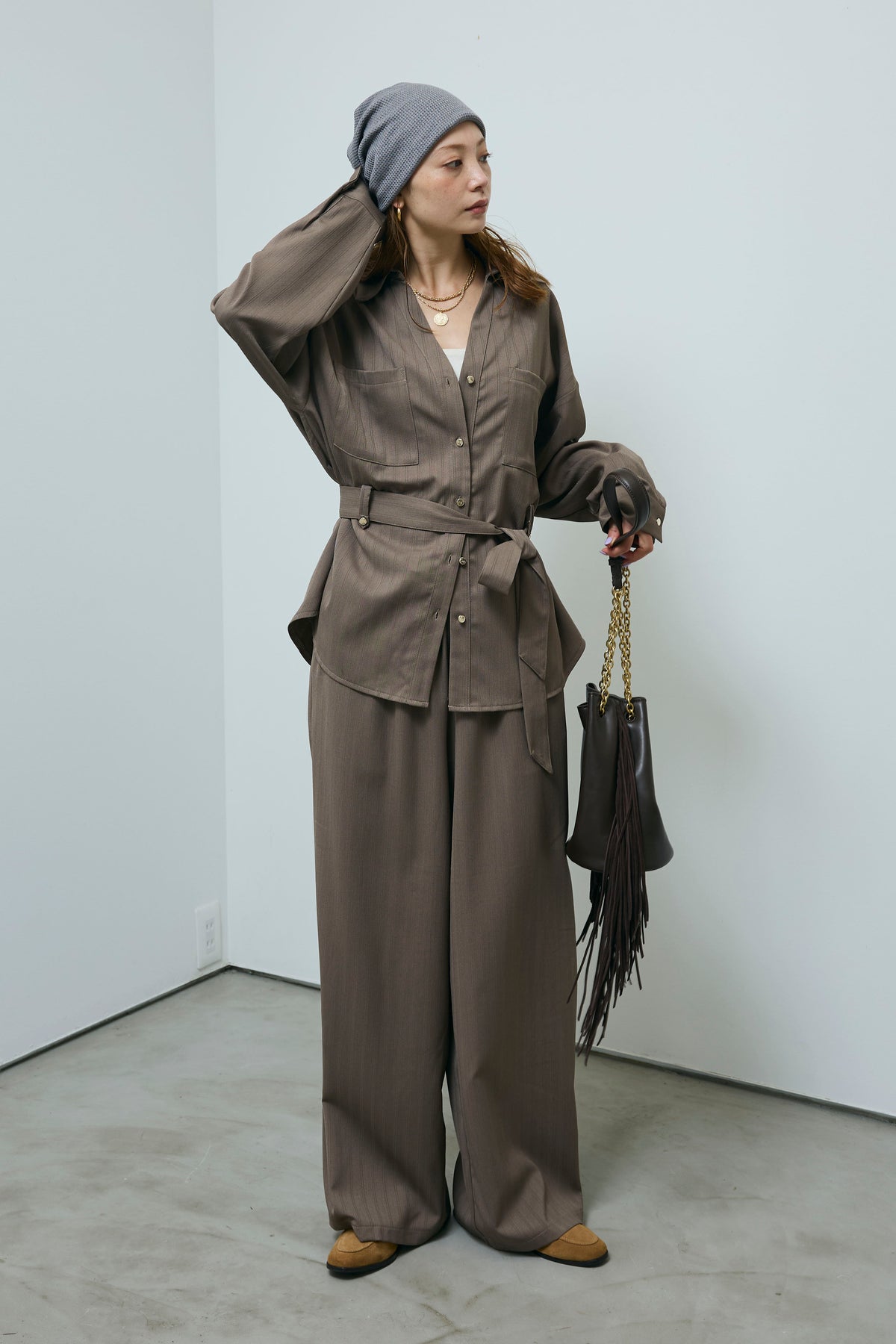 ミニヘリンボーンベルト付きシャツ+ミニヘリンボーンストレートイージーワイドPT(2set)