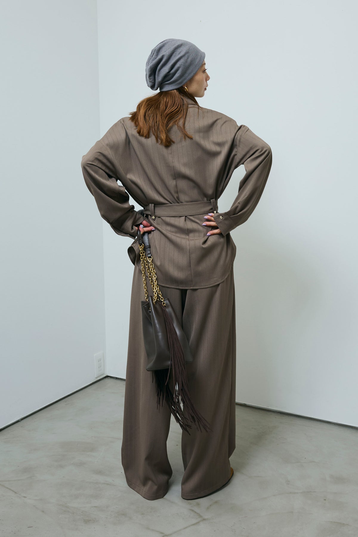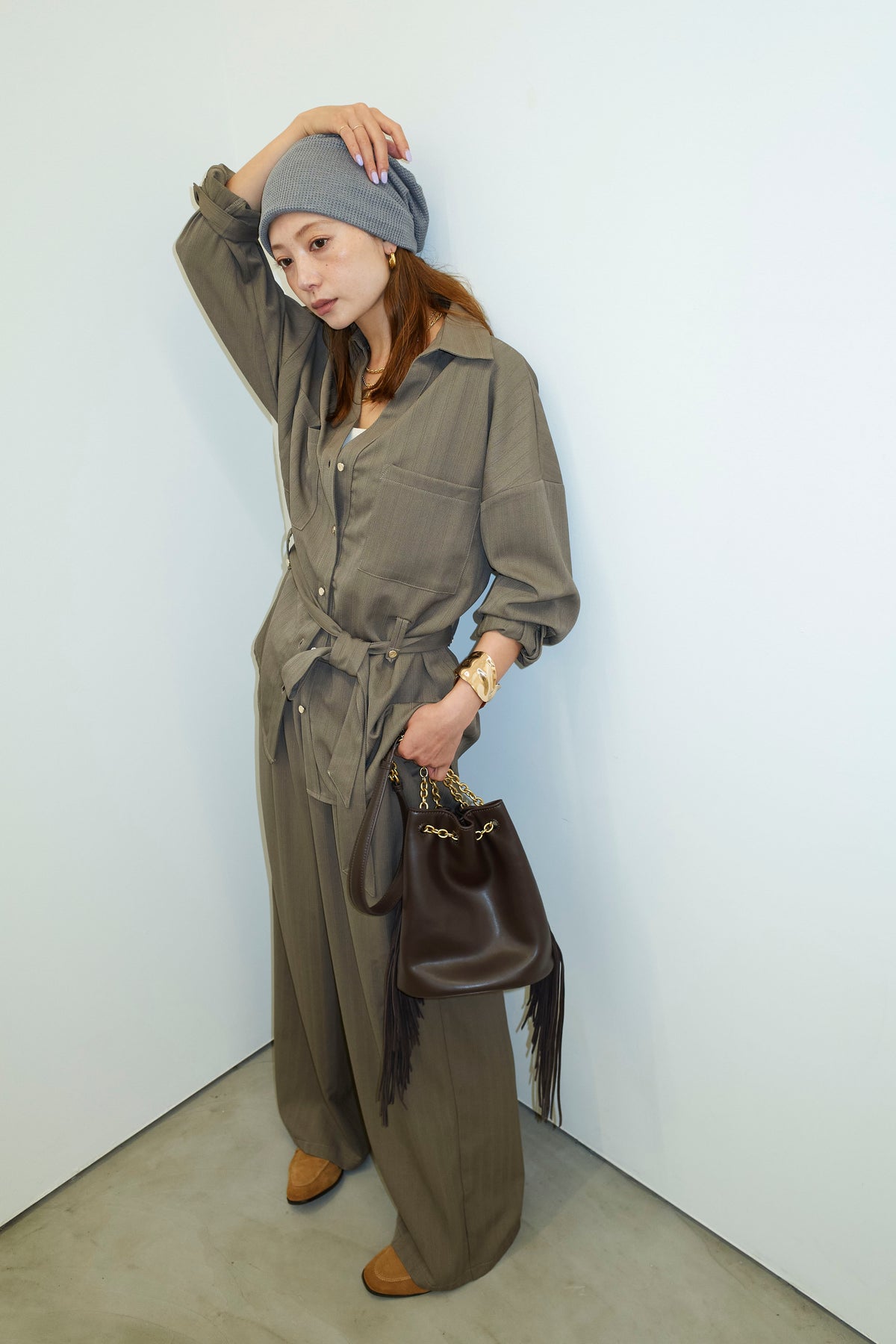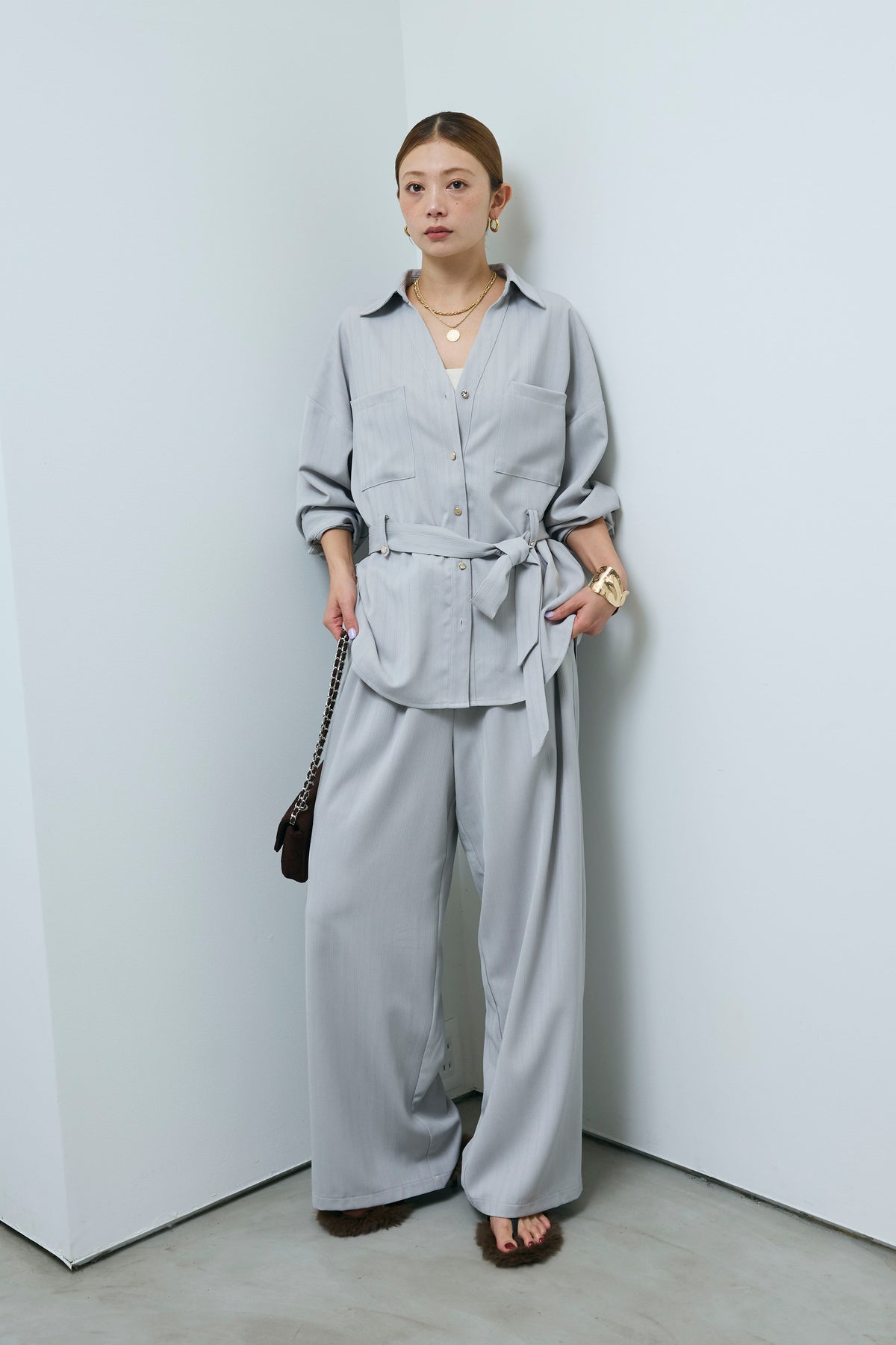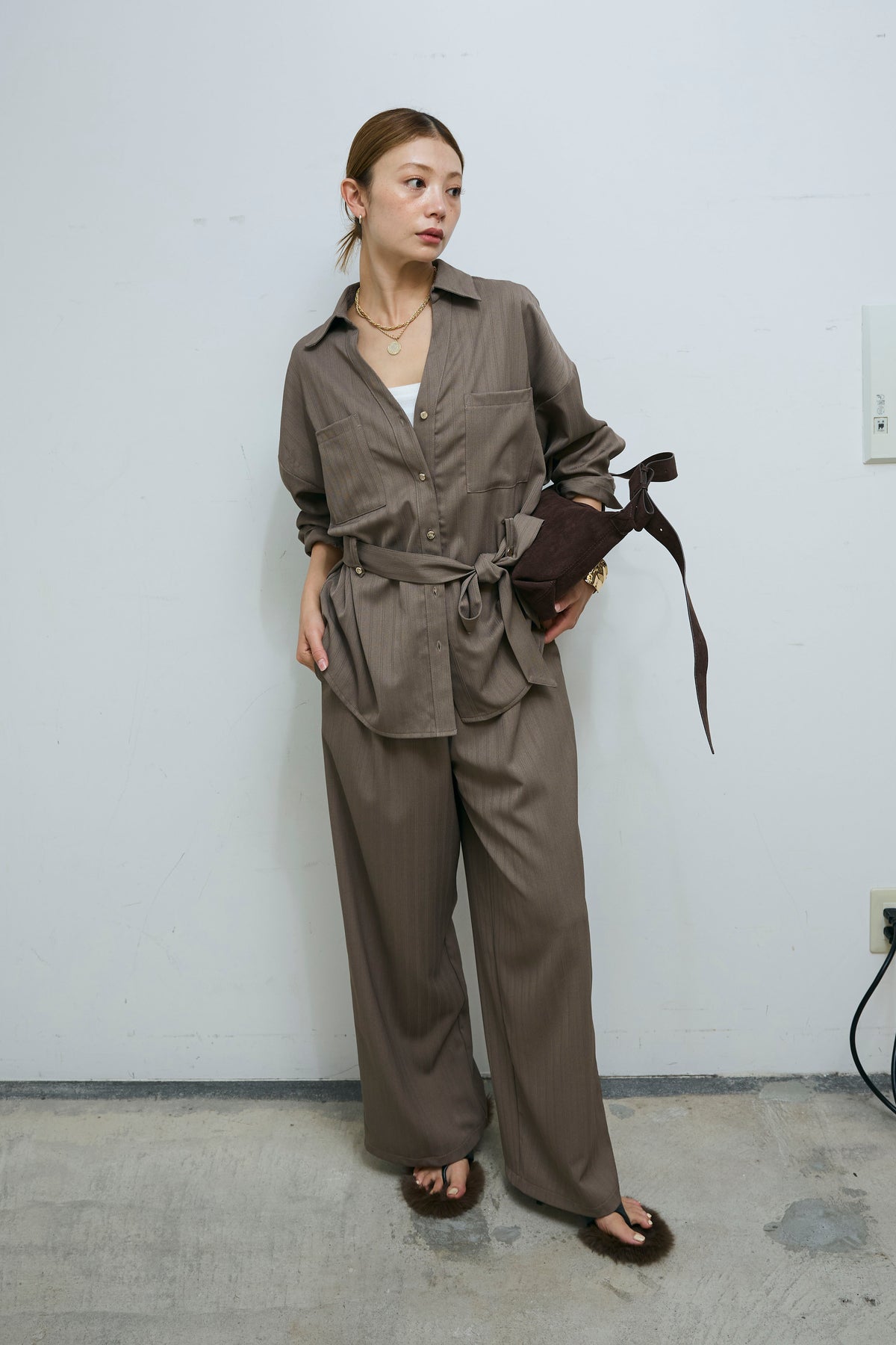 ミニヘリンボーンベルト付きシャツ+ミニヘリンボーンストレートイージーワイドPT(2set)