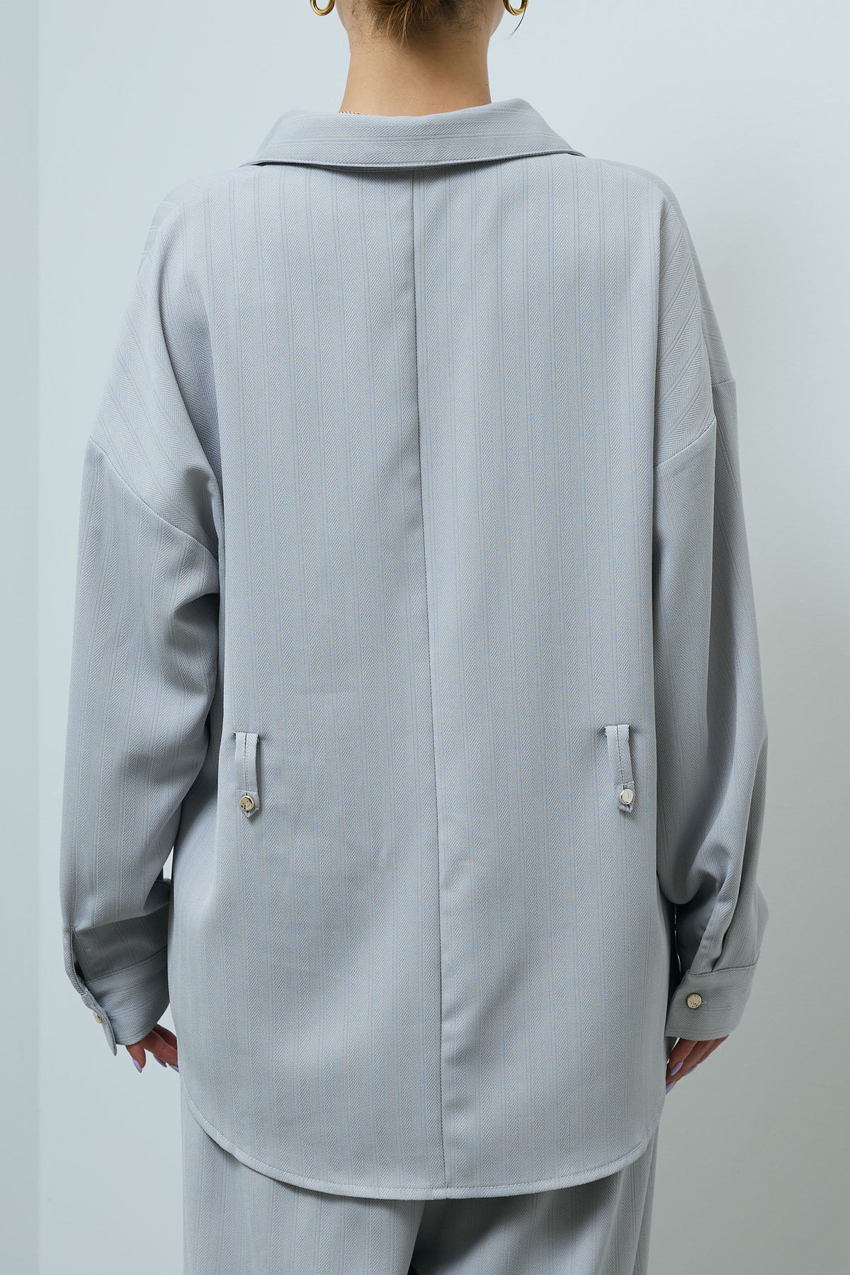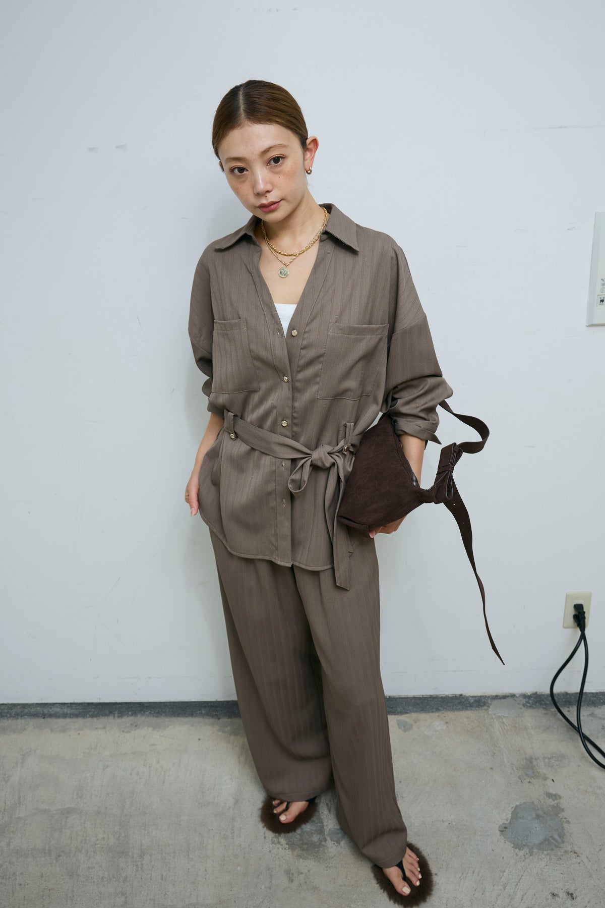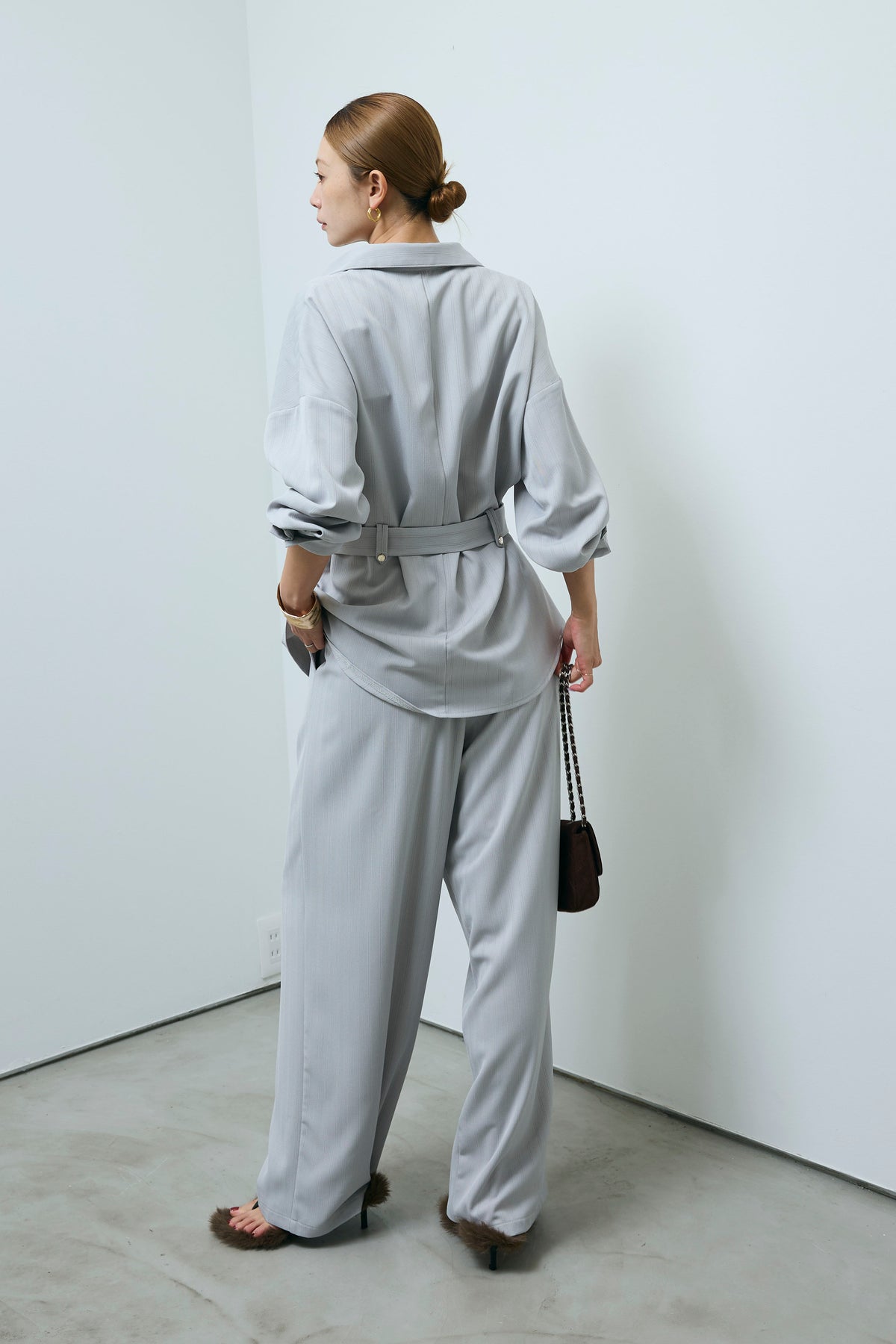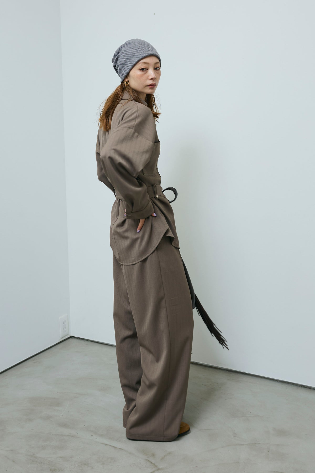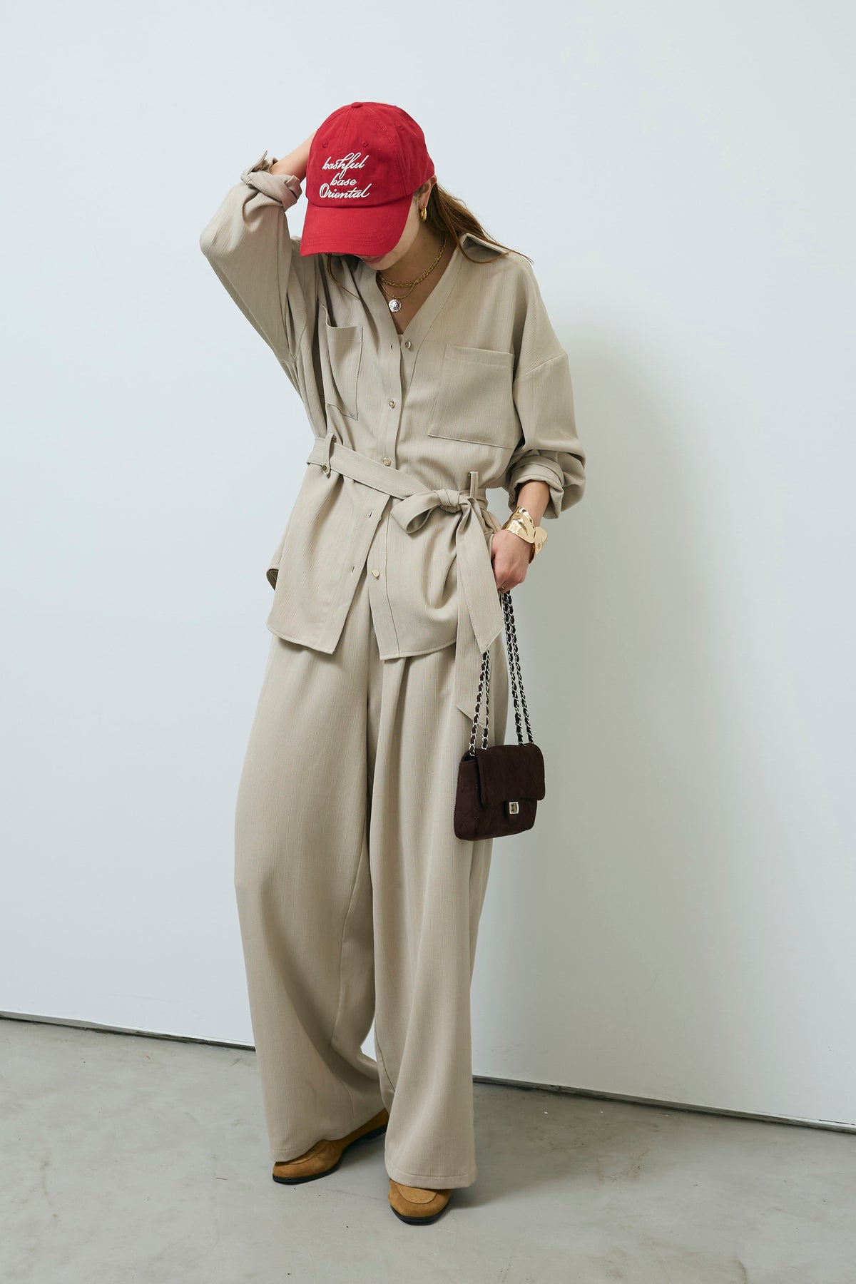 ミニヘリンボーンベルト付きシャツ+ミニヘリンボーンストレートイージーワイドPT(2set)