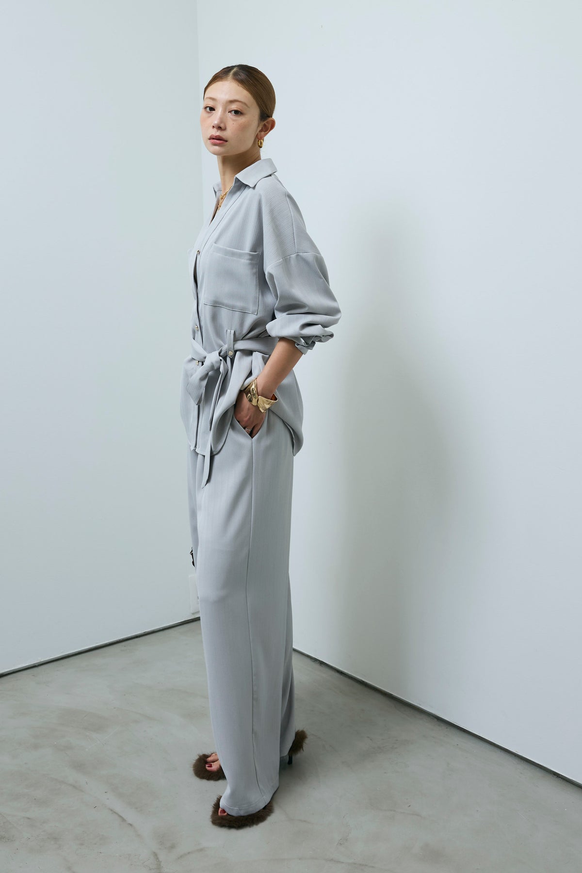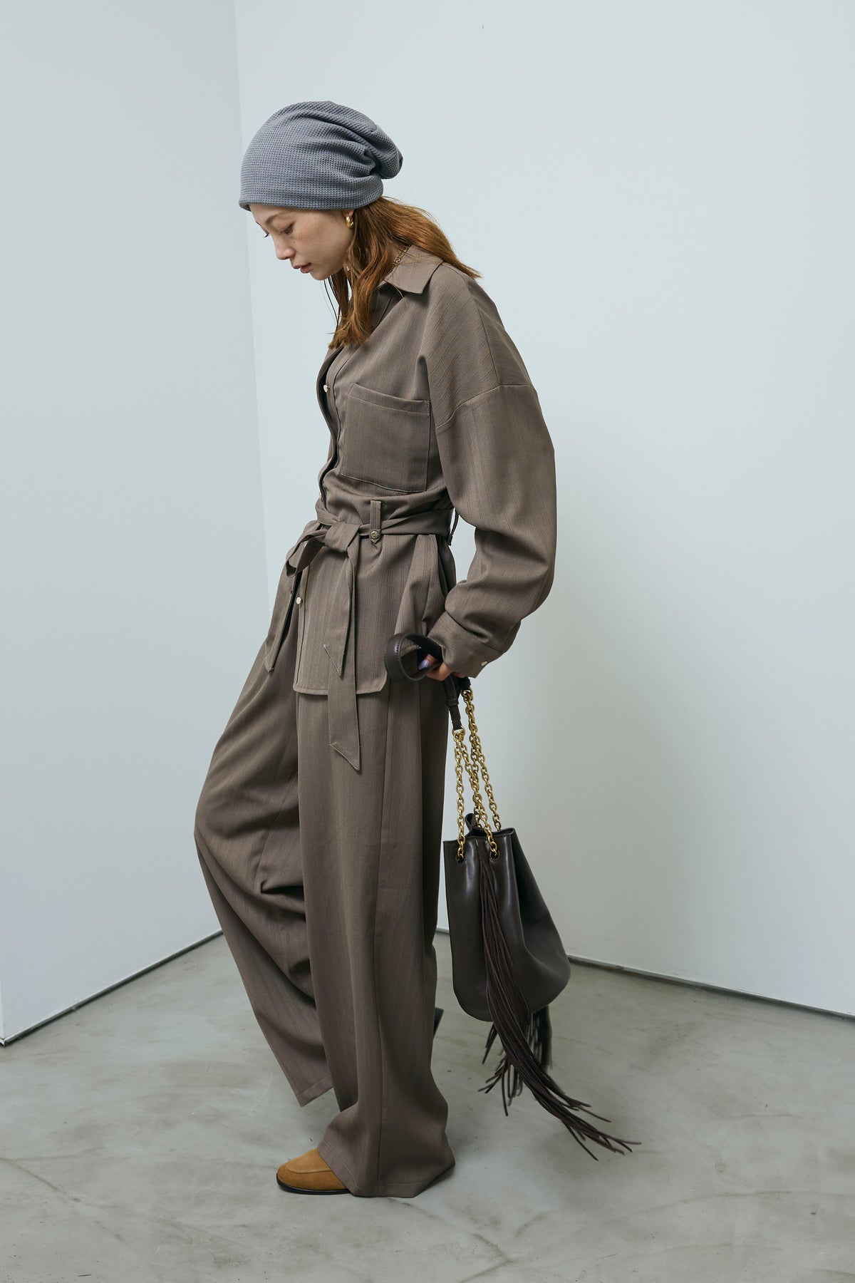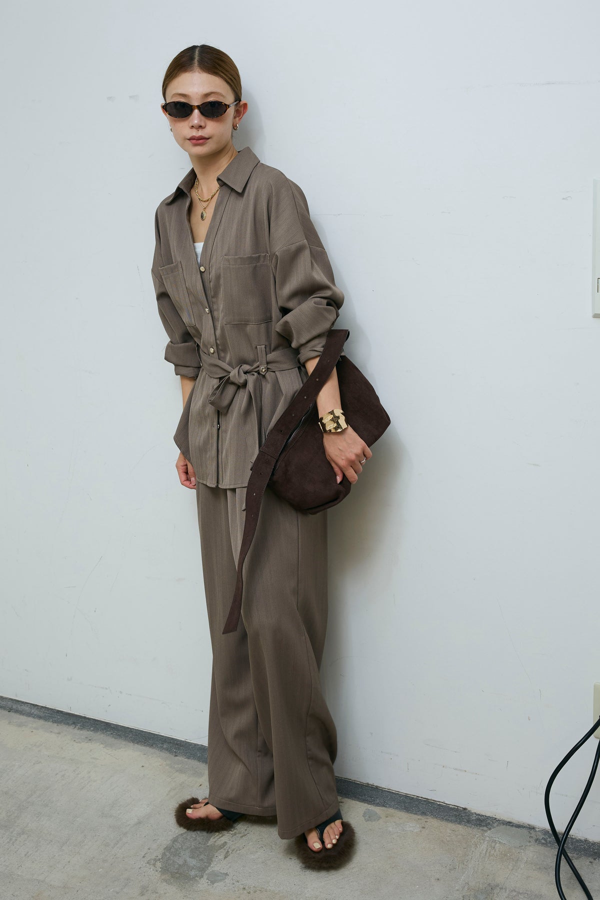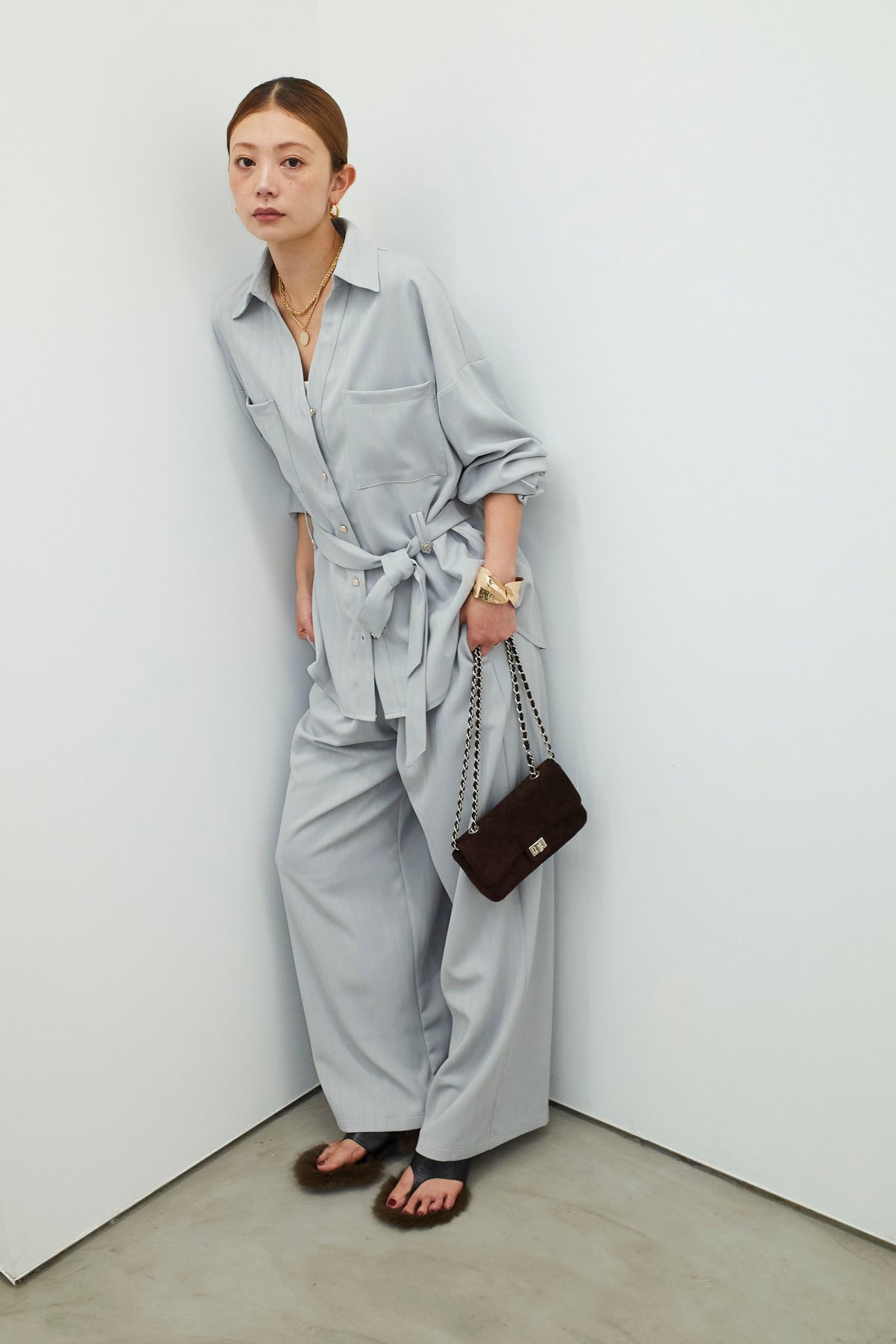 ミニヘリンボーンベルト付きシャツ+ミニヘリンボーンストレートイージーワイドPT(2set)
