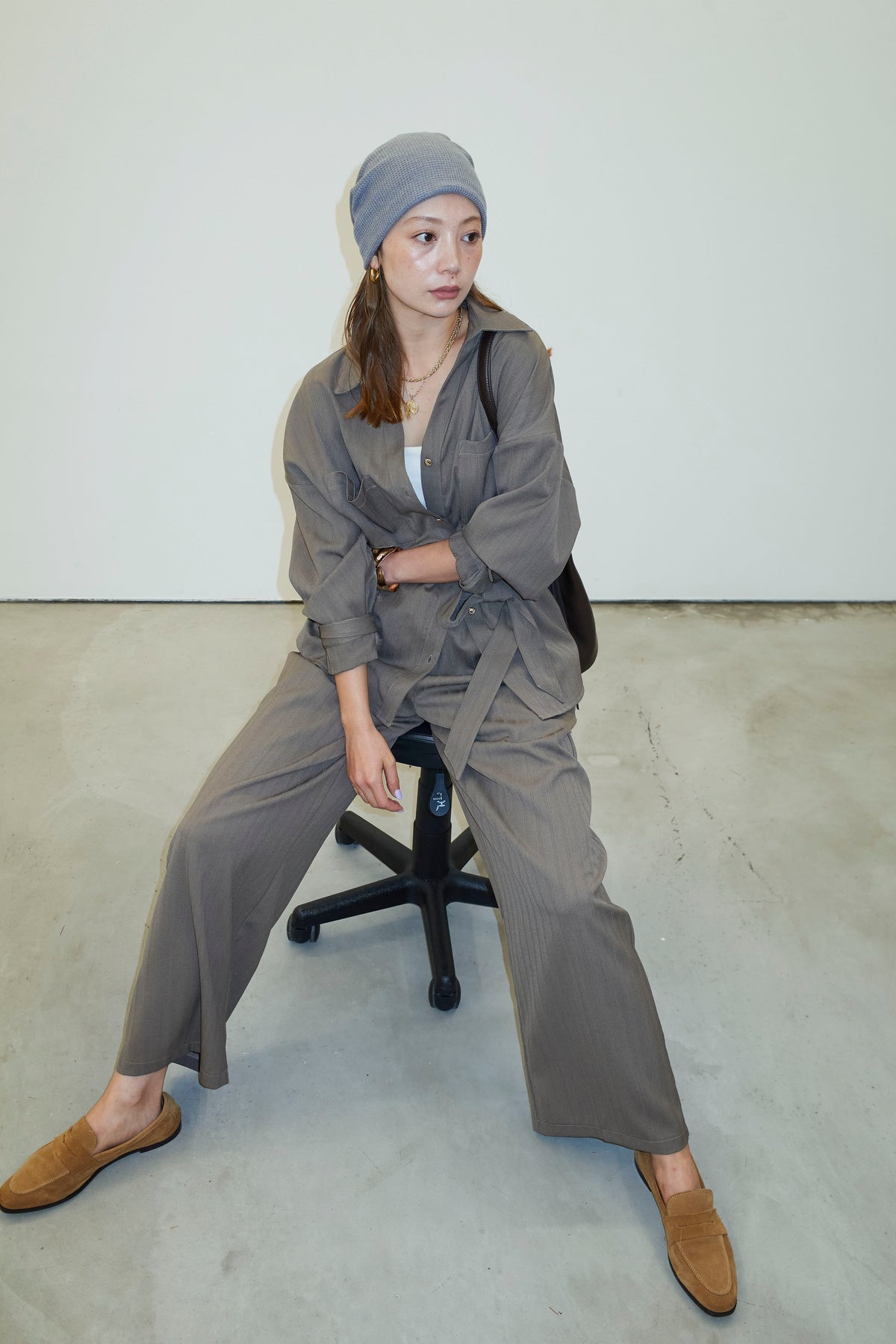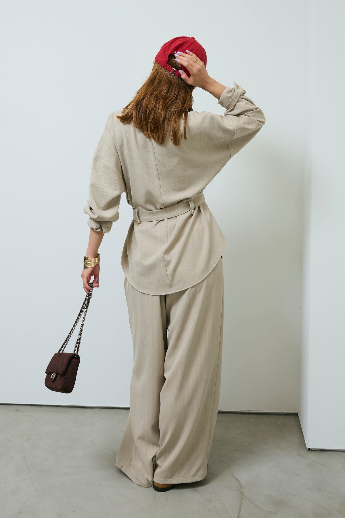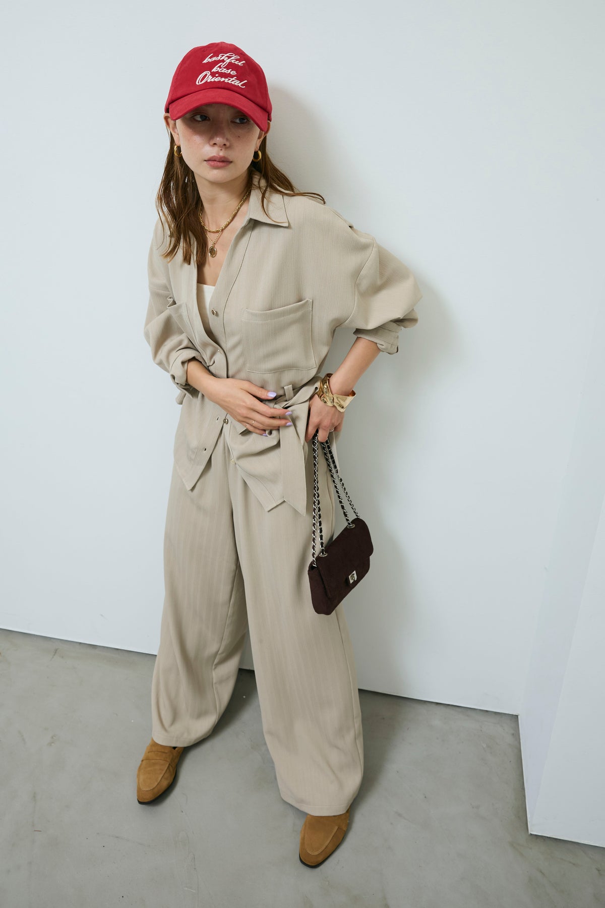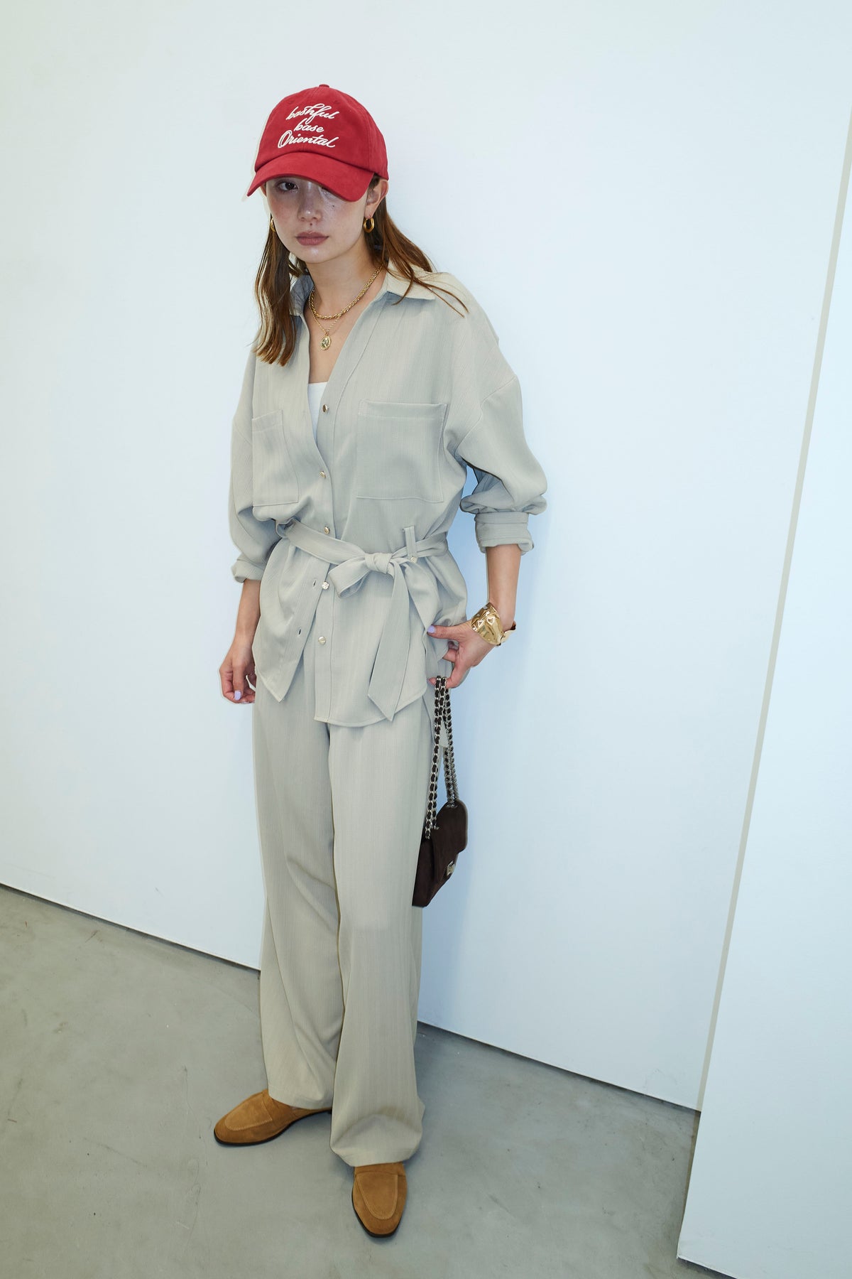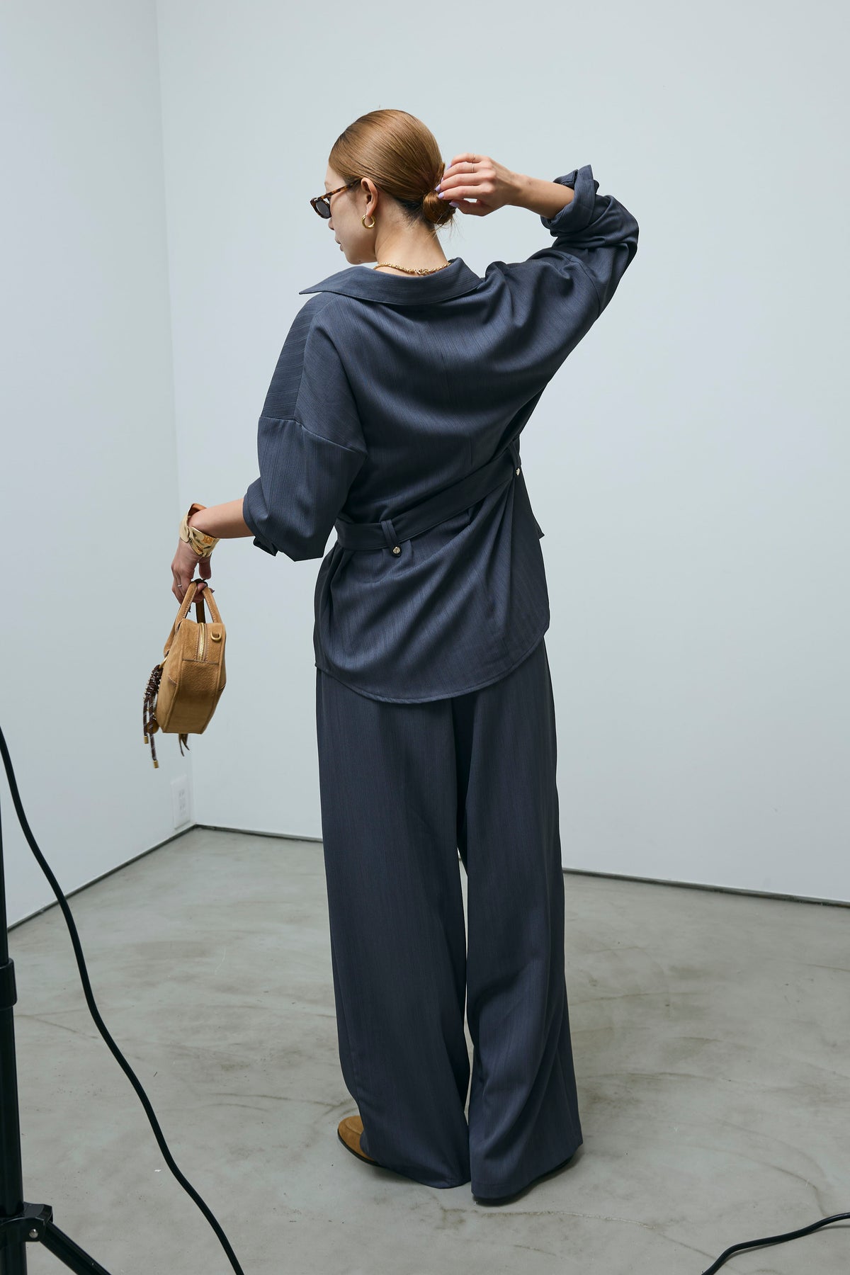 ミニヘリンボーンベルト付きシャツ+ミニヘリンボーンストレートイージーワイドPT(2set)