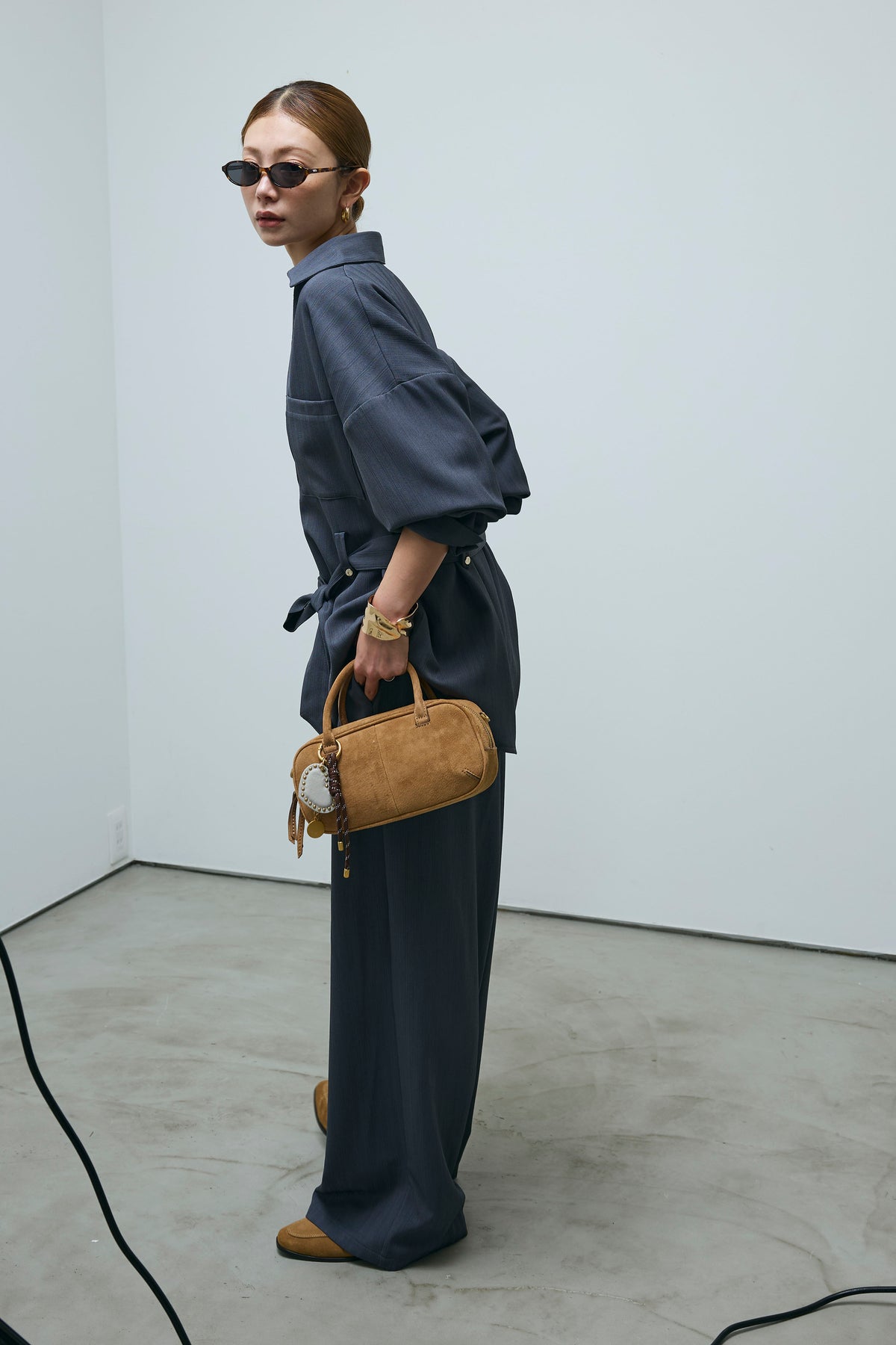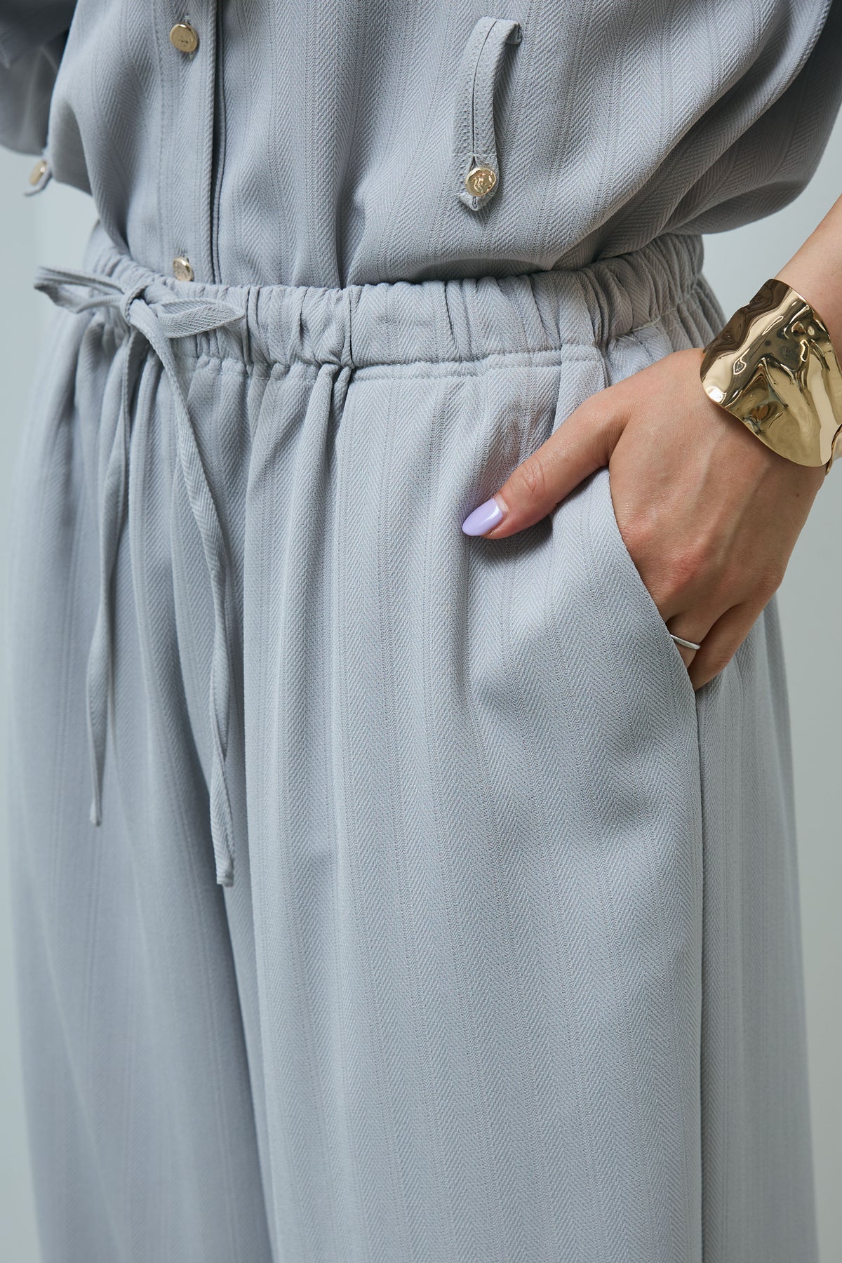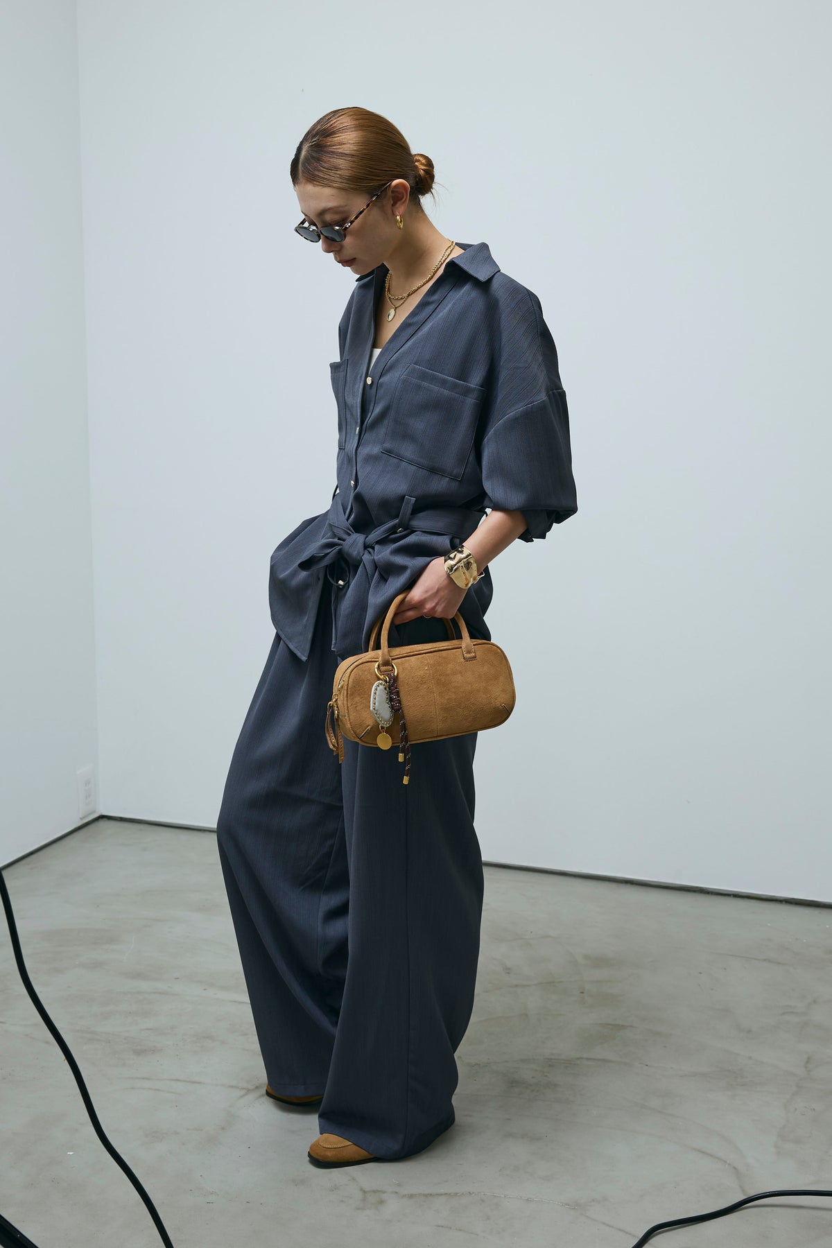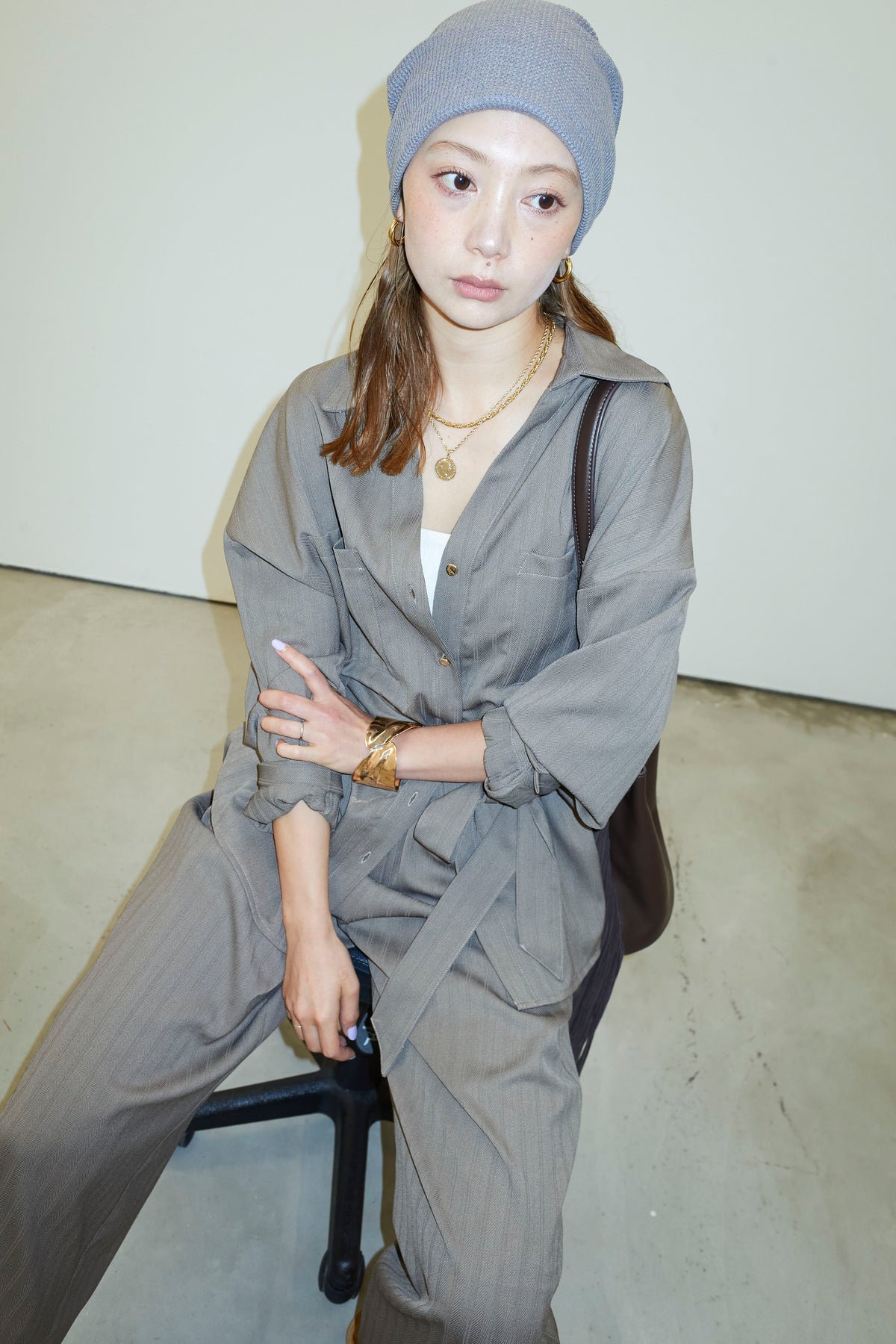 ミニヘリンボーンベルト付きシャツ+ミニヘリンボーンストレートイージーワイドPT(2set)