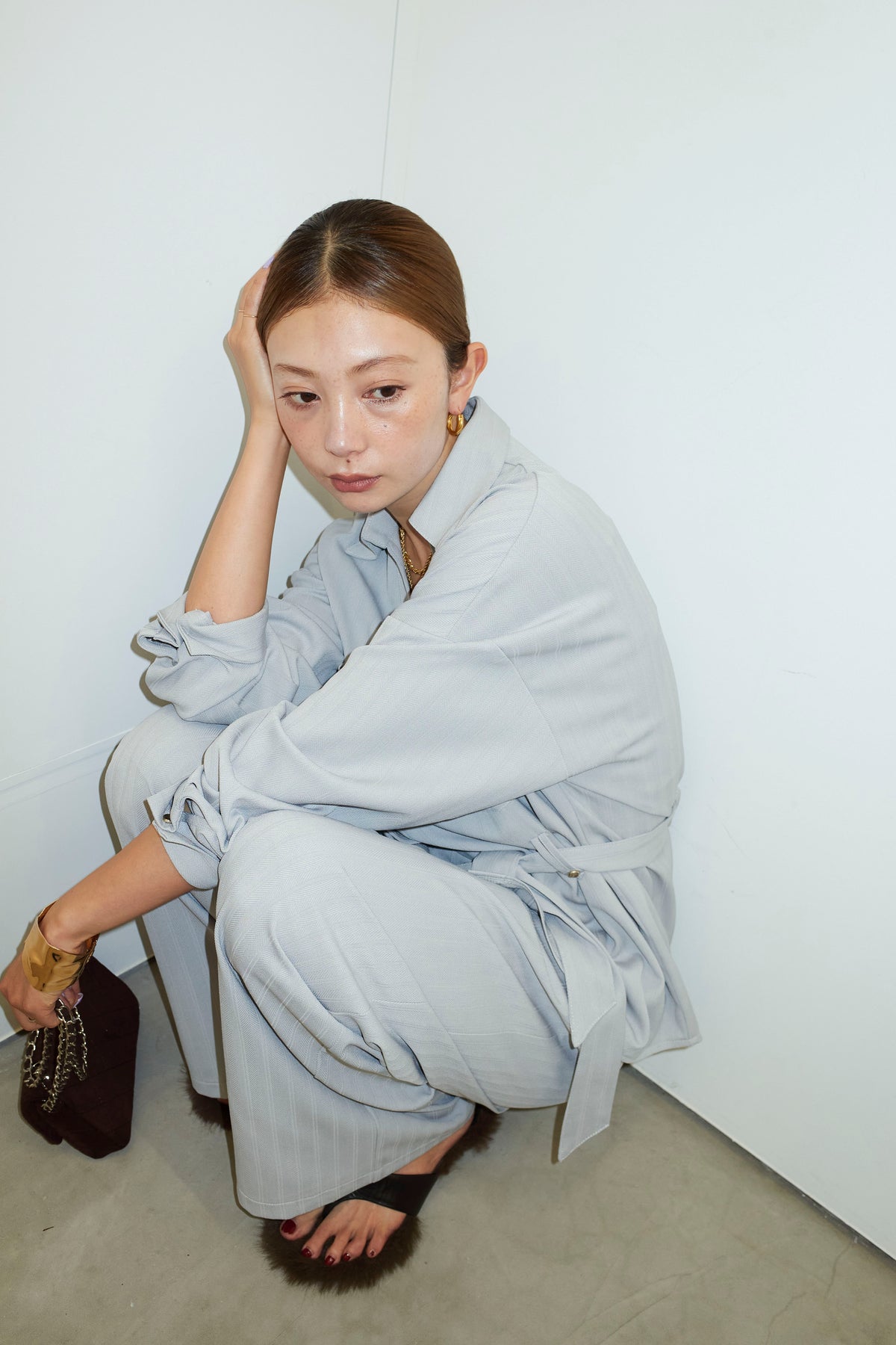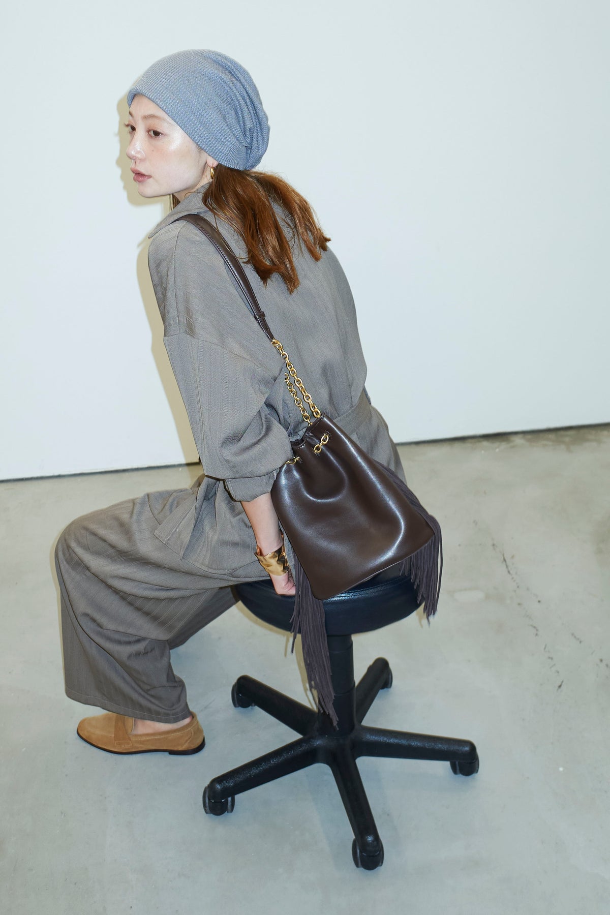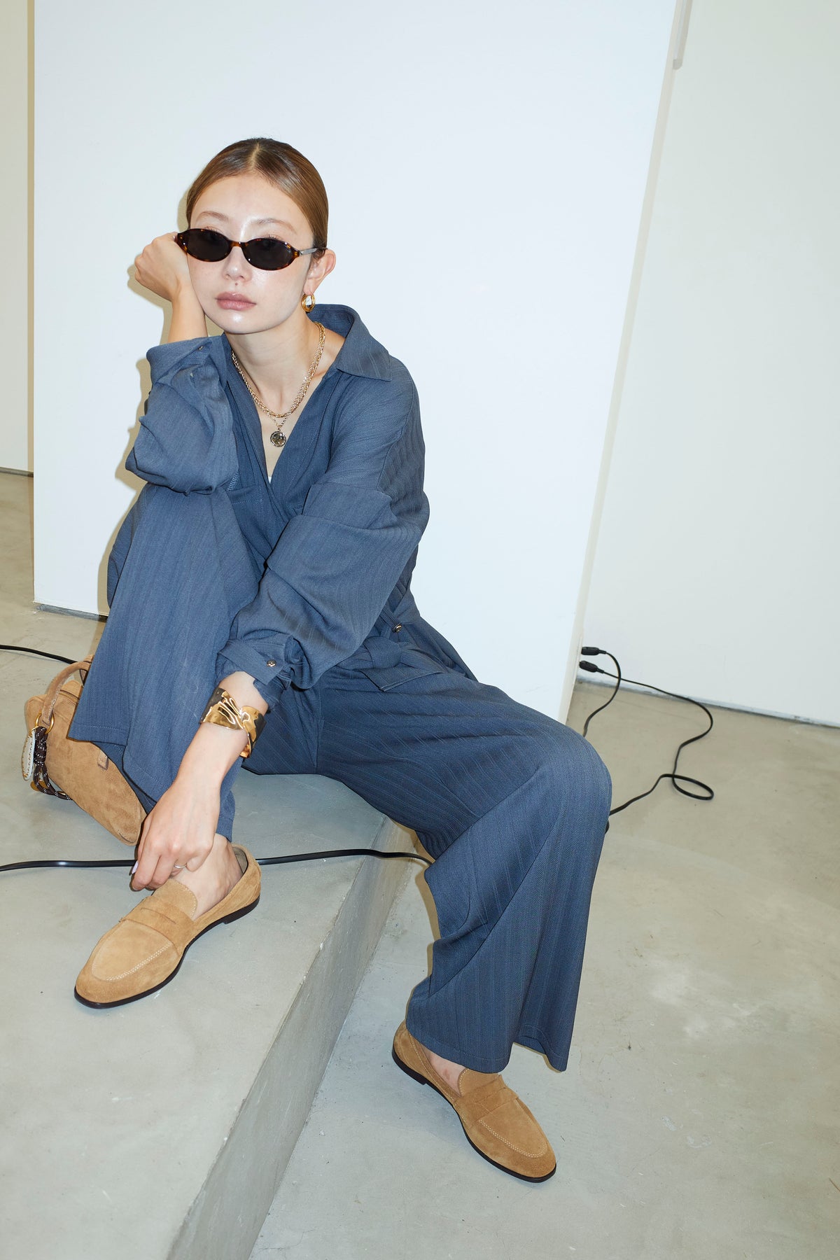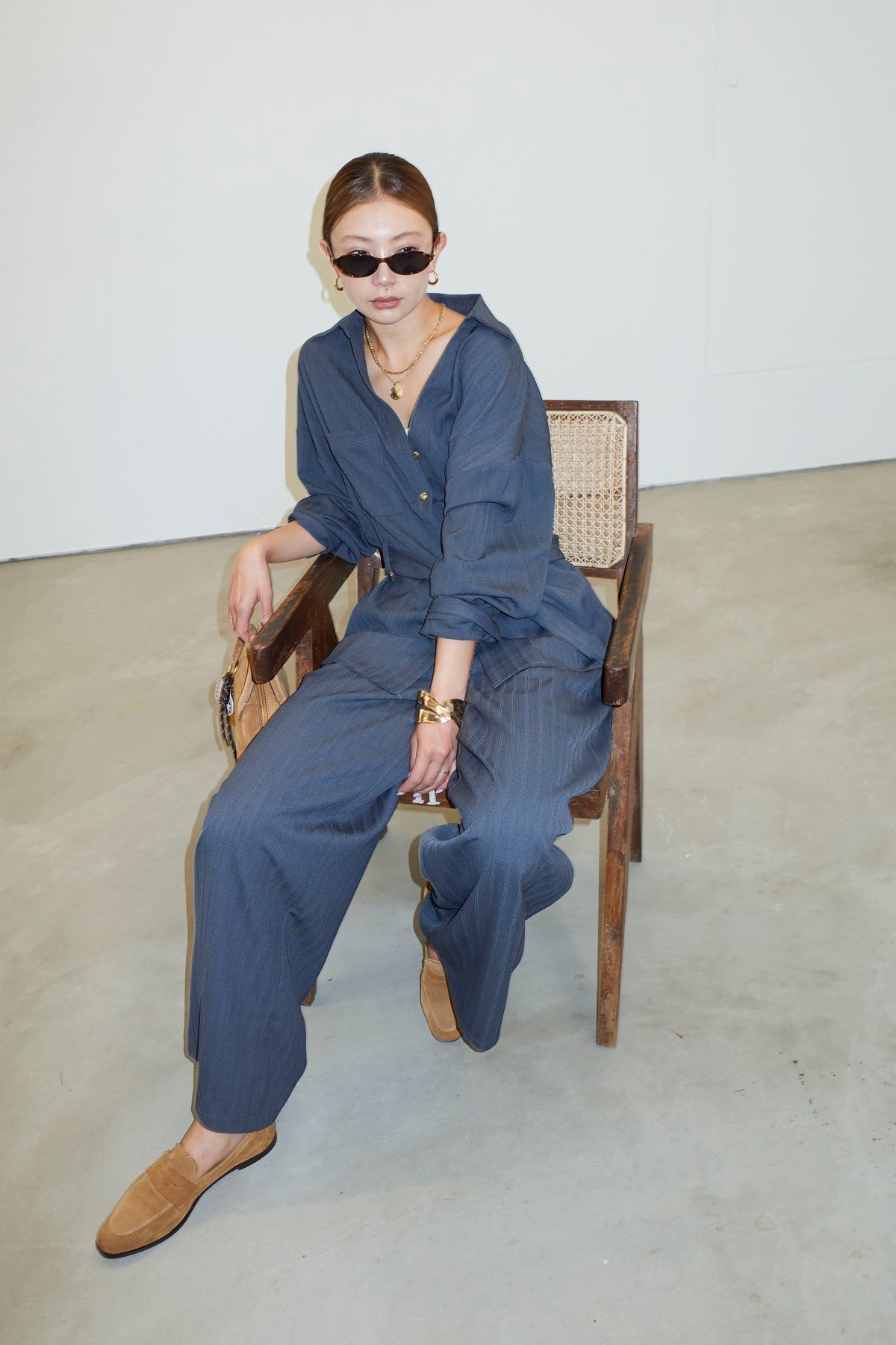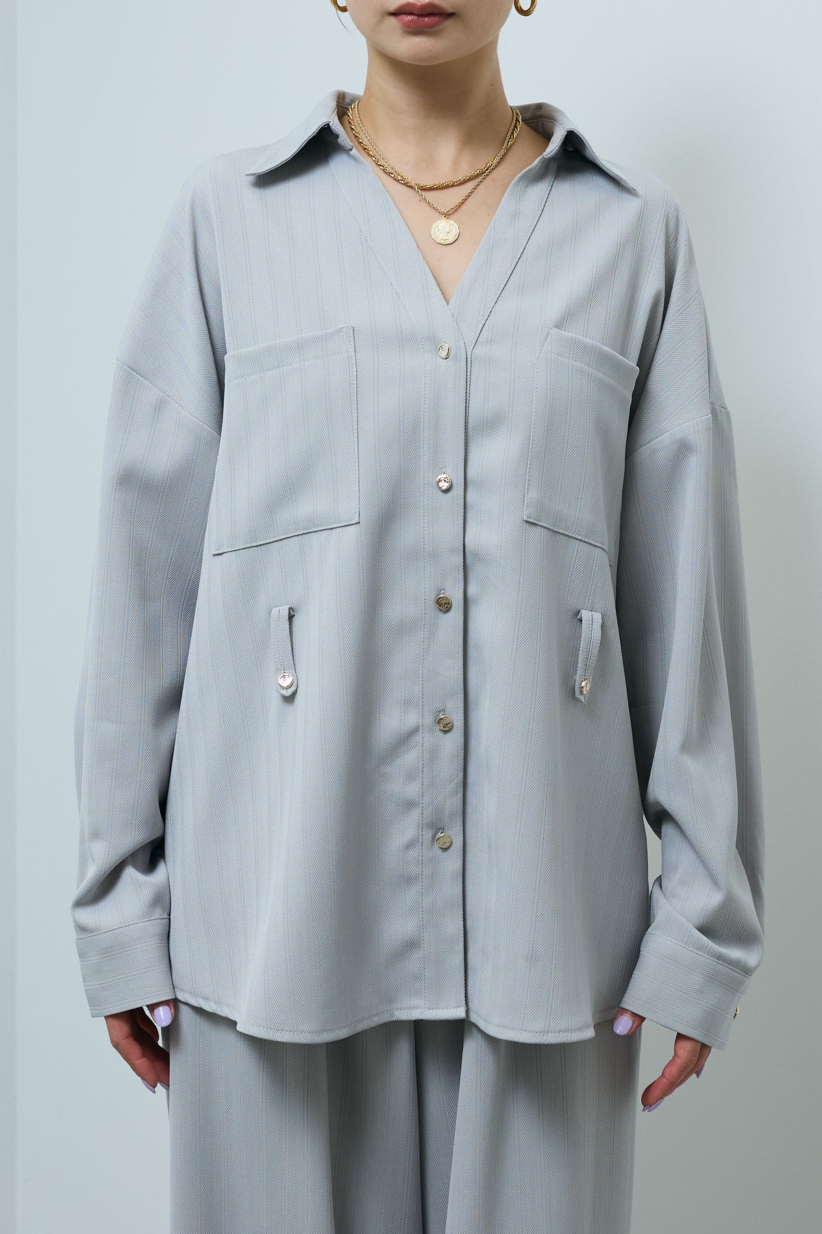 ミニヘリンボーンベルト付きシャツ+ミニヘリンボーンストレートイージーワイドPT(2set)