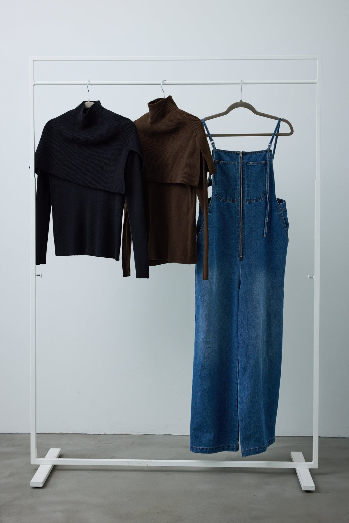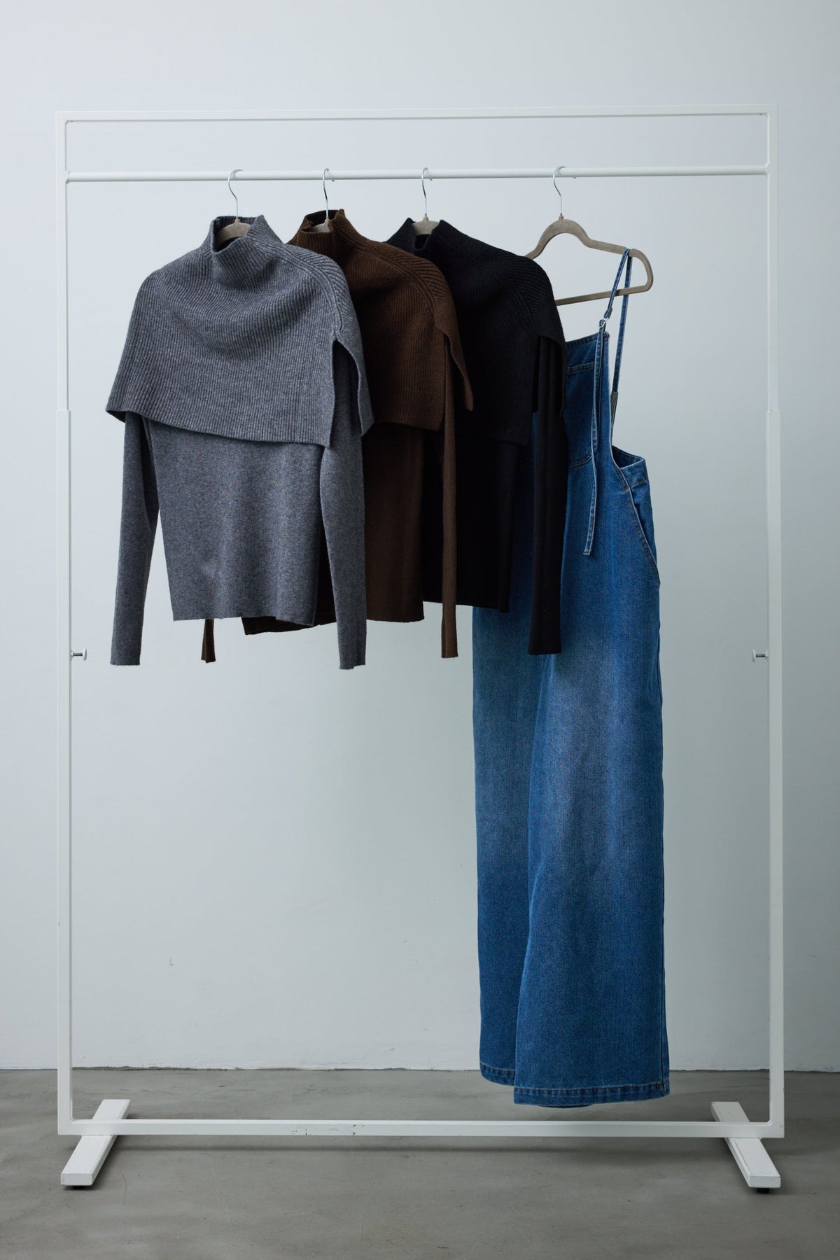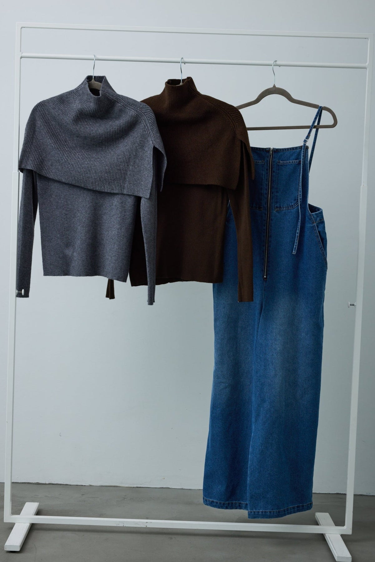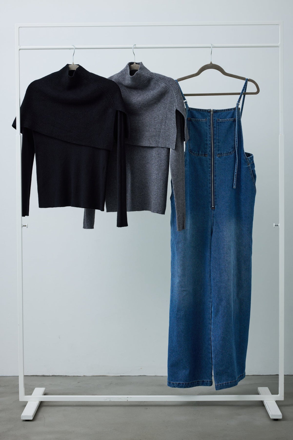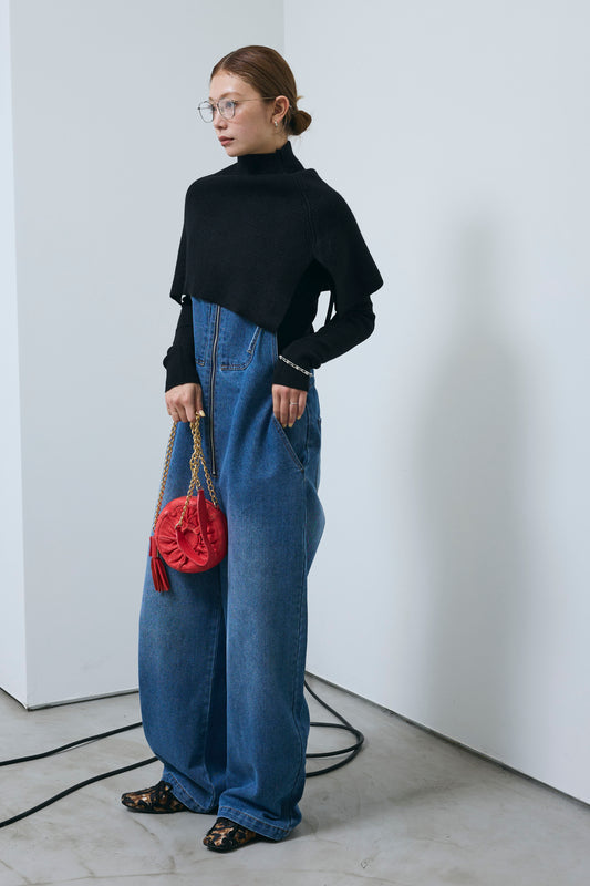 [予約/SET]ケープアンサンブルニット+ケープアンサンブルニット+フロントジップストラップデザインデニムサロペット(3set)