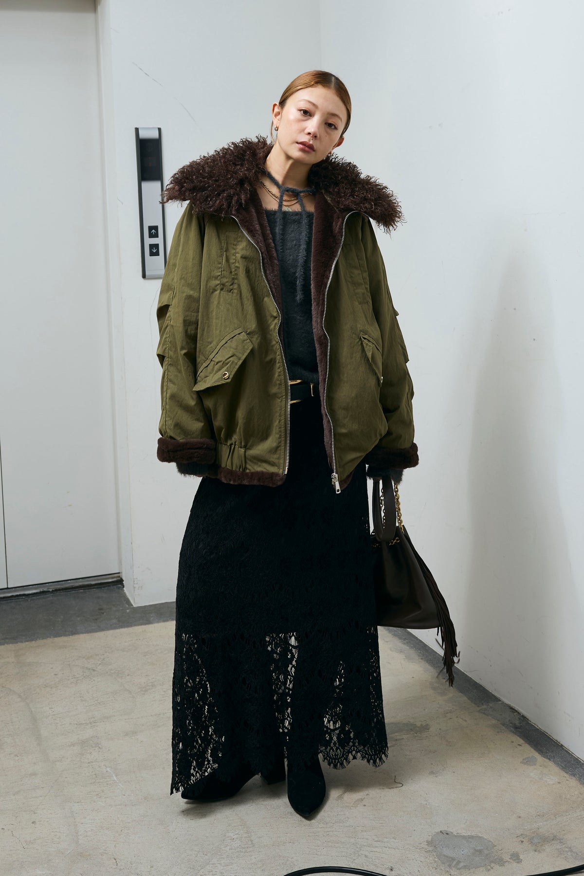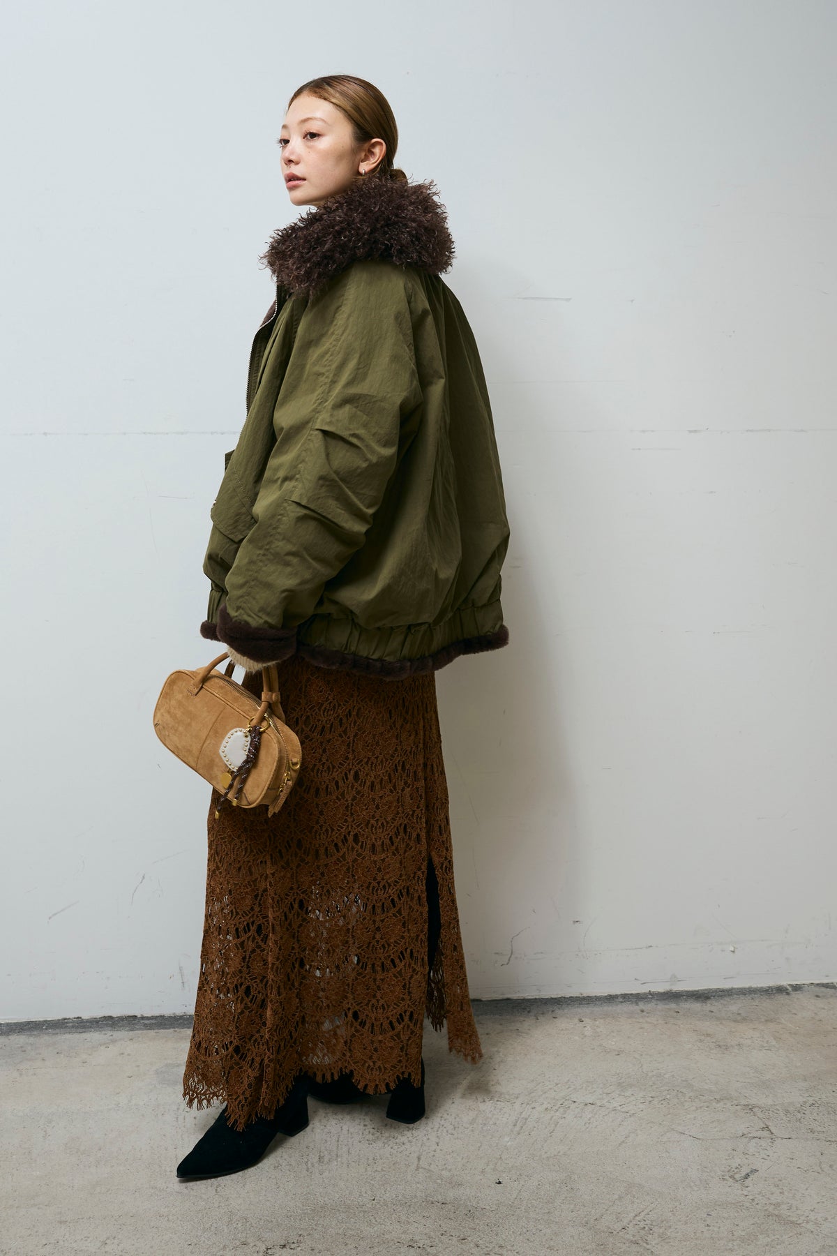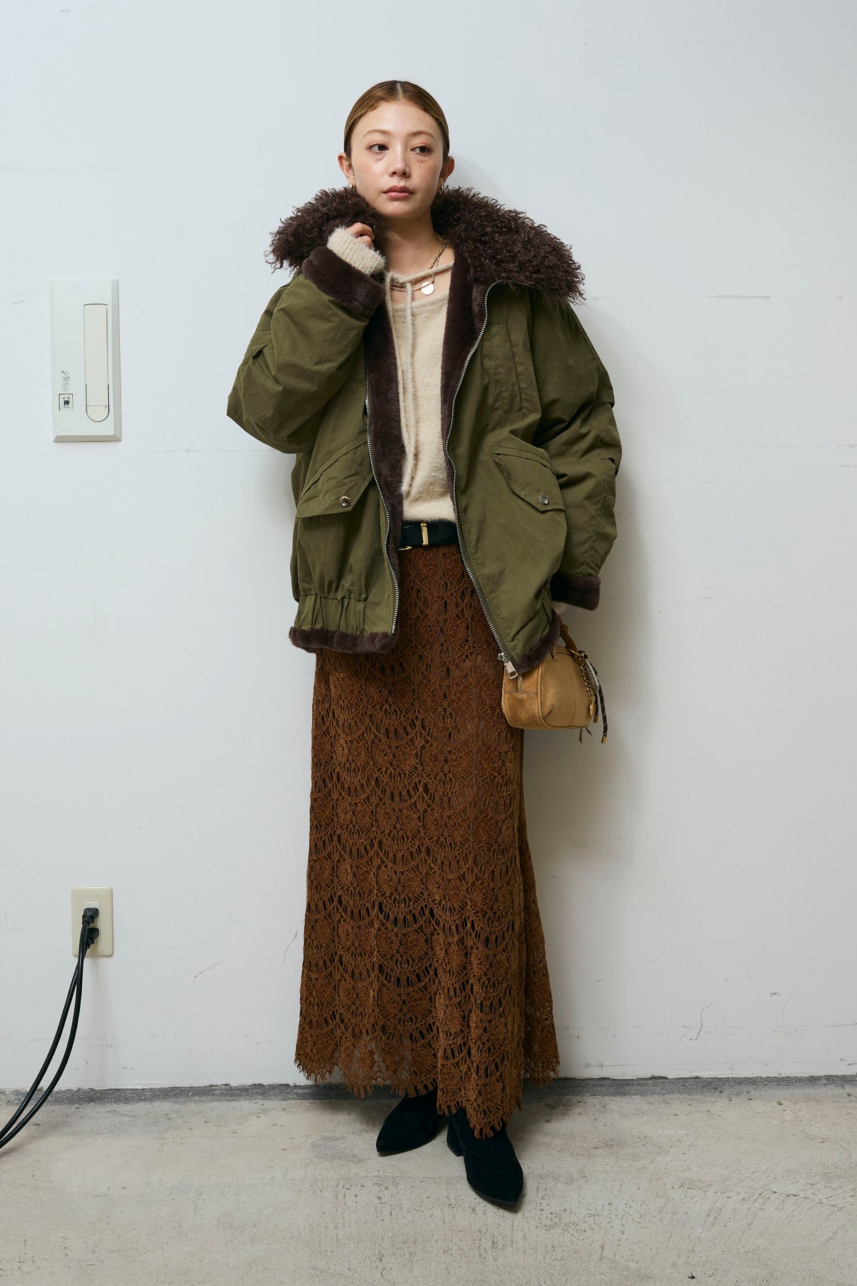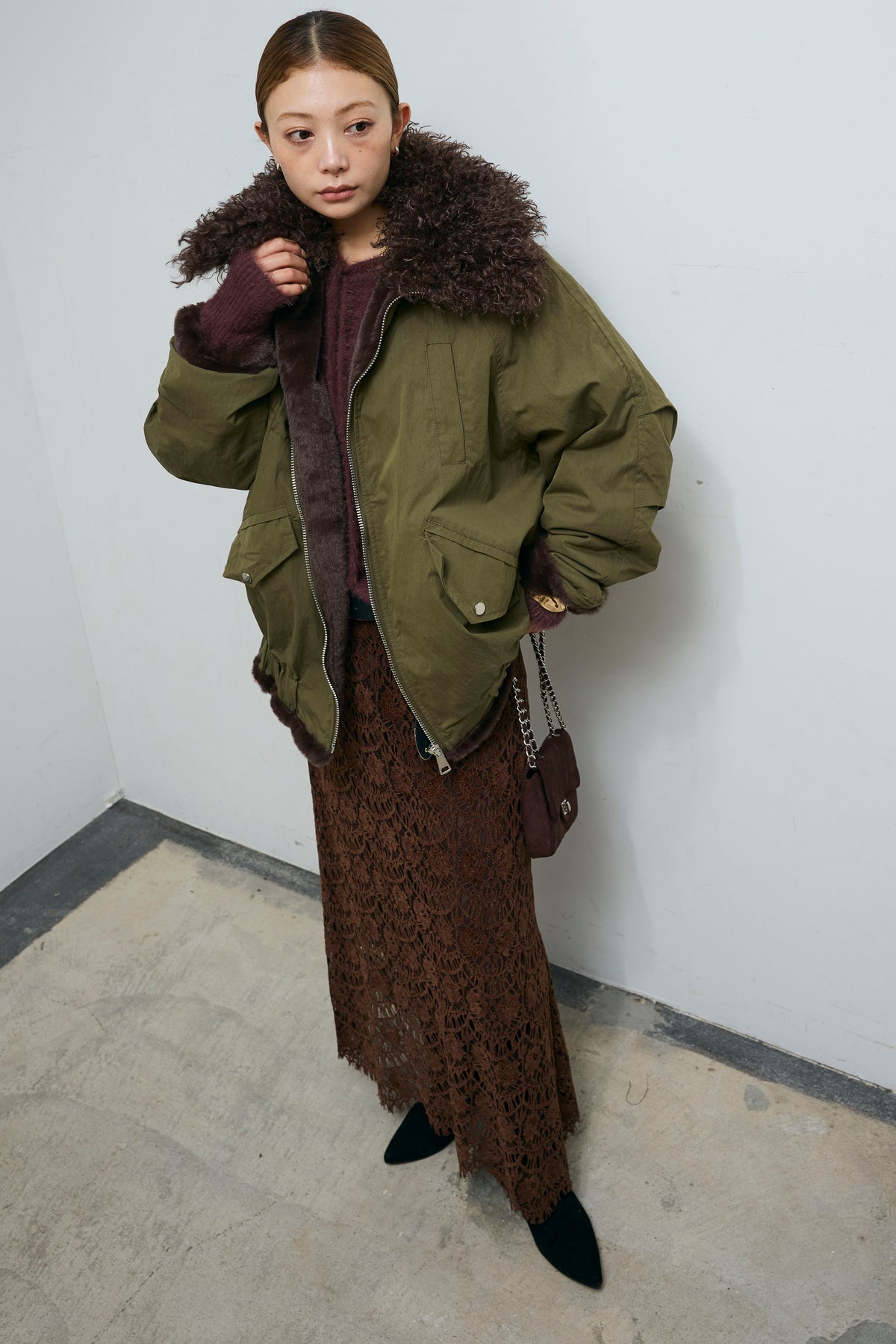 [予約/SET]ボア襟ジップブルゾン+レース刺繍ロングスカート(2set)