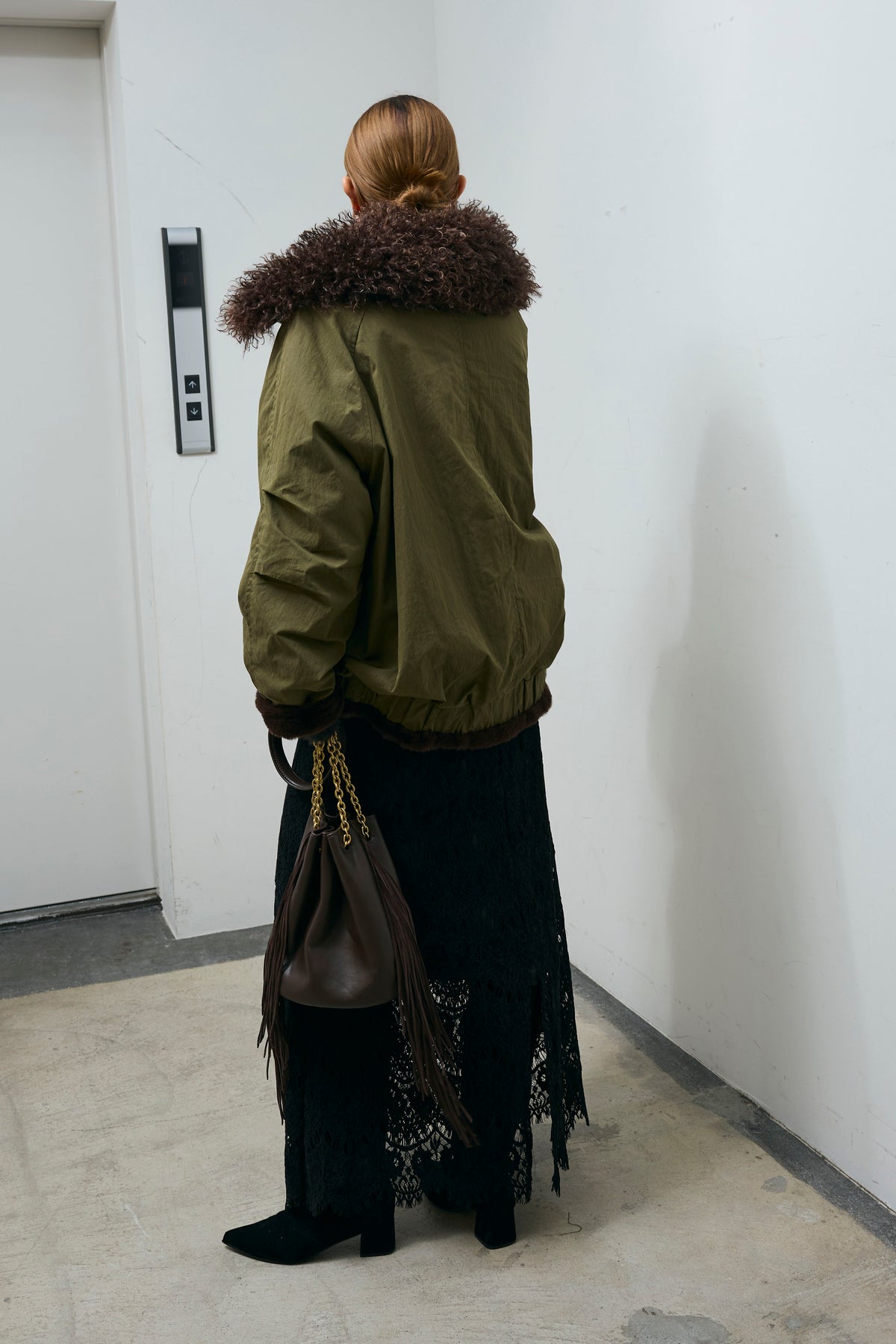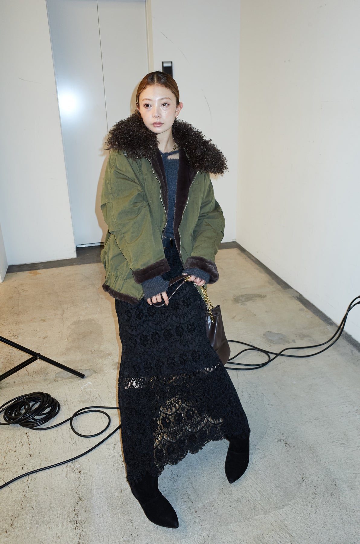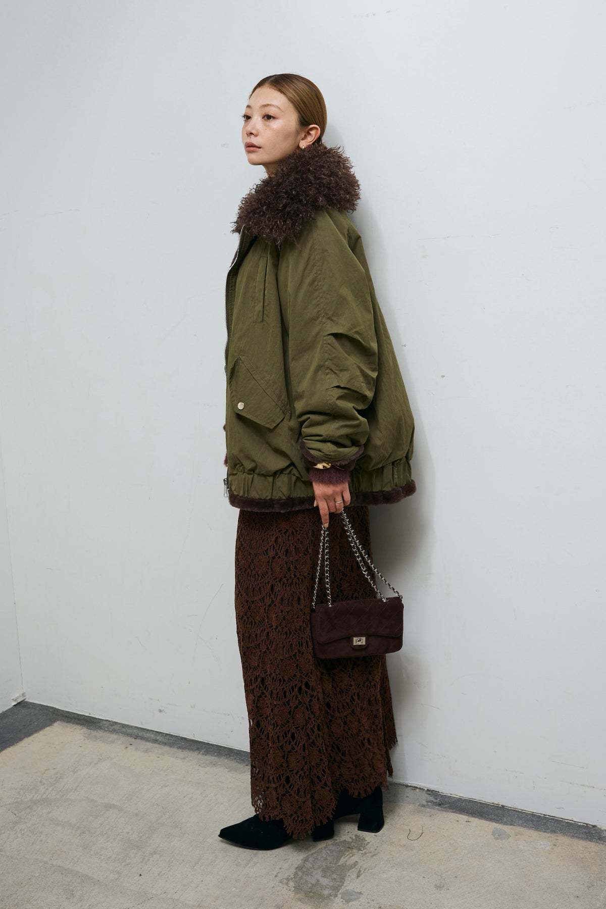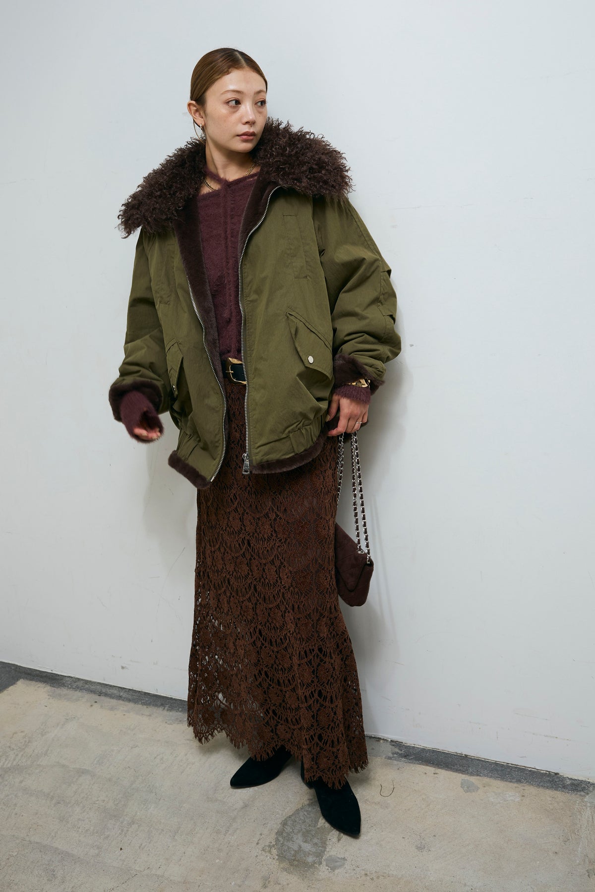 [予約/SET]ボア襟ジップブルゾン+レース刺繍ロングスカート(2set)