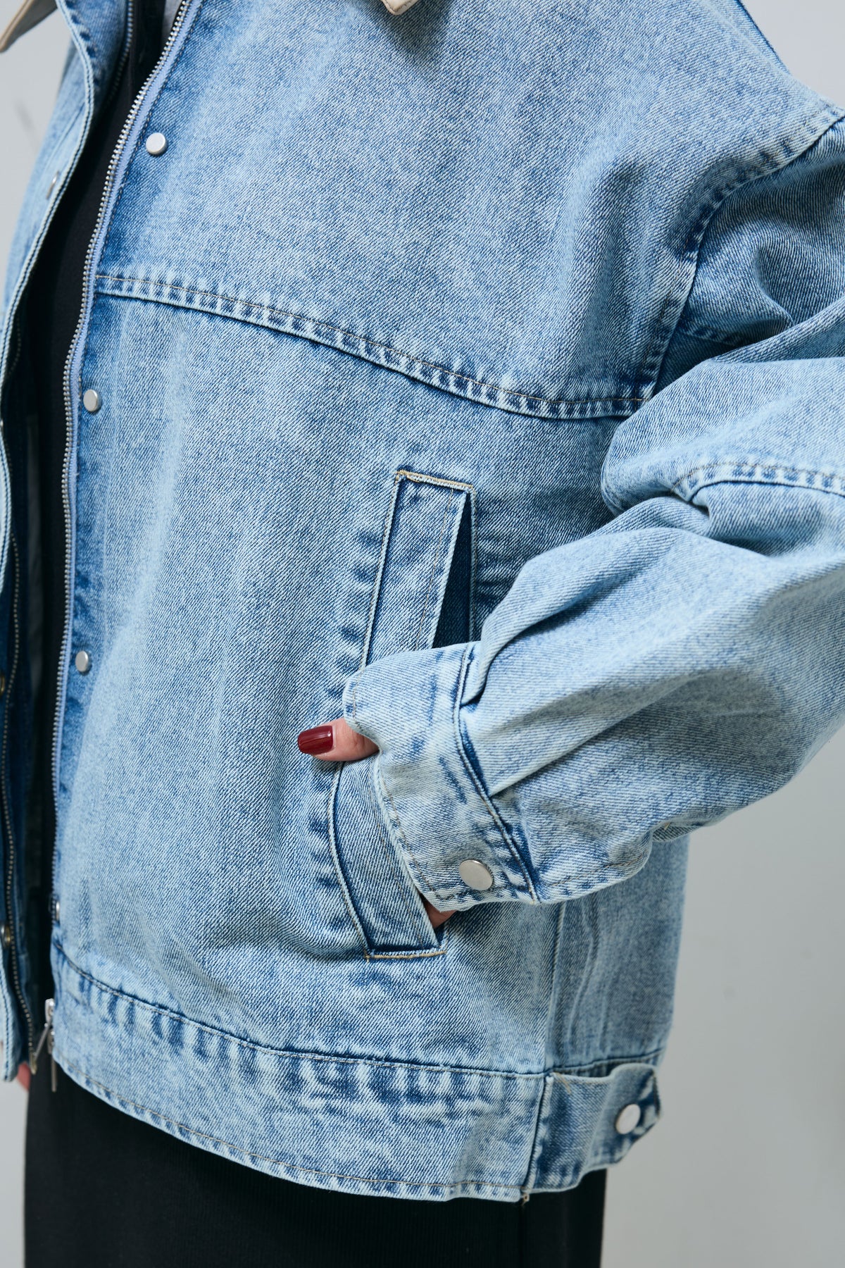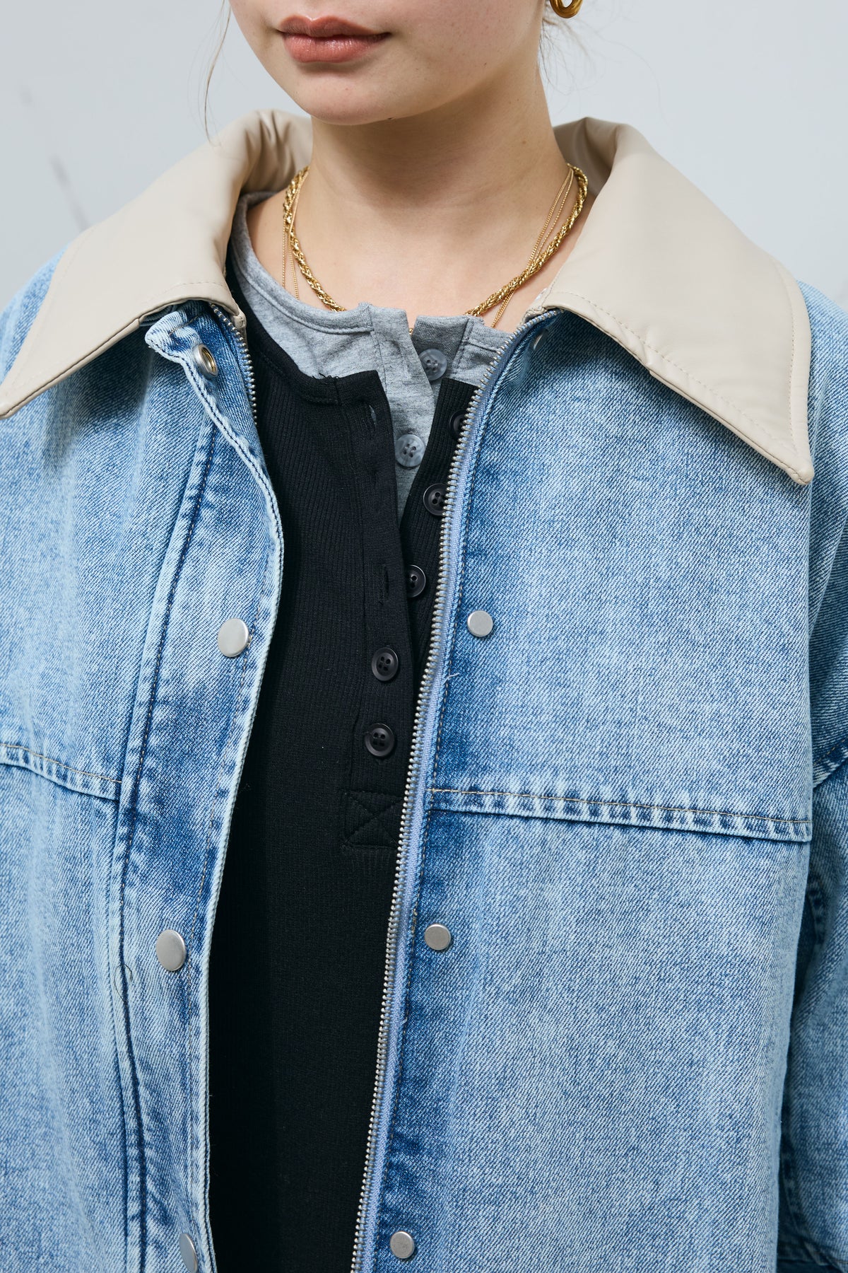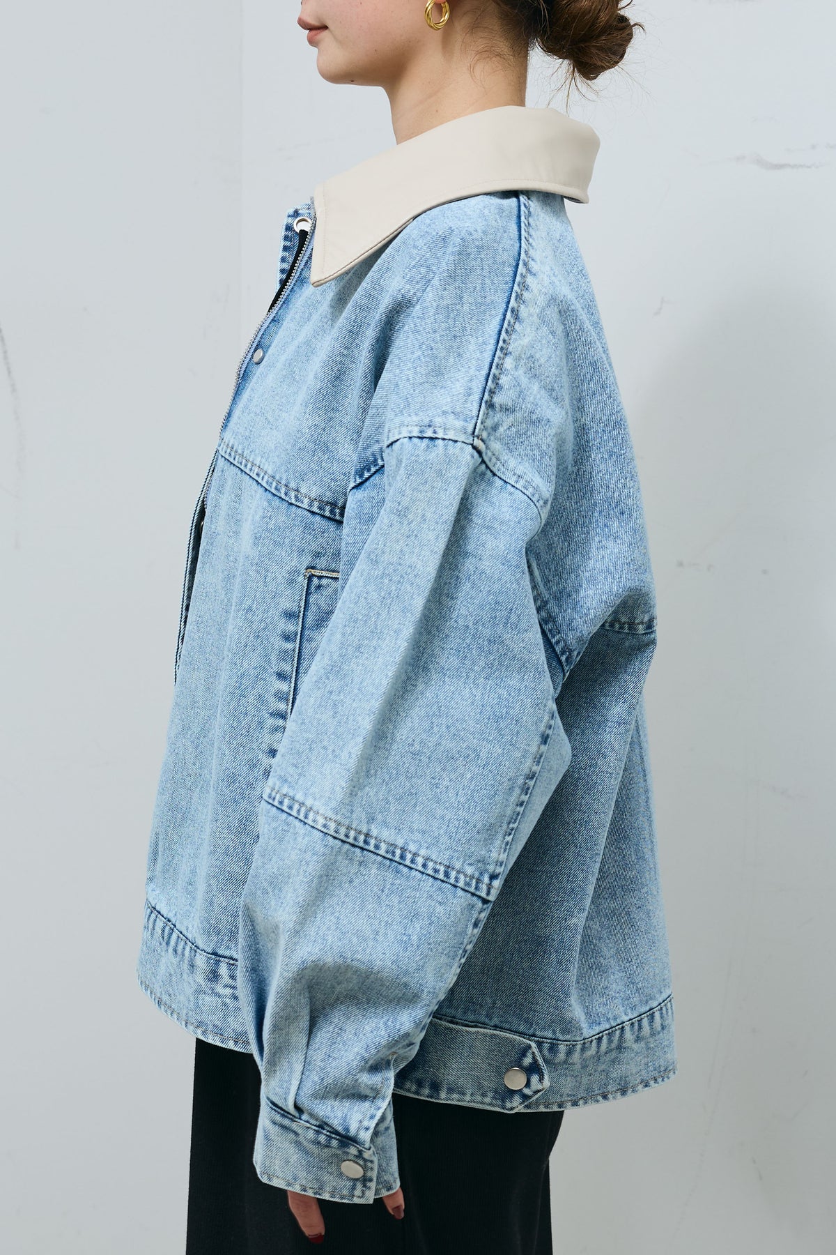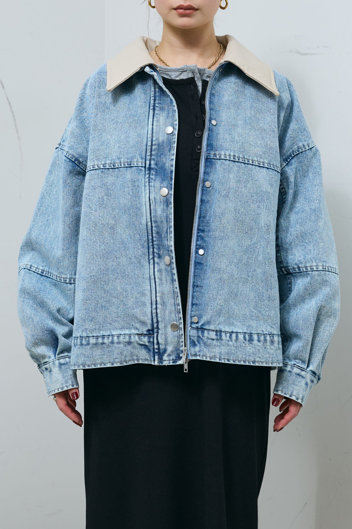 異素材の切り替えが映える、デザイン性の高いデニムブルゾン。襟部分はフェイクレザー仕様で、付け外しができる2wayデザイン。印象を変えながら着用でき、スタイリングの幅が広がります。程よくゆとりのあるシルエットと、切り替え位置を抑えたバランス設計で、カジュアルになりすぎず落ち着いた雰囲気に。ワンピースやスカート合わせでも重たく見えにくく、さっと羽織るだけで全体を引き締めてくれます。季節の変わり目に取り入れやすく、日常使いから外出シーンまで活躍する一着です。