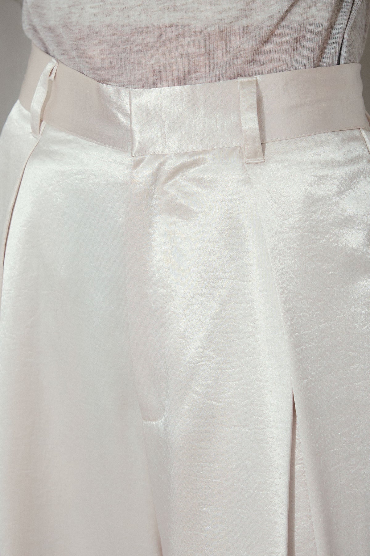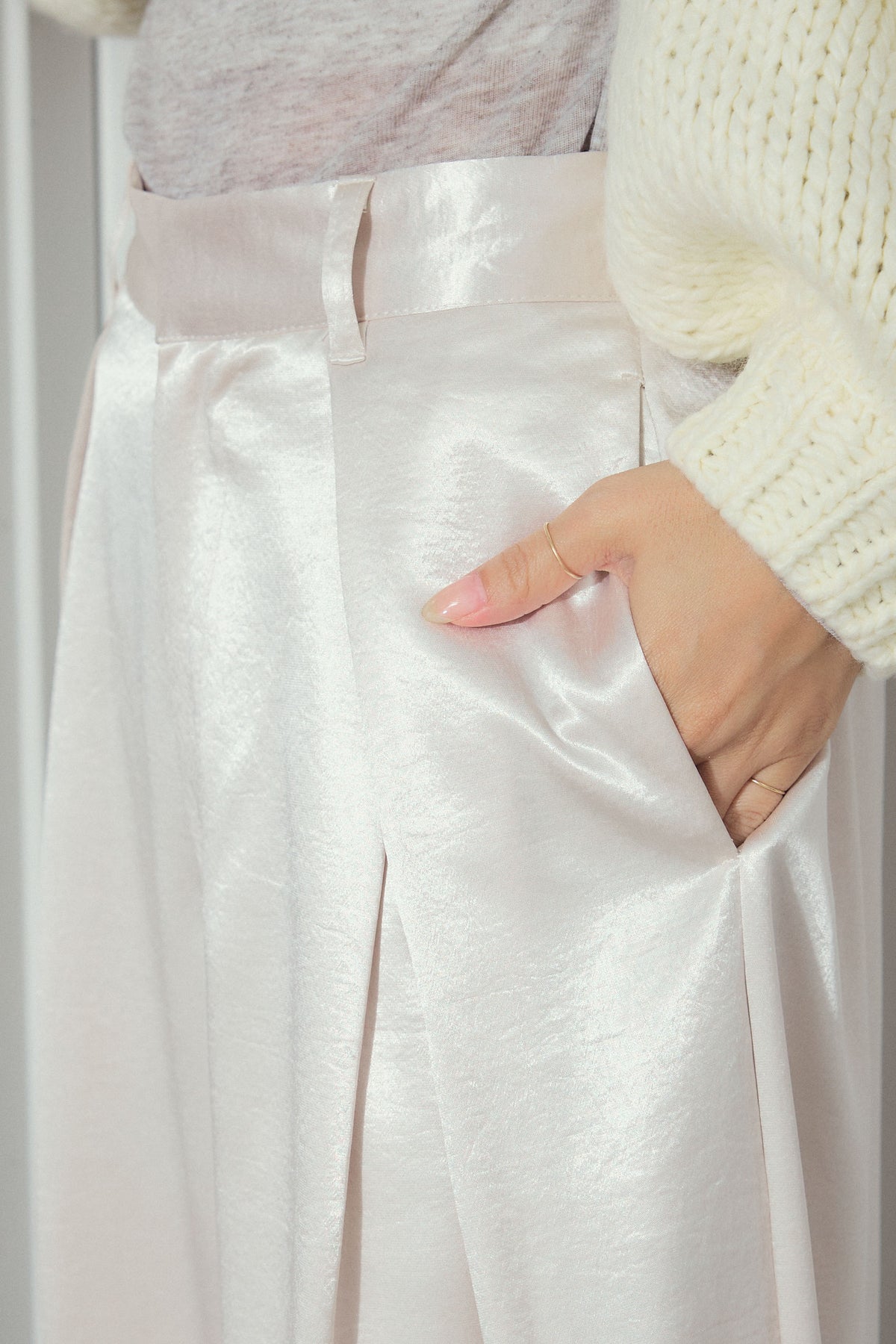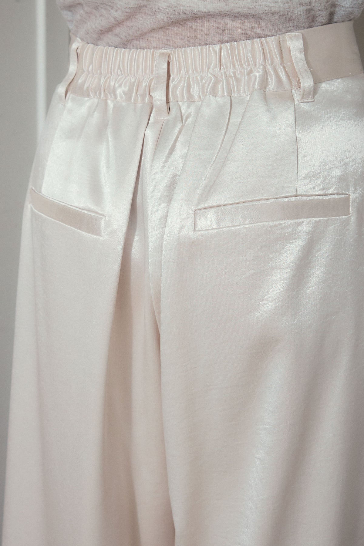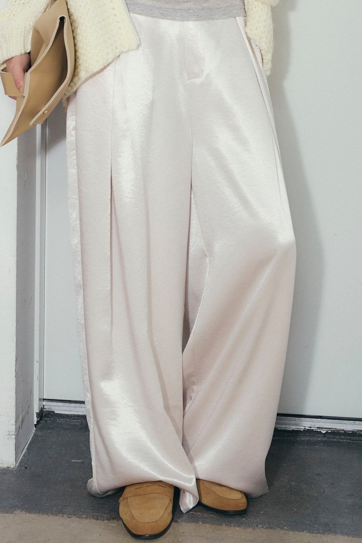 ほどよい光沢感が魅力のサテンタックワイドパンツ。フロントタックが生み出す立体的なシルエットが、動くたびに美しいドレープを描きます。ウエストはすっきり見えるデザインながら、リラックスした穿き心地を叶える仕様。シンプルなトップスを合わせるだけで、洗練されたスタイルが完成する一本です。