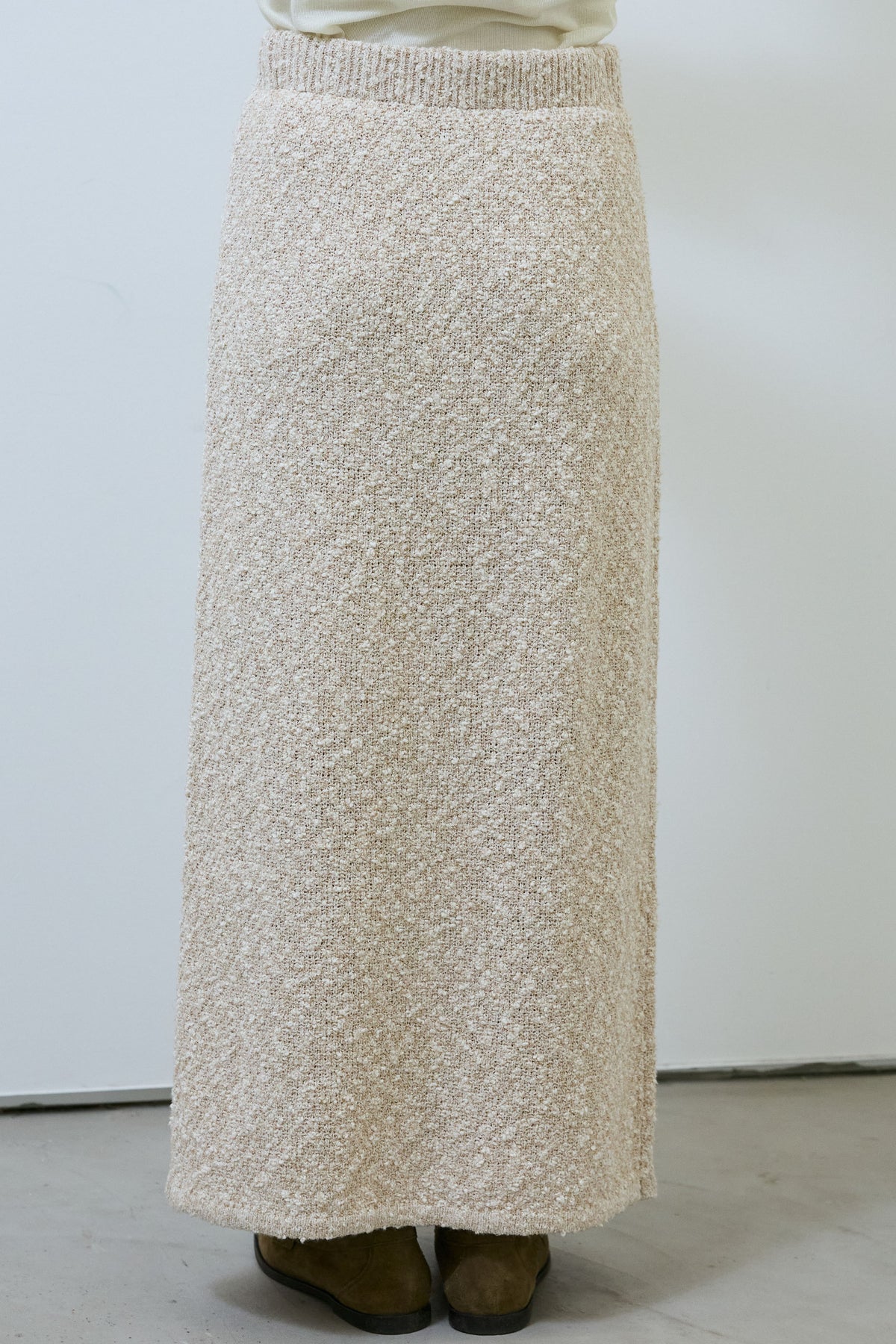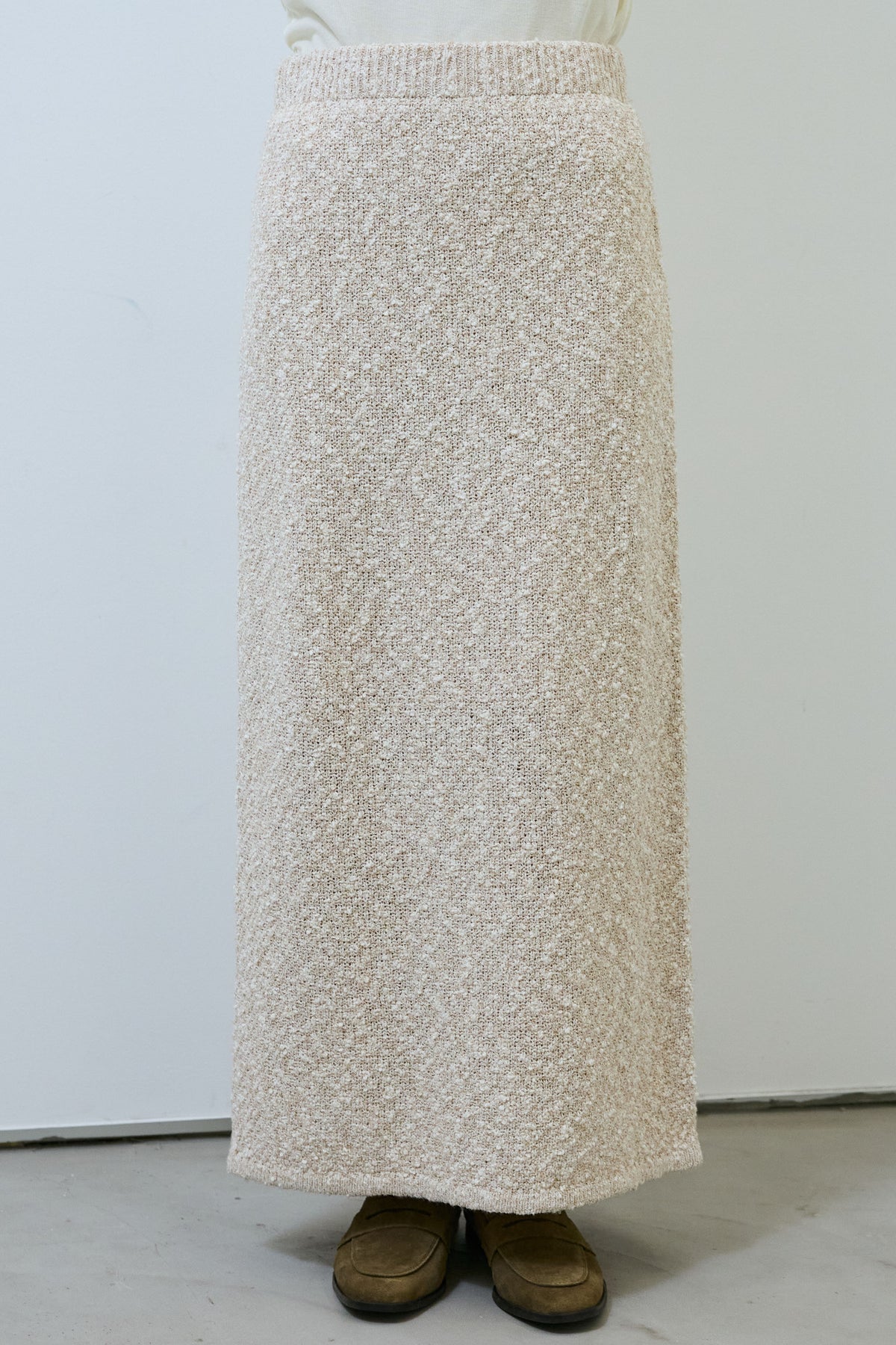 ツイード風の表情がスタイリングに程よいアクセントを添えるMIXスラブスカート。スラブ糸ならではの奥行きある編み地が、シンプルなトップス合わせでも雰囲気のある印象に仕上げます。すとんと落ちるシルエットで、広がりすぎずすっきりとしたバランス。ウエストはリラックス感のある仕様で、デイリーに取り入れやすい一枚です。トップスを選ばず、着こなしの幅が広がるアイテム。