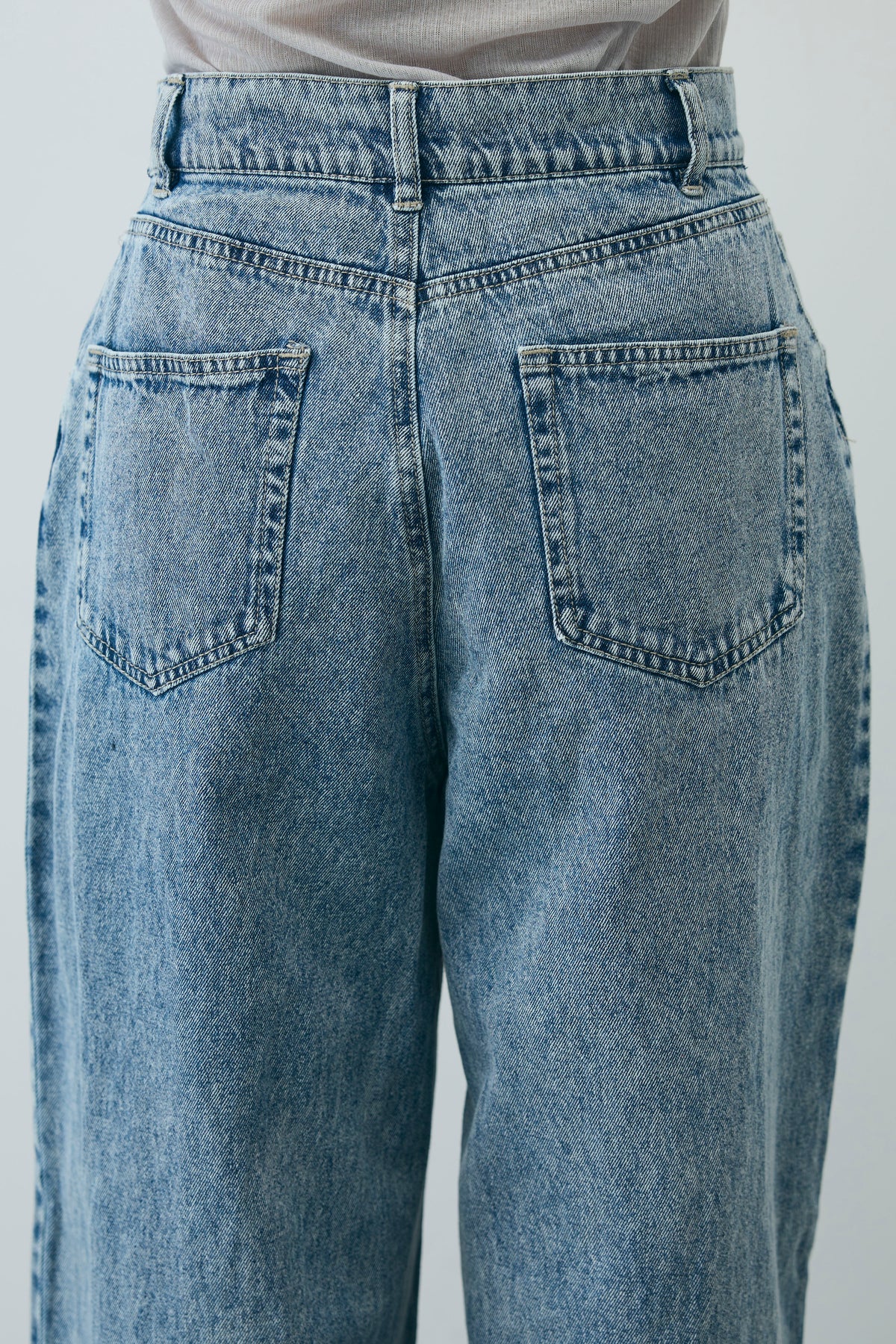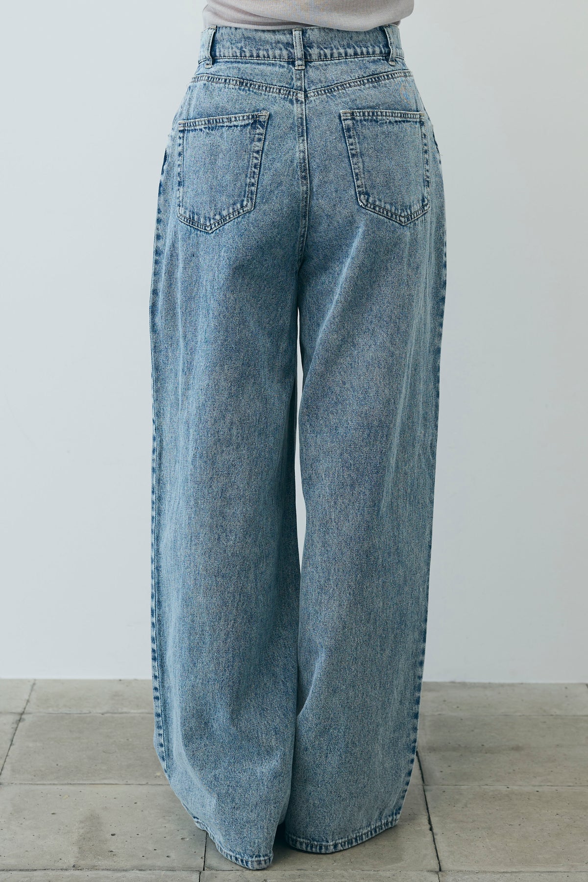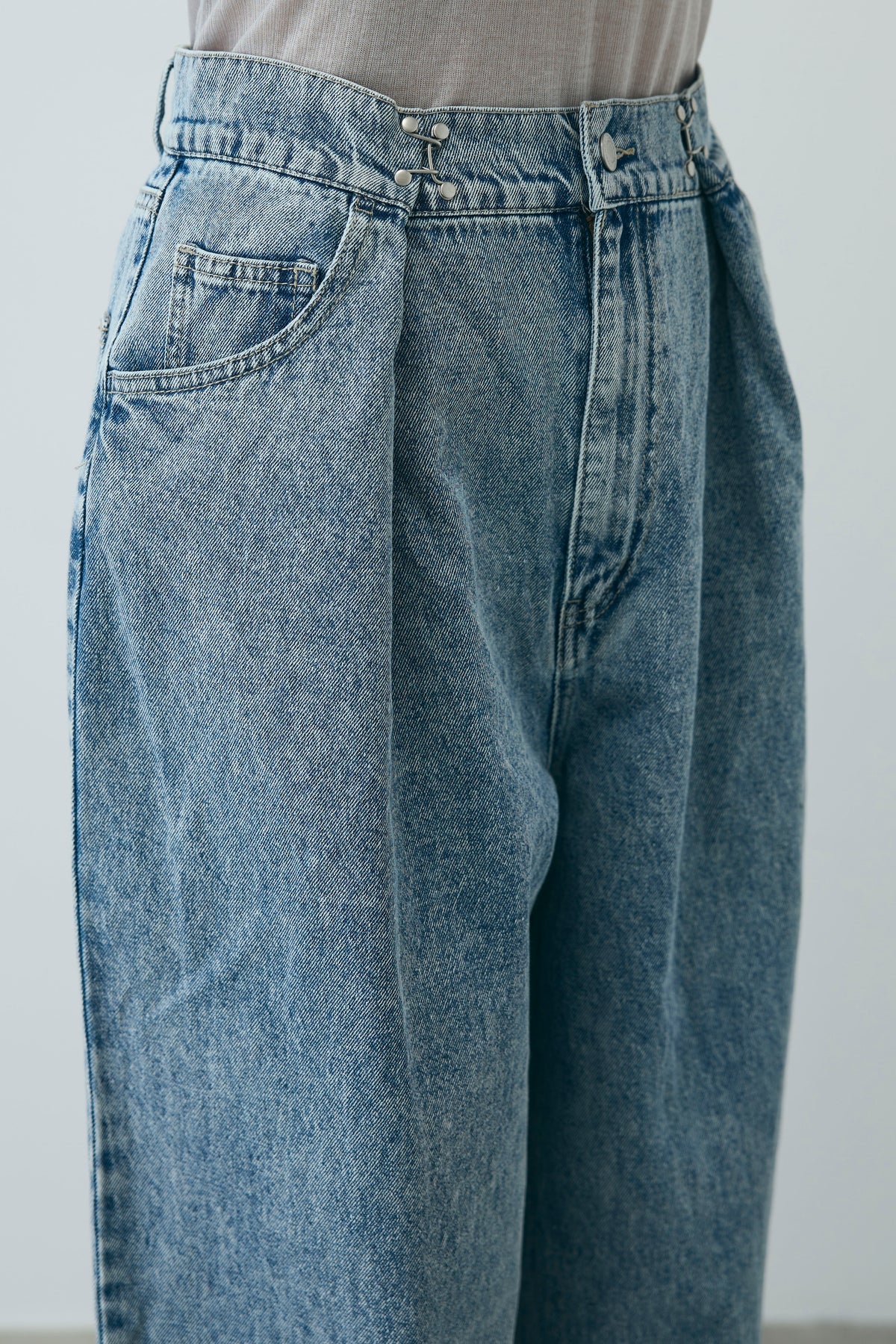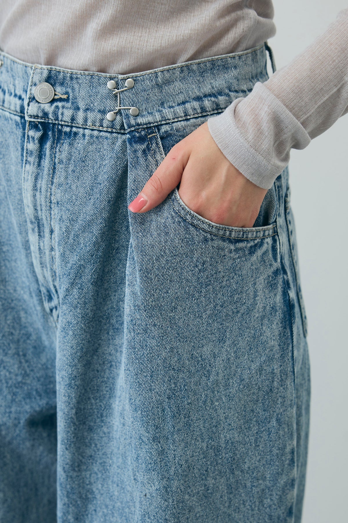 ウエスト部分にホックディテールを施したワイドデニム。ヴィンテージライクな風合いが魅力で、カジュアルな中にも洗練された印象をプラスします。ゆったりとしたシルエットが体型カバーを叶え、リラックス感のある着心地を実現。Tシャツやシャツ、コンパクトなトップスと合わせるだけで、バランスの良いスタイリングが完成します。普段使いからお出かけまで幅広く活躍する一本です。