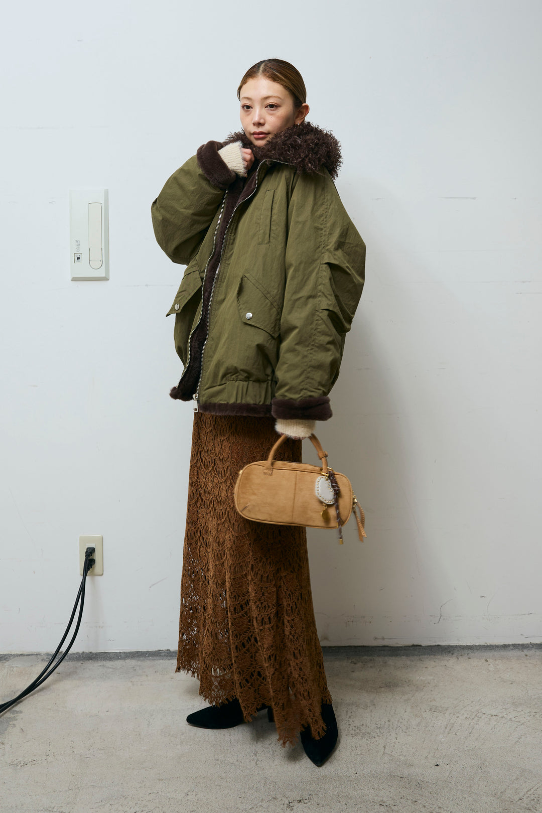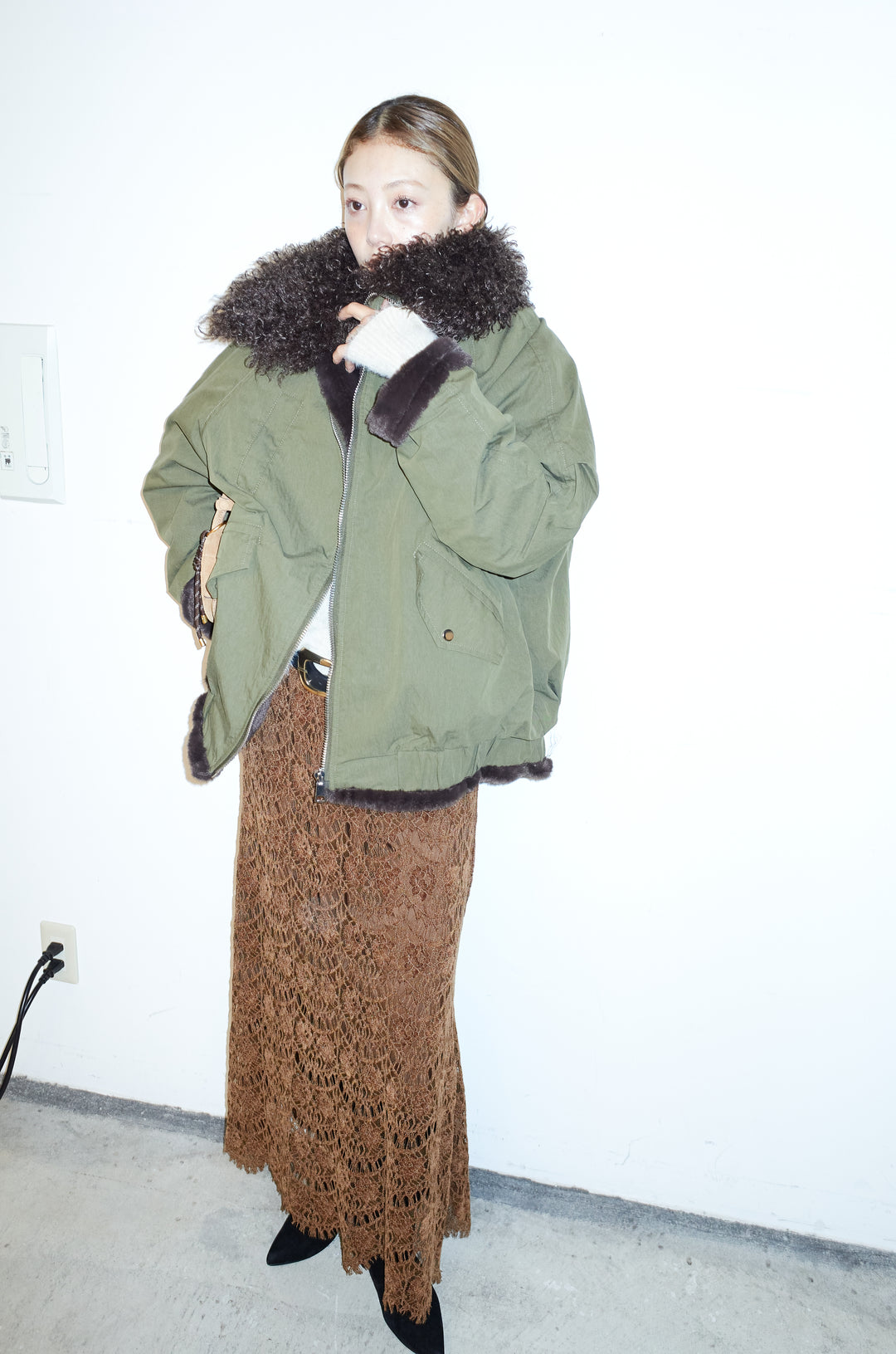 [予約/SET]ボア襟ジップブルゾン+レース刺繍ロングスカート(2set)