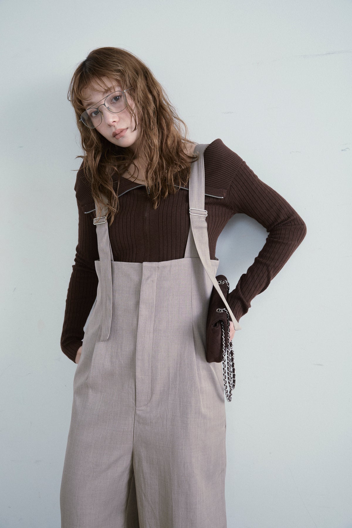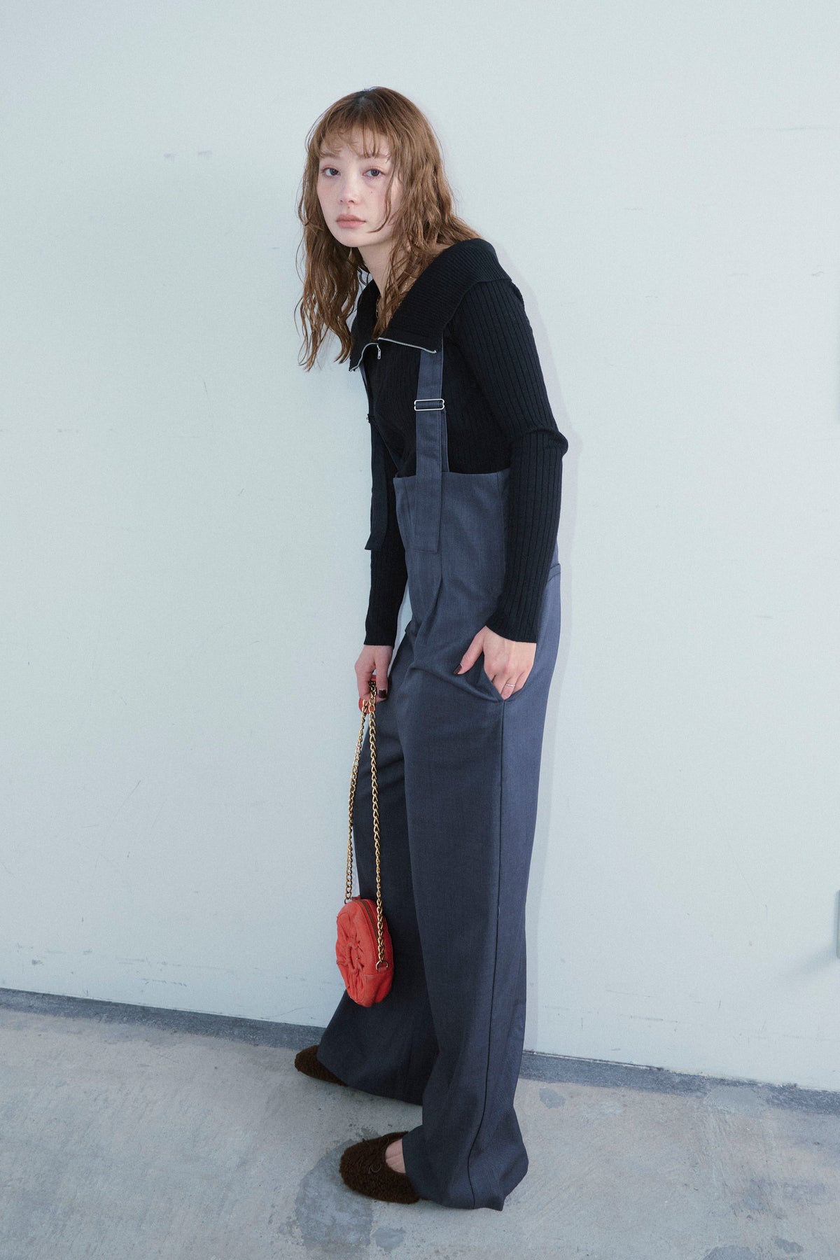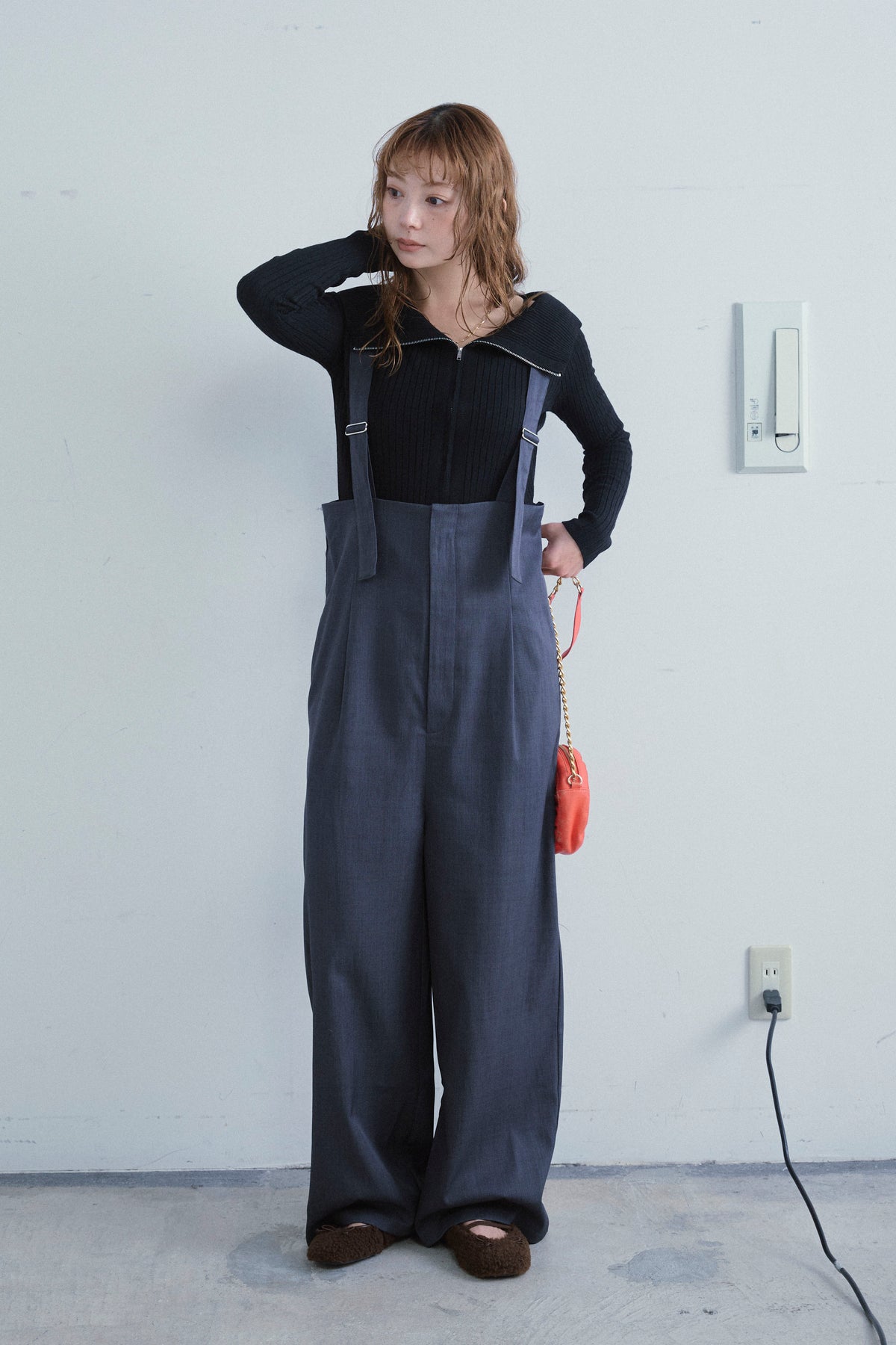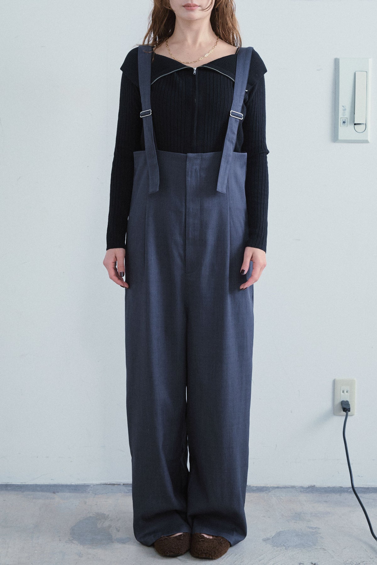 [予約/SET]ダブルジップオフショルリブニット+ハイウエストワイドサロペット(2set)