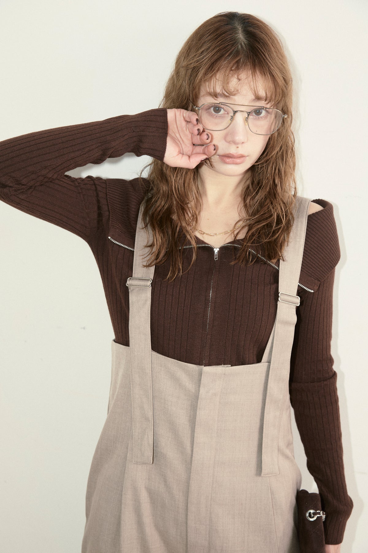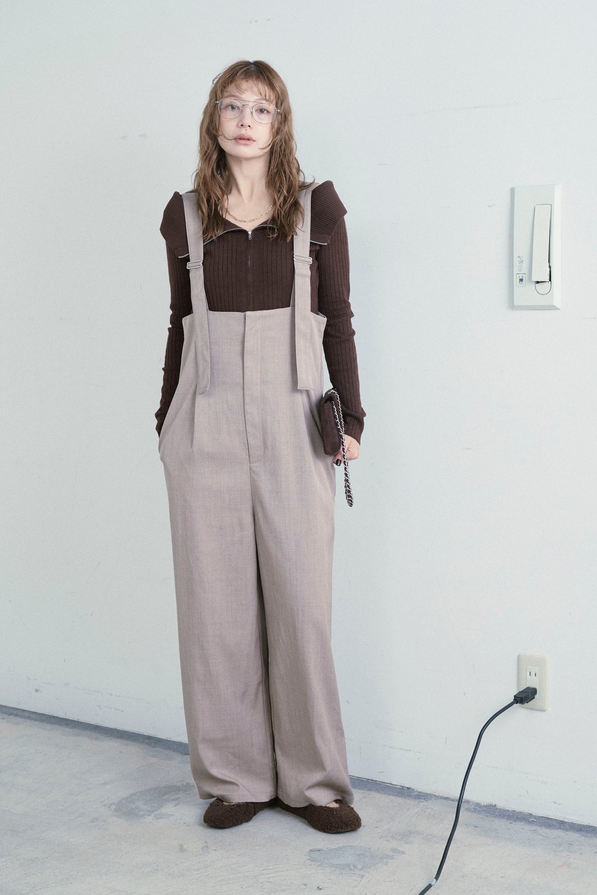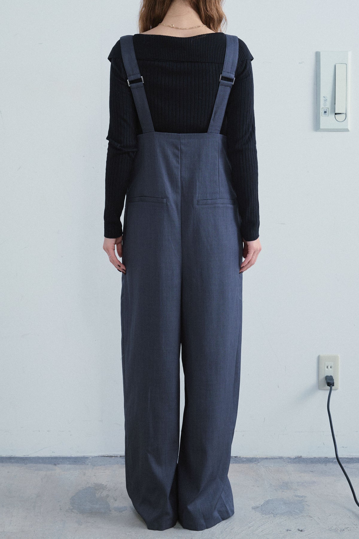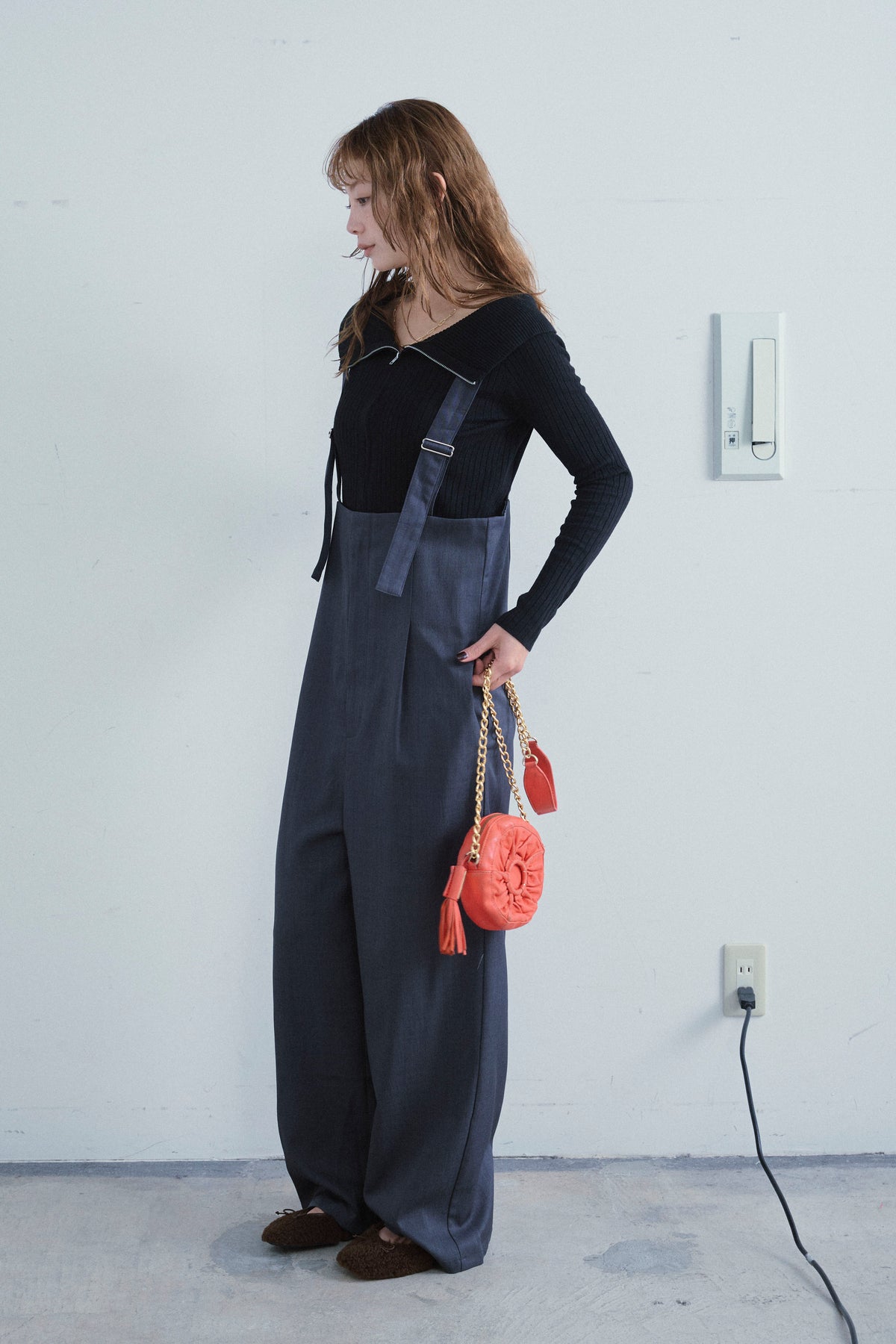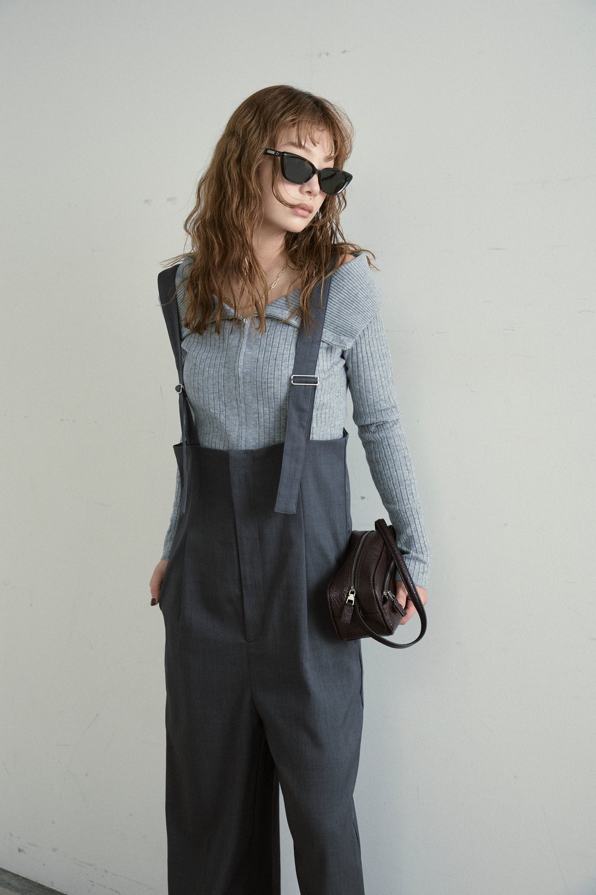 [予約/SET]ダブルジップオフショルリブニット+ハイウエストワイドサロペット(2set)