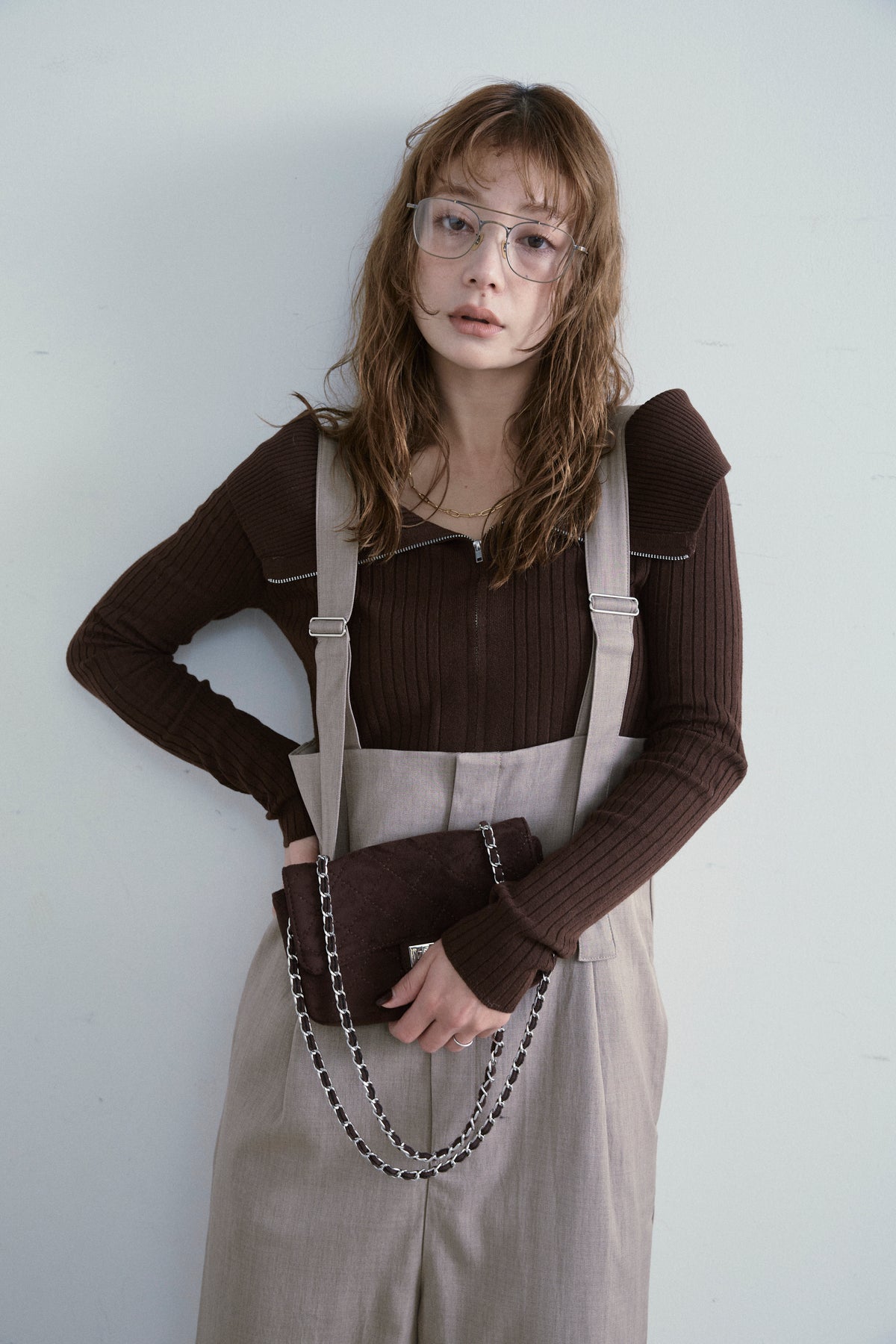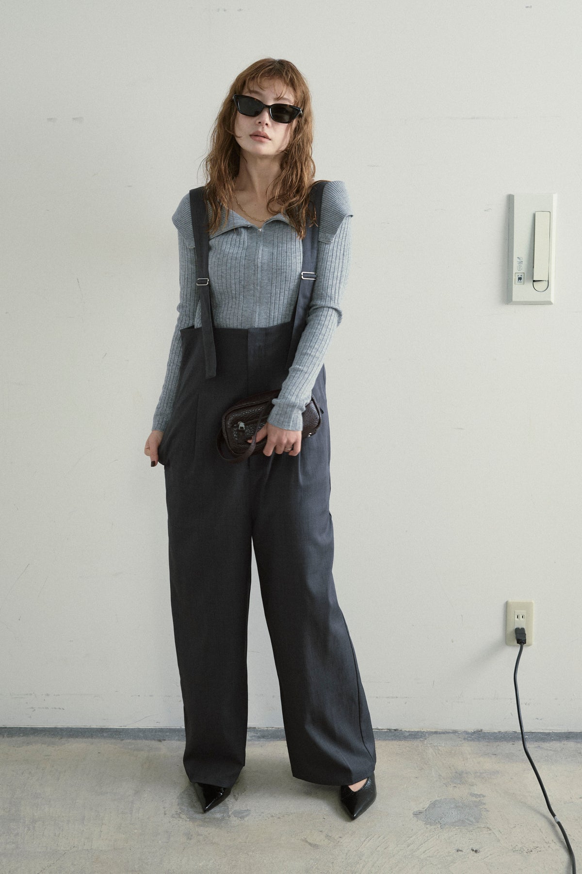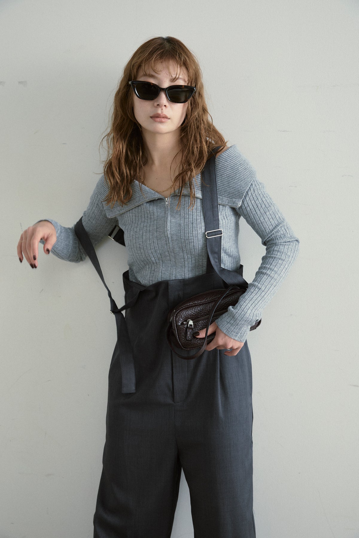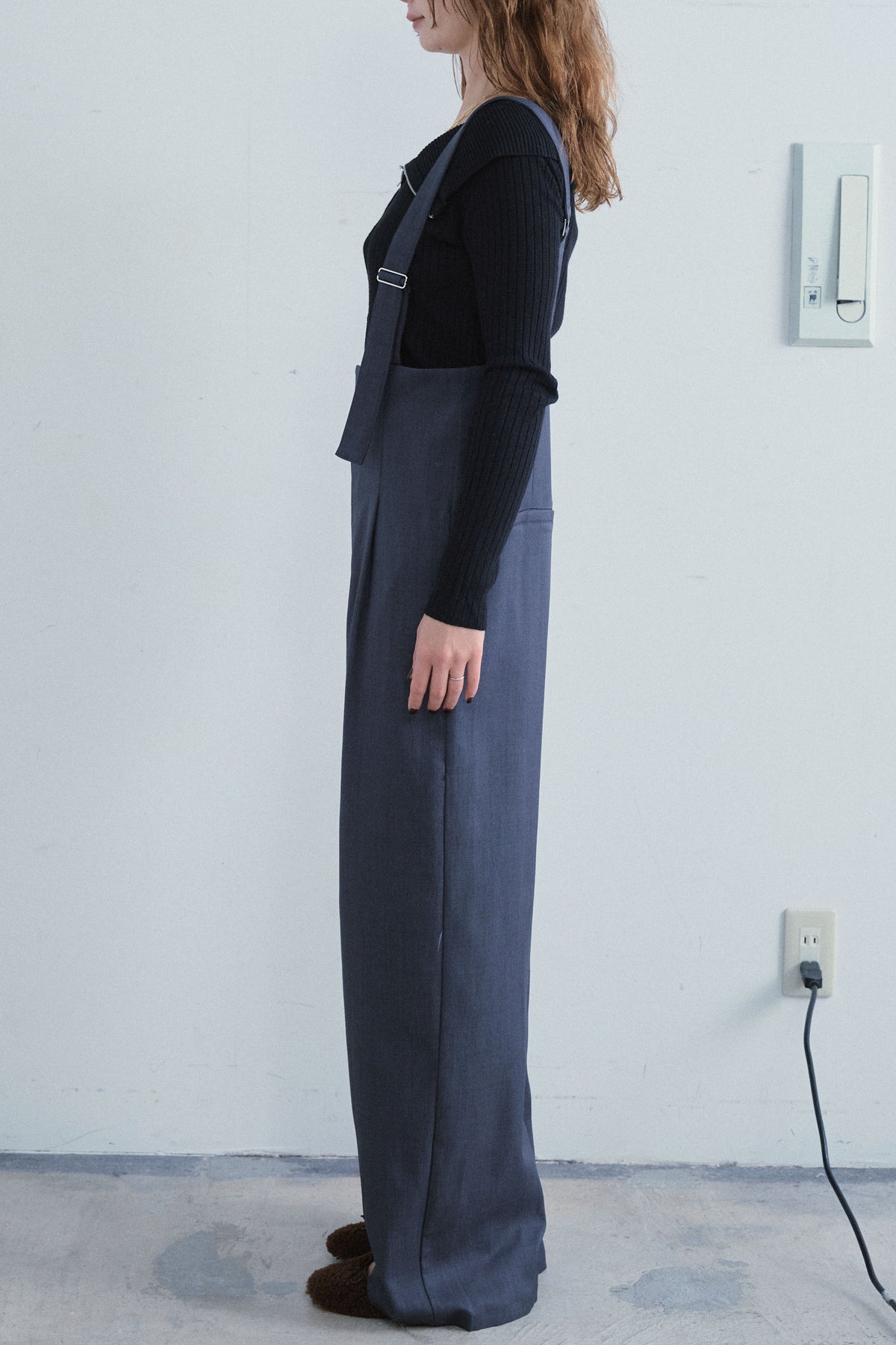 [予約/SET]ダブルジップオフショルリブニット+ハイウエストワイドサロペット(2set)