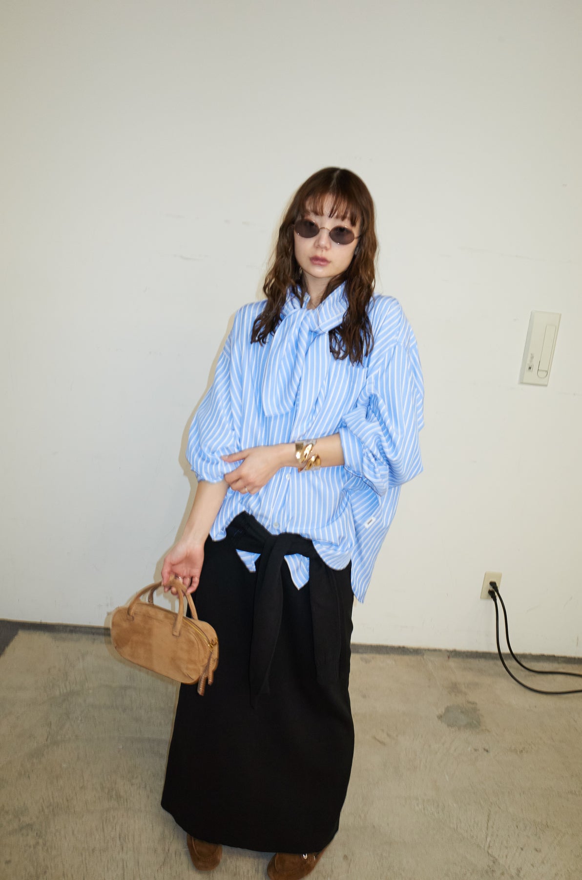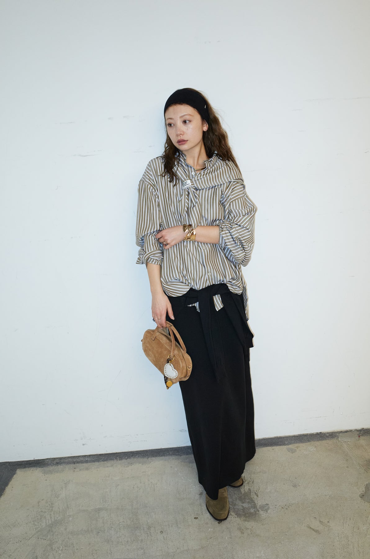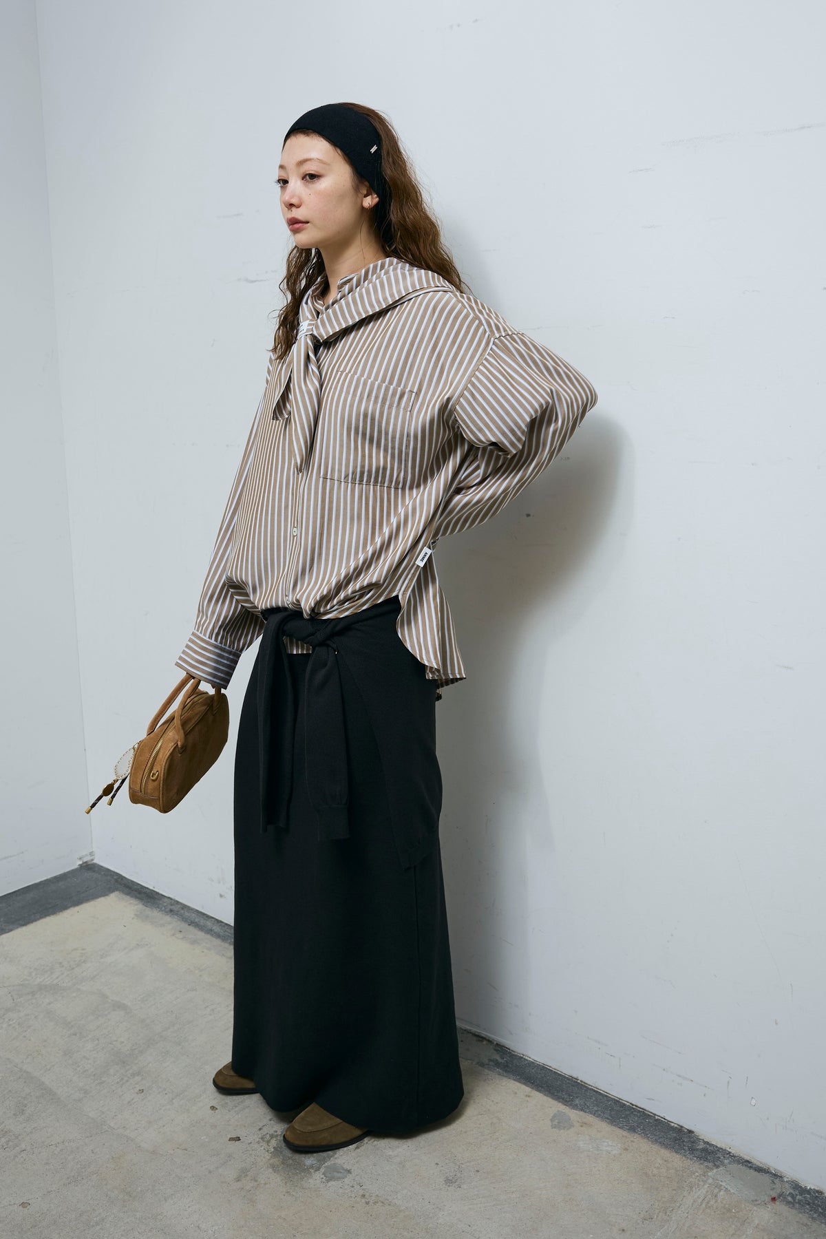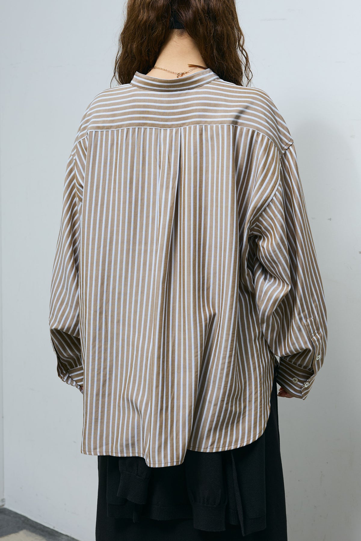 [予約/SET]レーヨンストライプバンドカラーシャツ+フェイクレイヤードニットスカート(2set)
