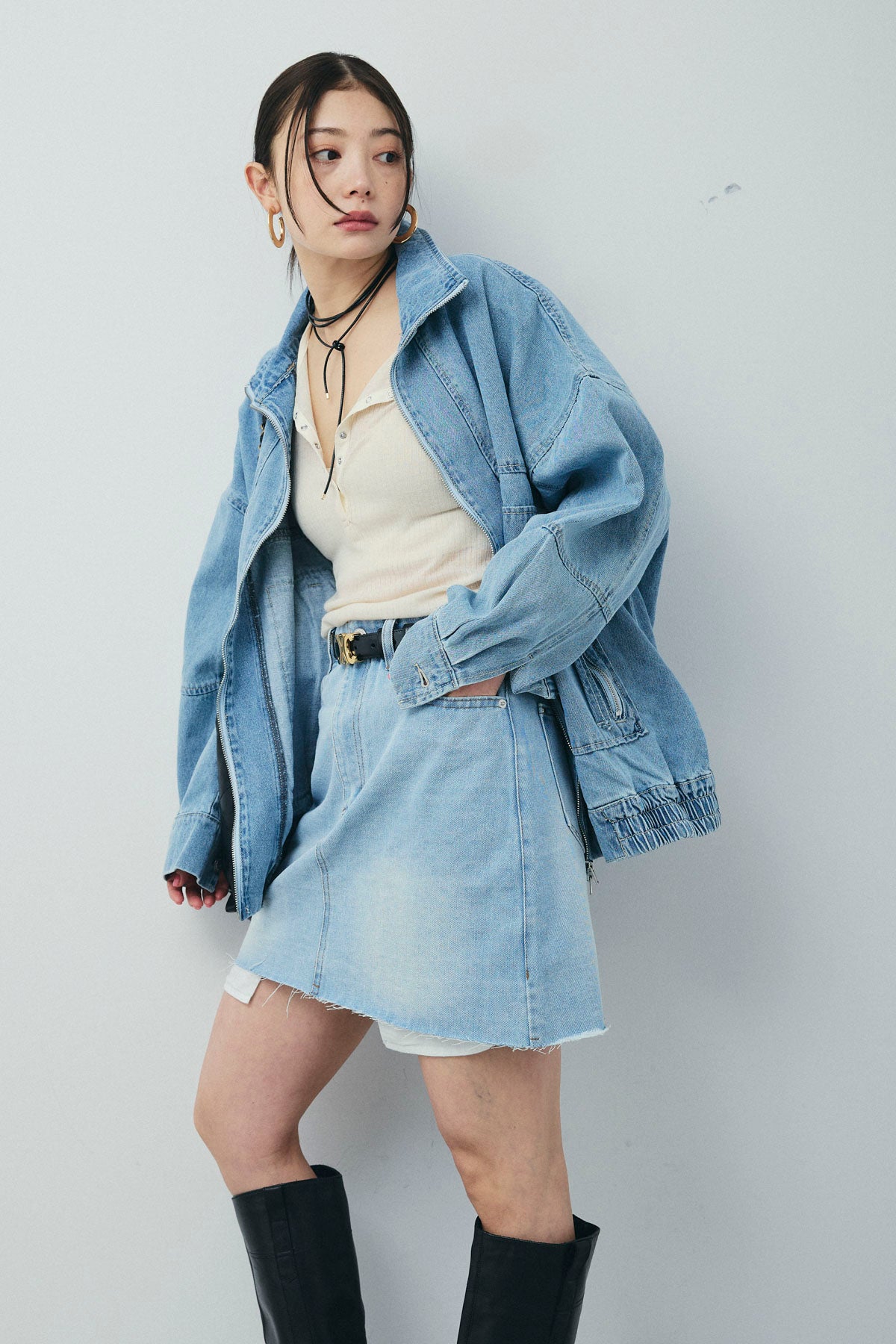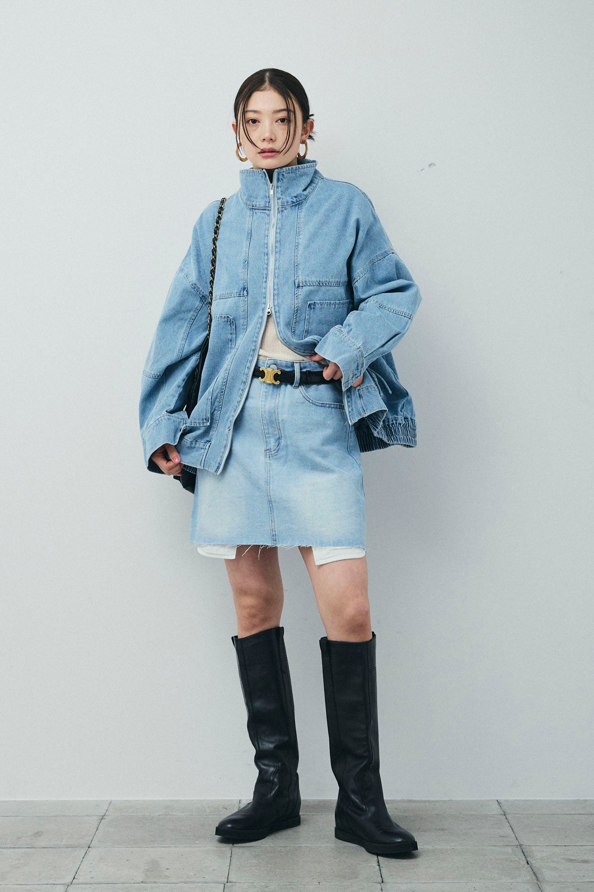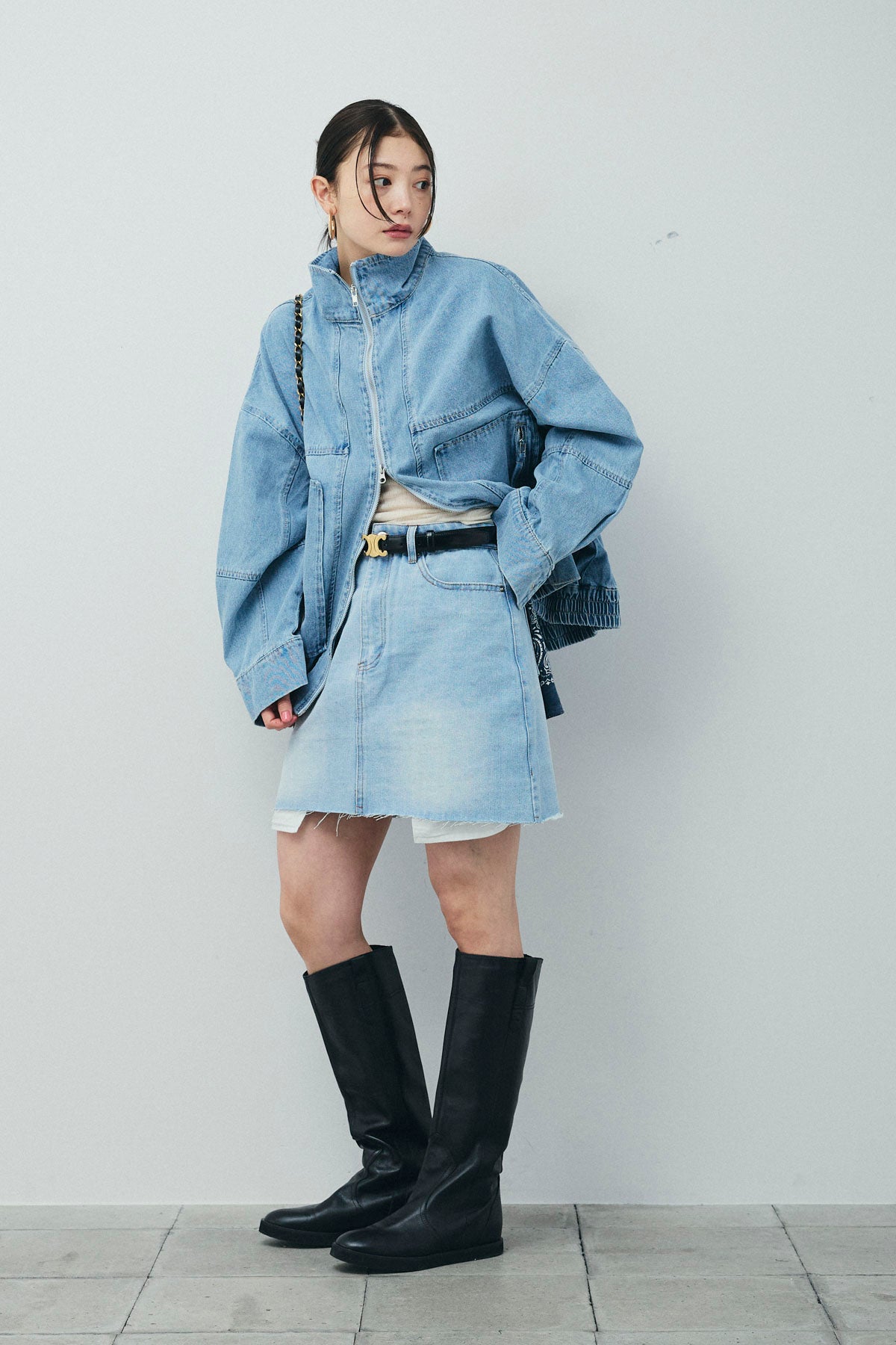 [予約/SET]ダブルジップスタンドカラーデニムブルゾン+デニムミニスカート(2set)