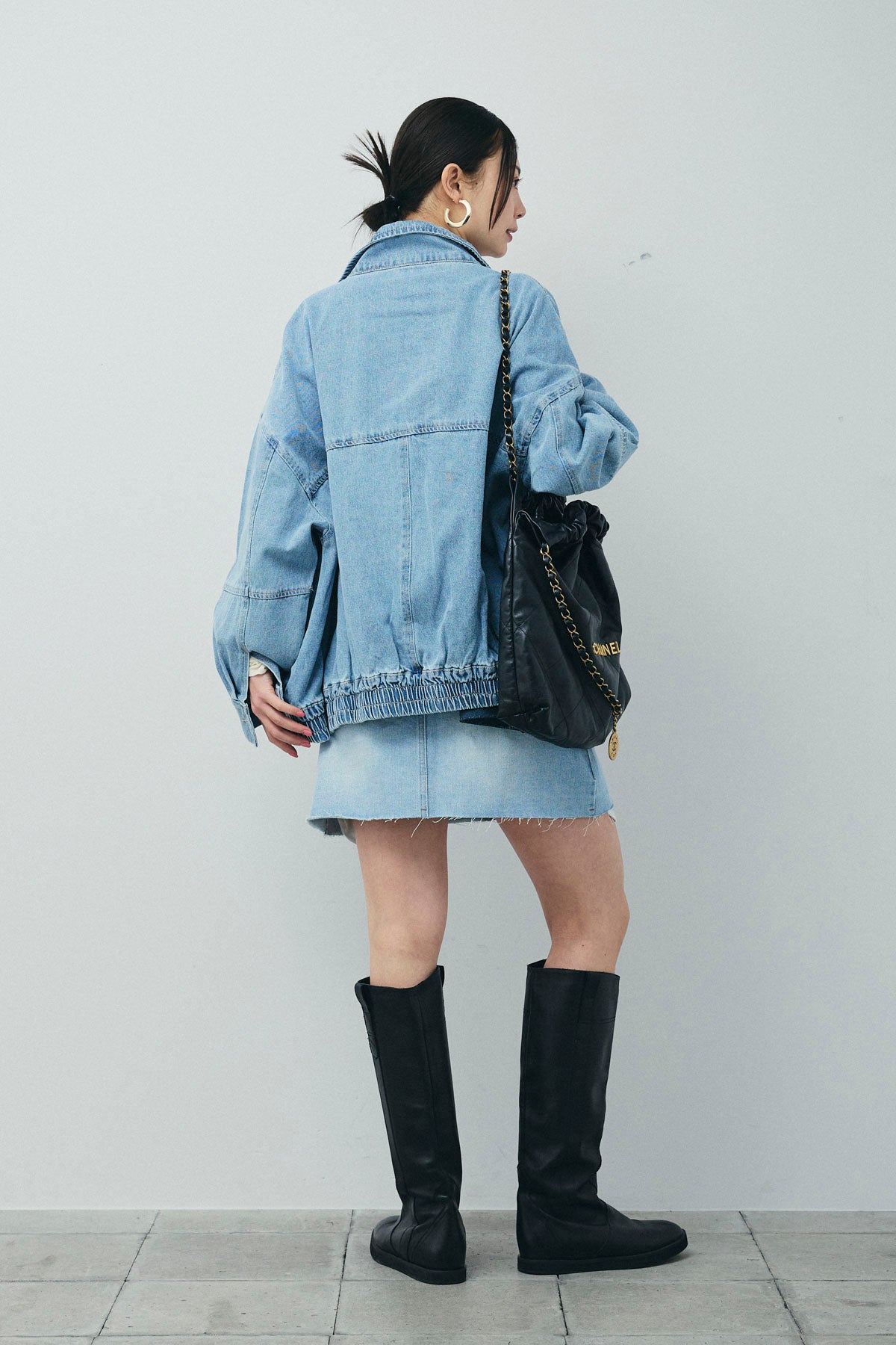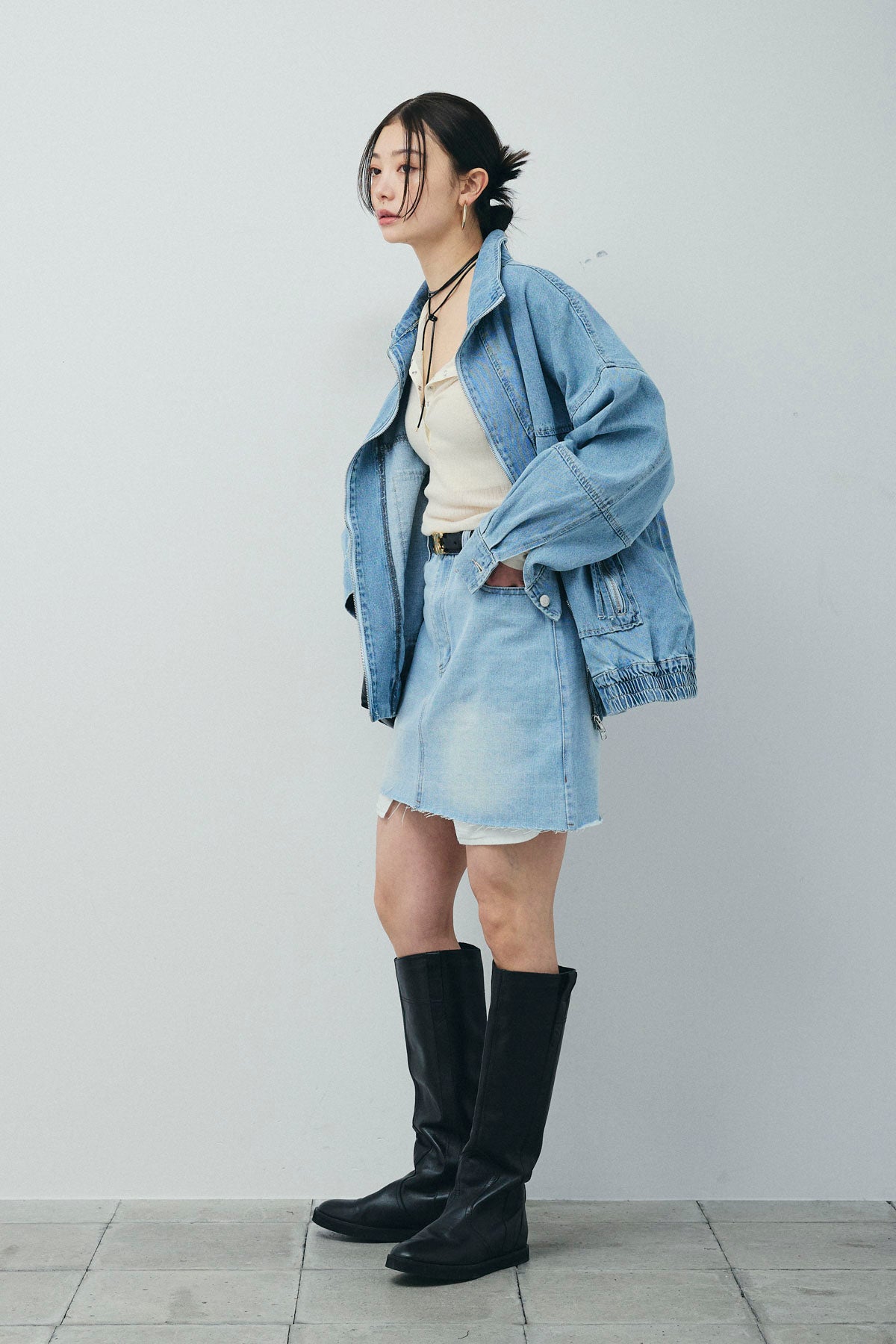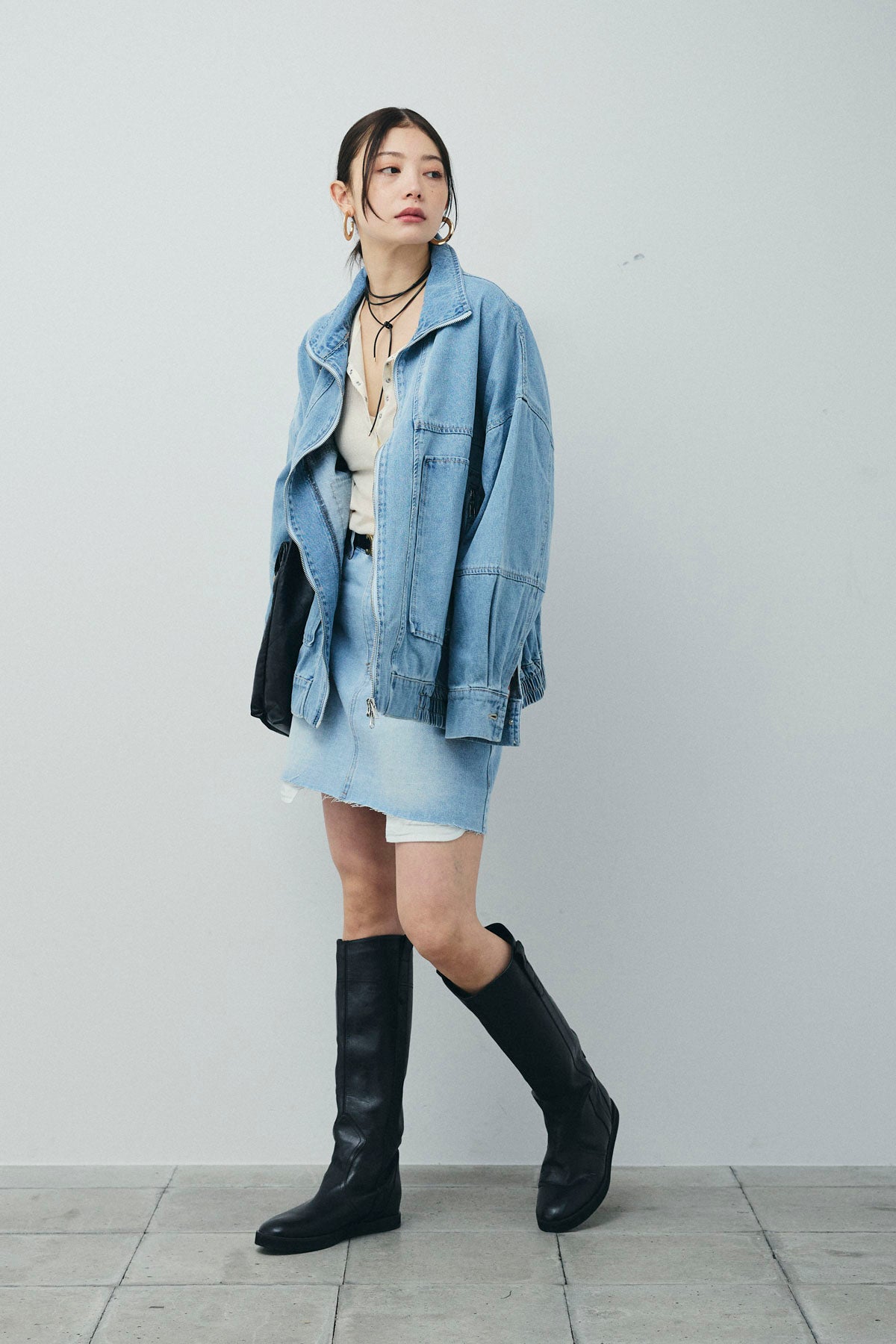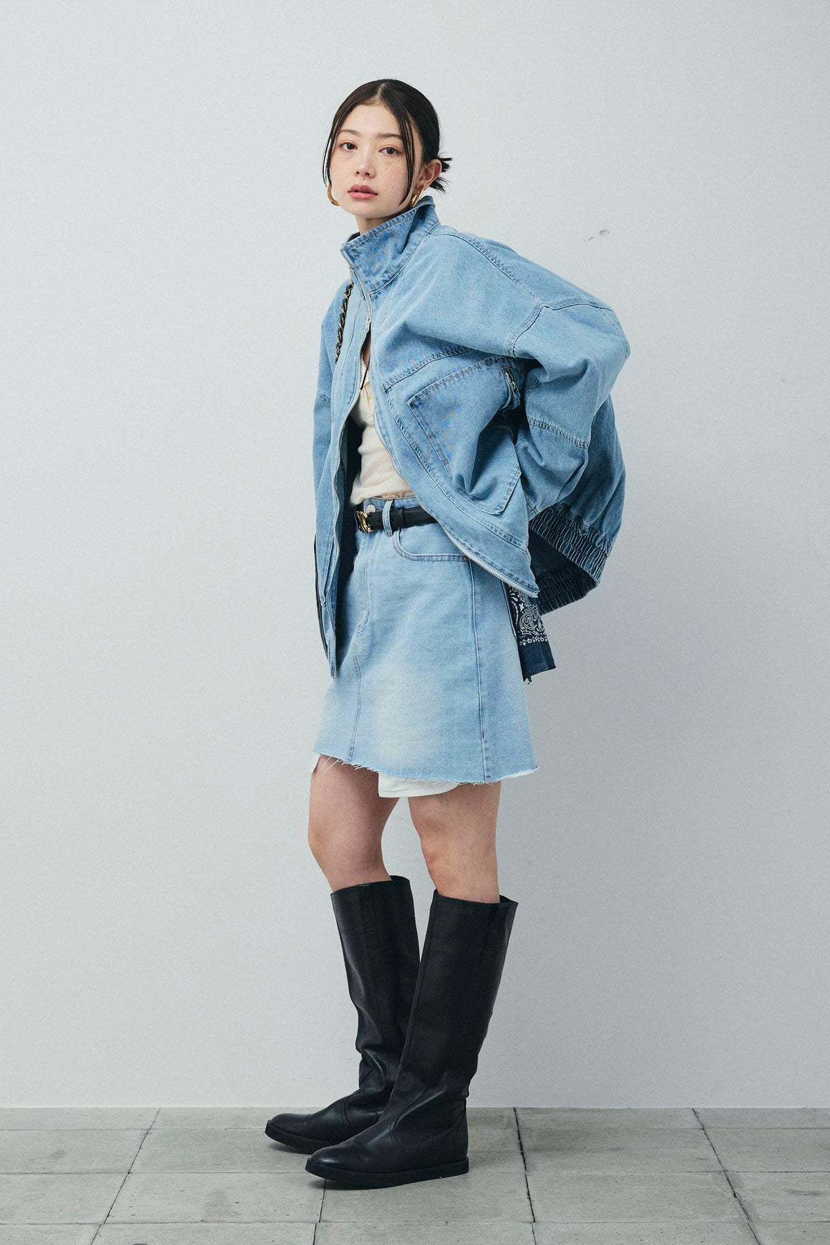 [予約/SET]ダブルジップスタンドカラーデニムブルゾン+デニムミニスカート(2set)