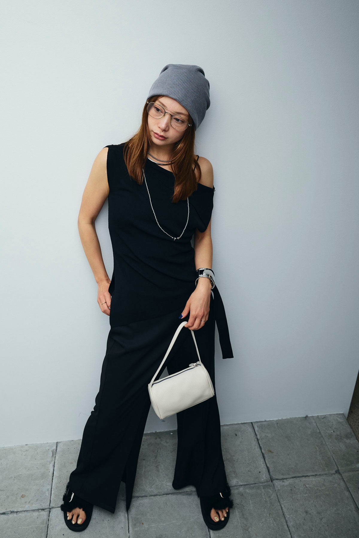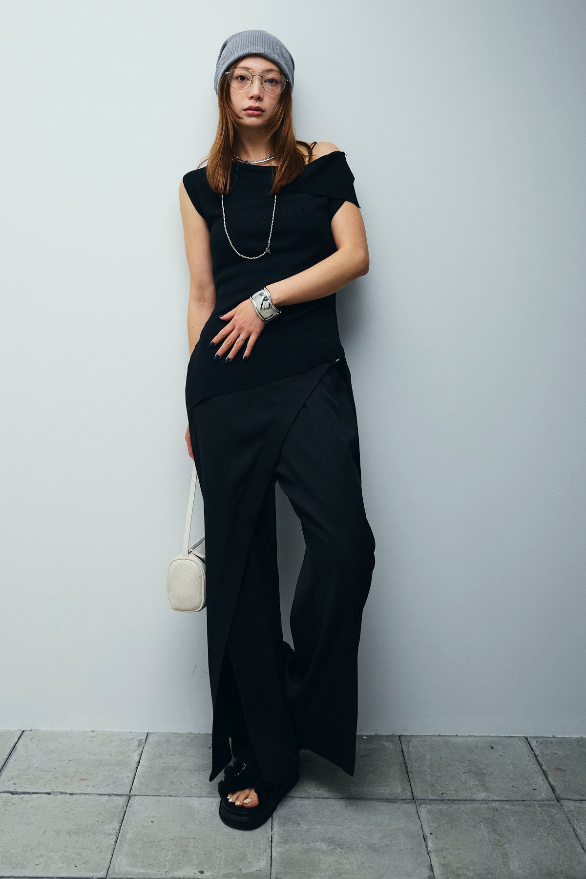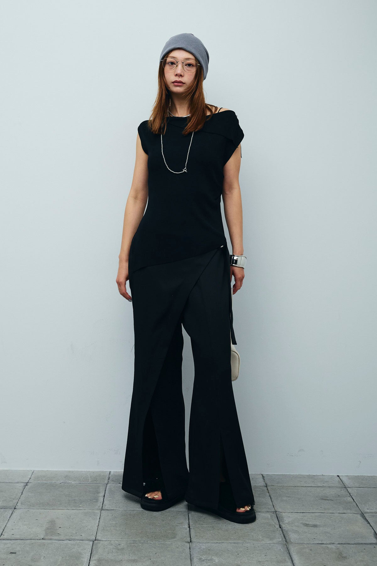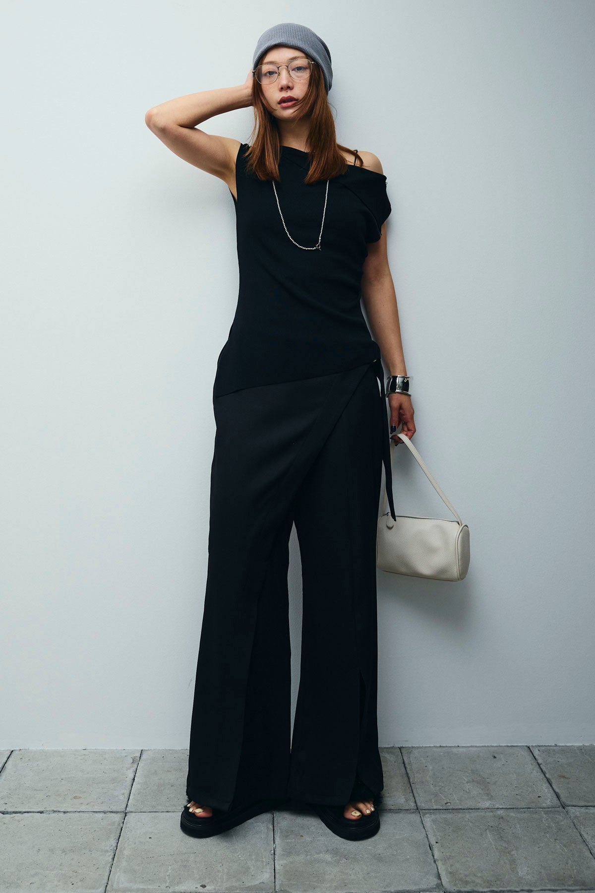 [予約/SET]アシンメトリーオフショルサマーニット+スリットラップパンツ(2set)