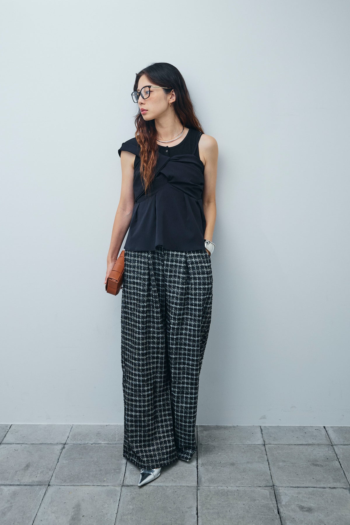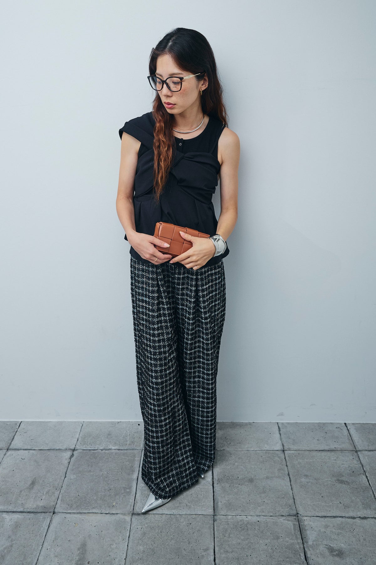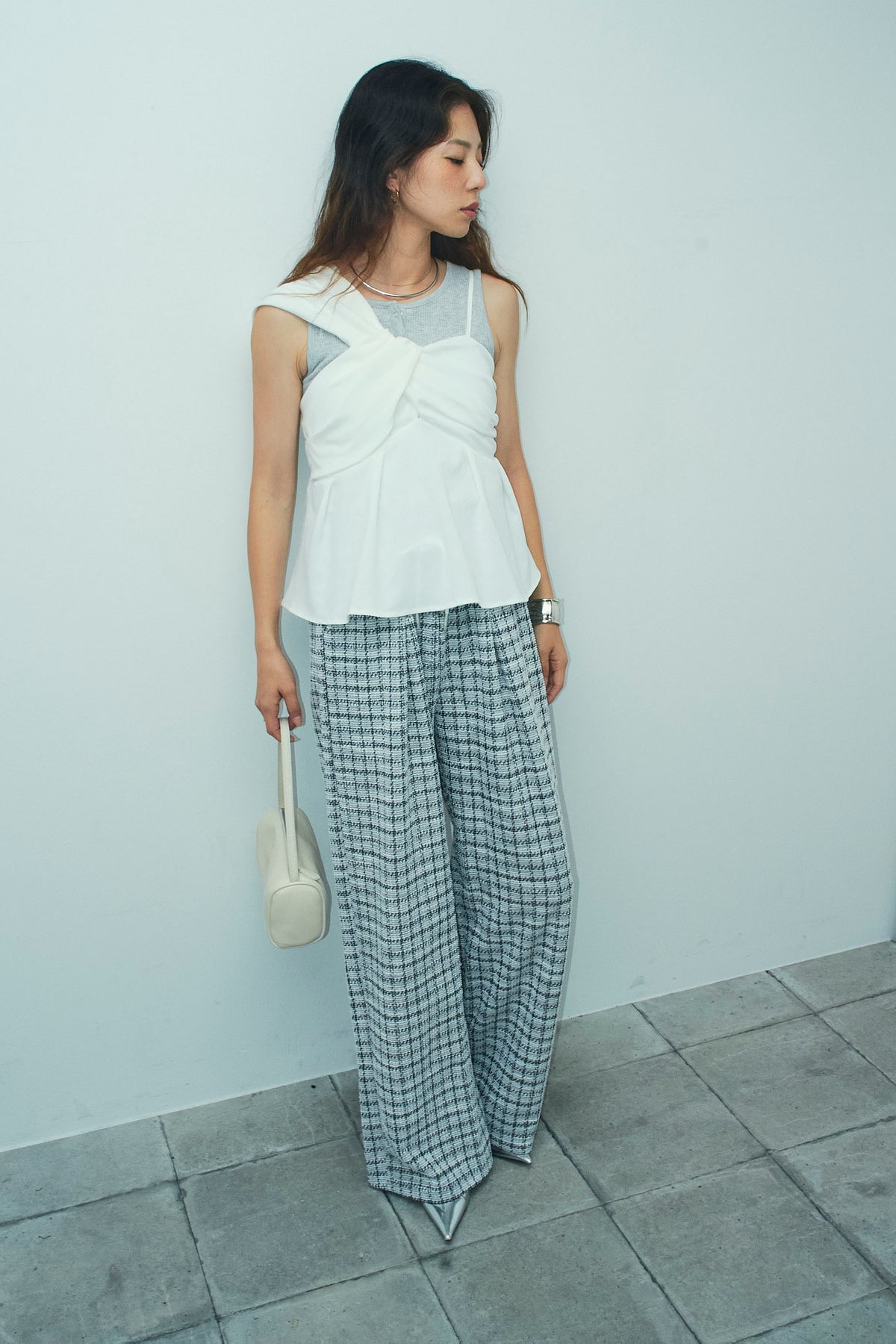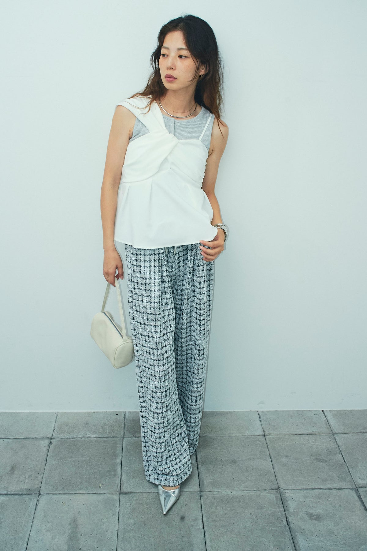[予約/SET]アシンメトリーキャミソール+セルフカットリブヘンリーネックノースリーブトップス+サマーツイードリラックスパンツ(3set)