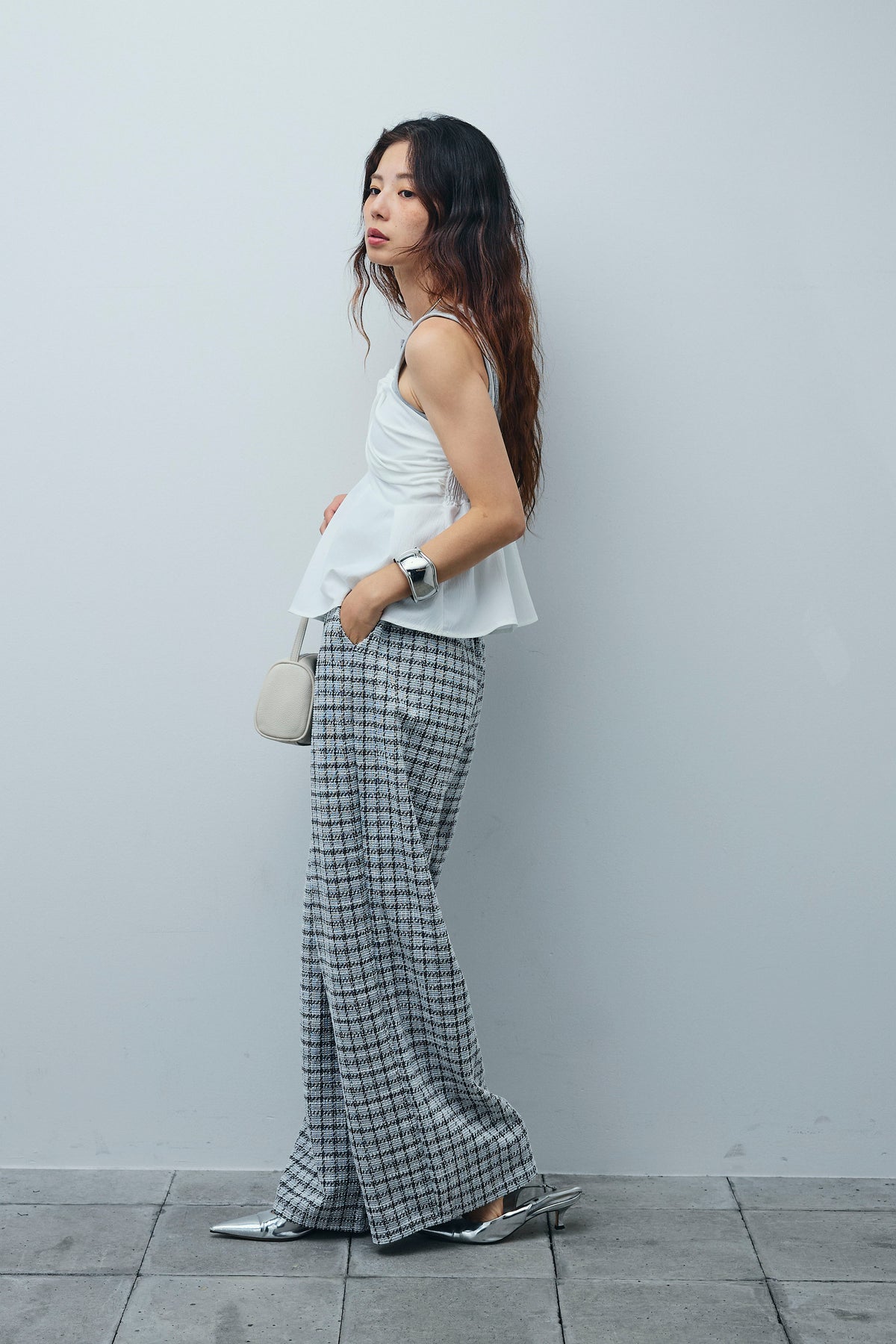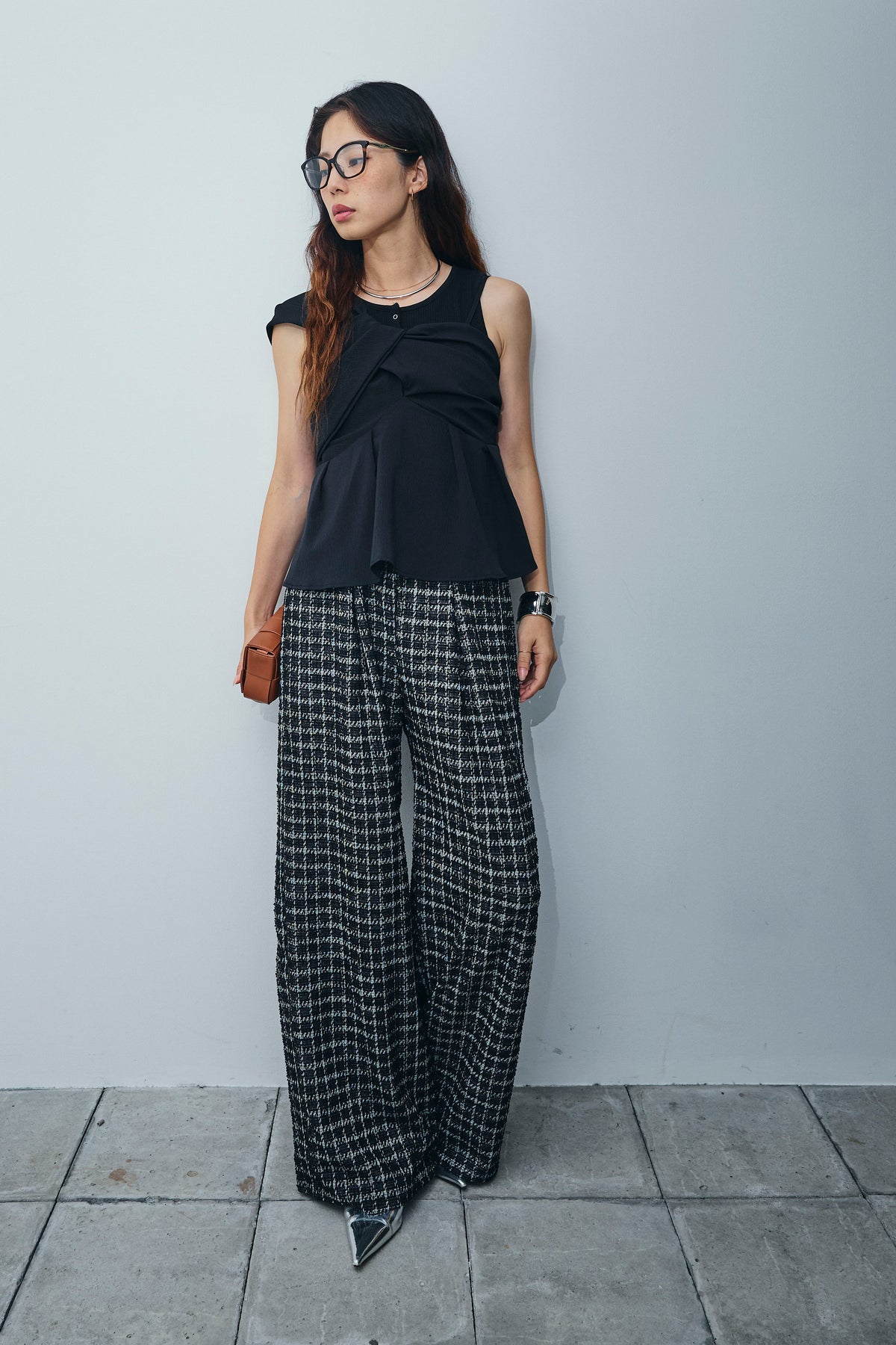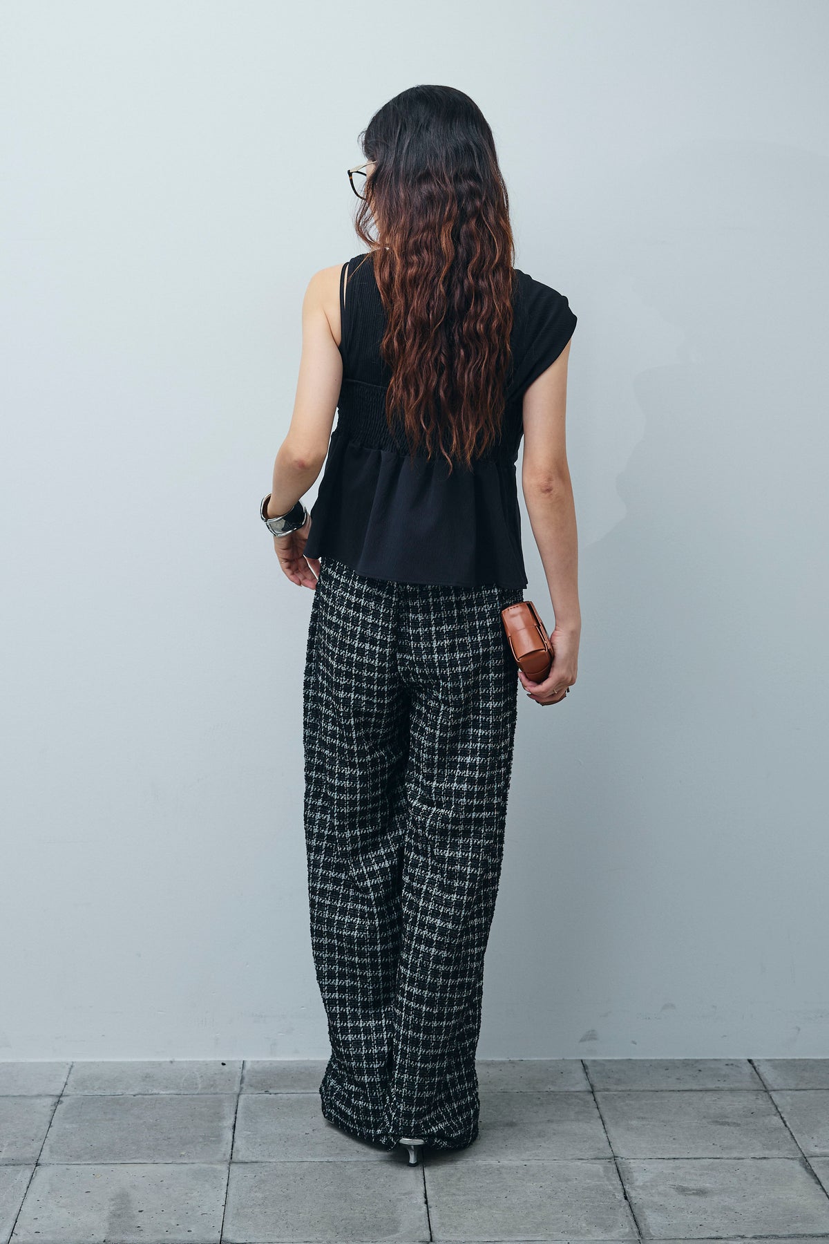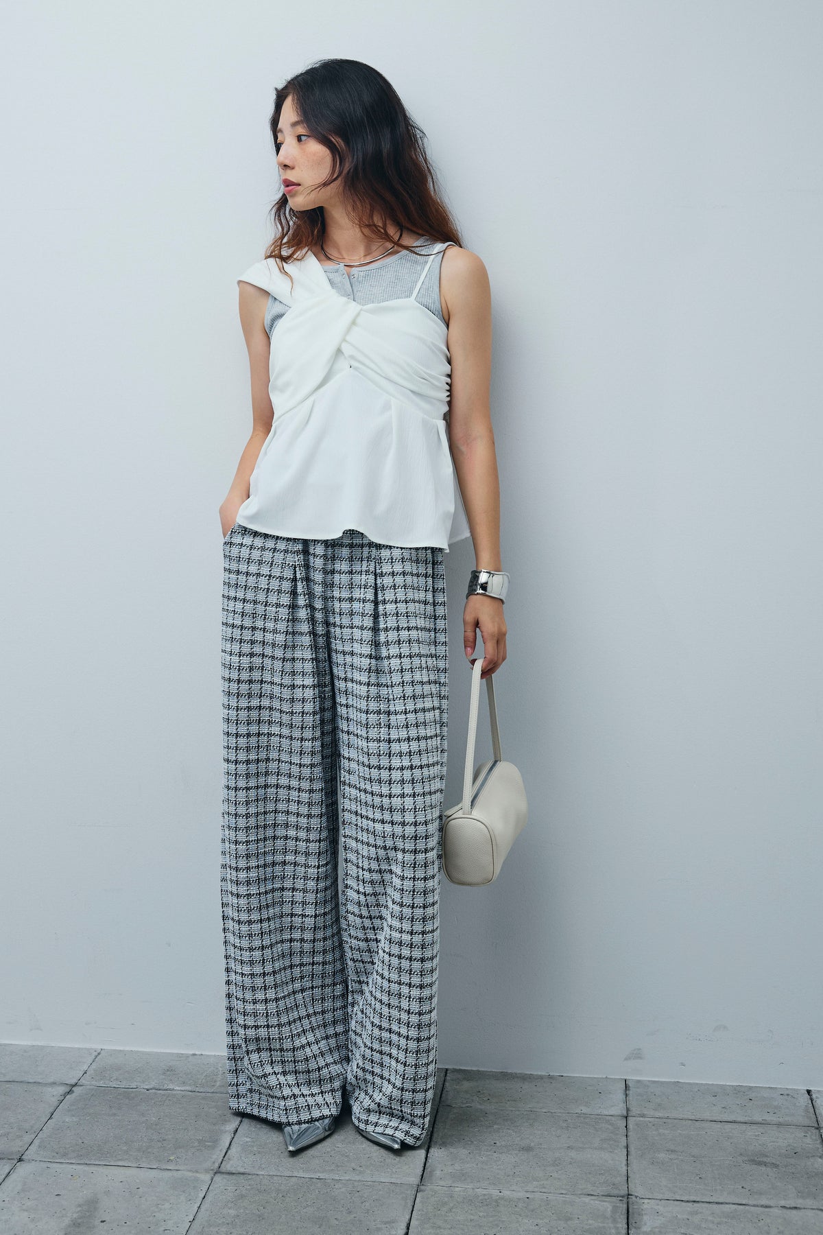 [予約/SET]アシンメトリーキャミソール+セルフカットリブヘンリーネックノースリーブトップス+サマーツイードリラックスパンツ(3set)