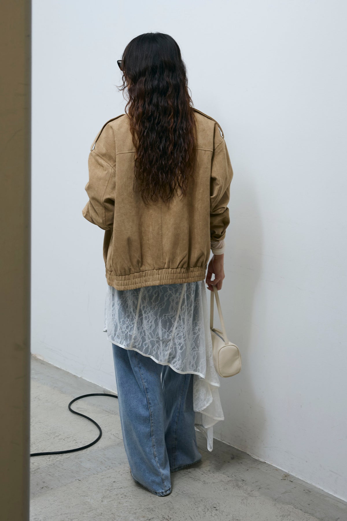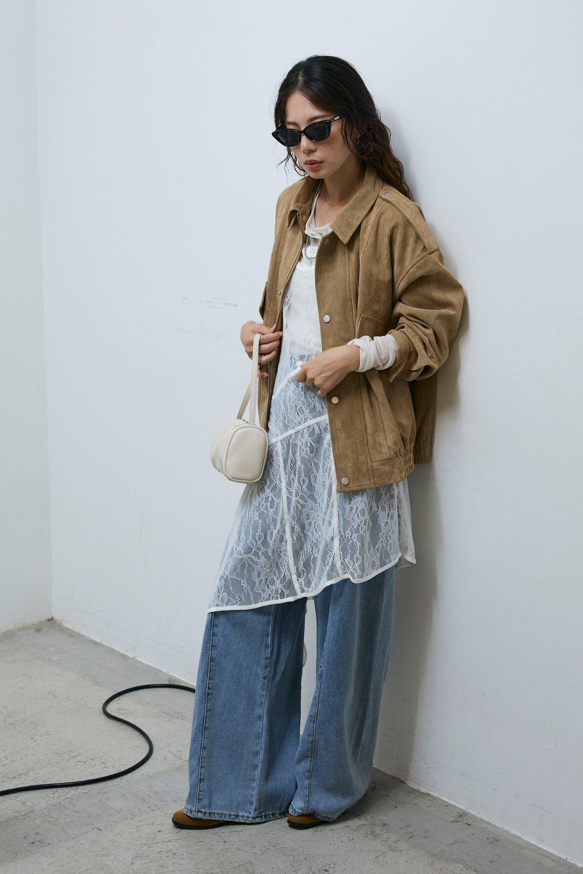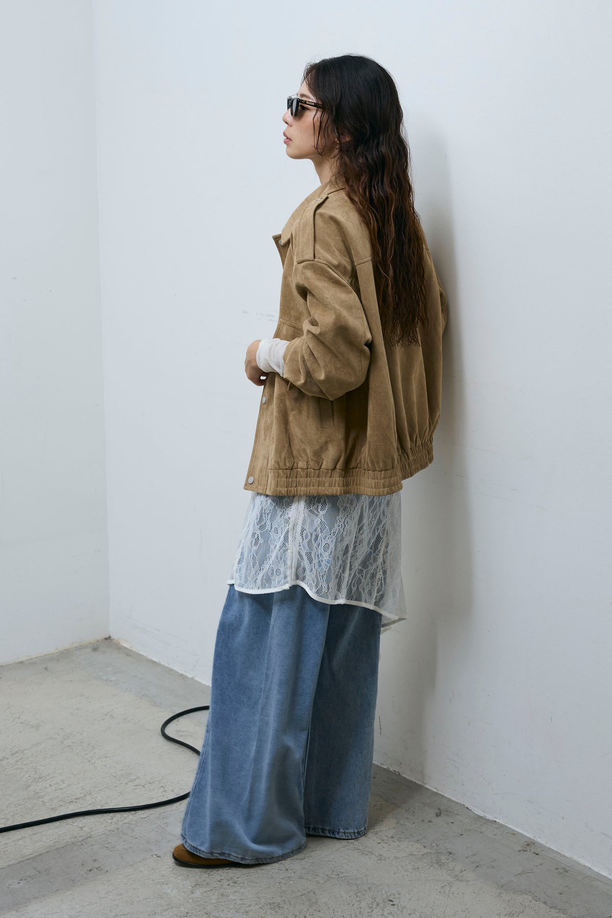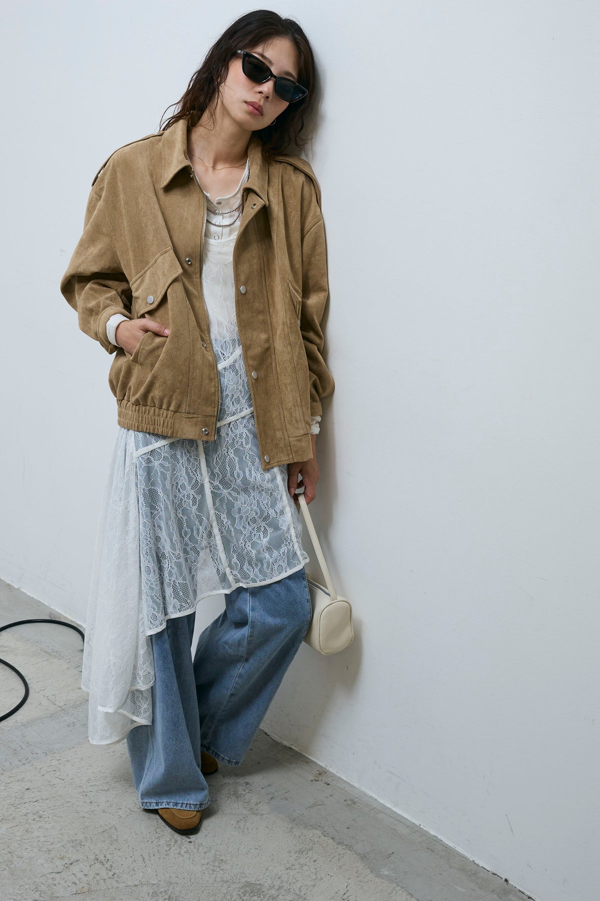 [予約/SET]エポーレット付きスウェードライクブルゾン+シアーヘンリーネックロンT+サイド切り替えデニム(3set)