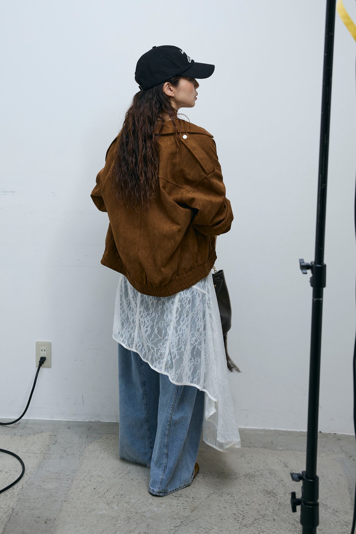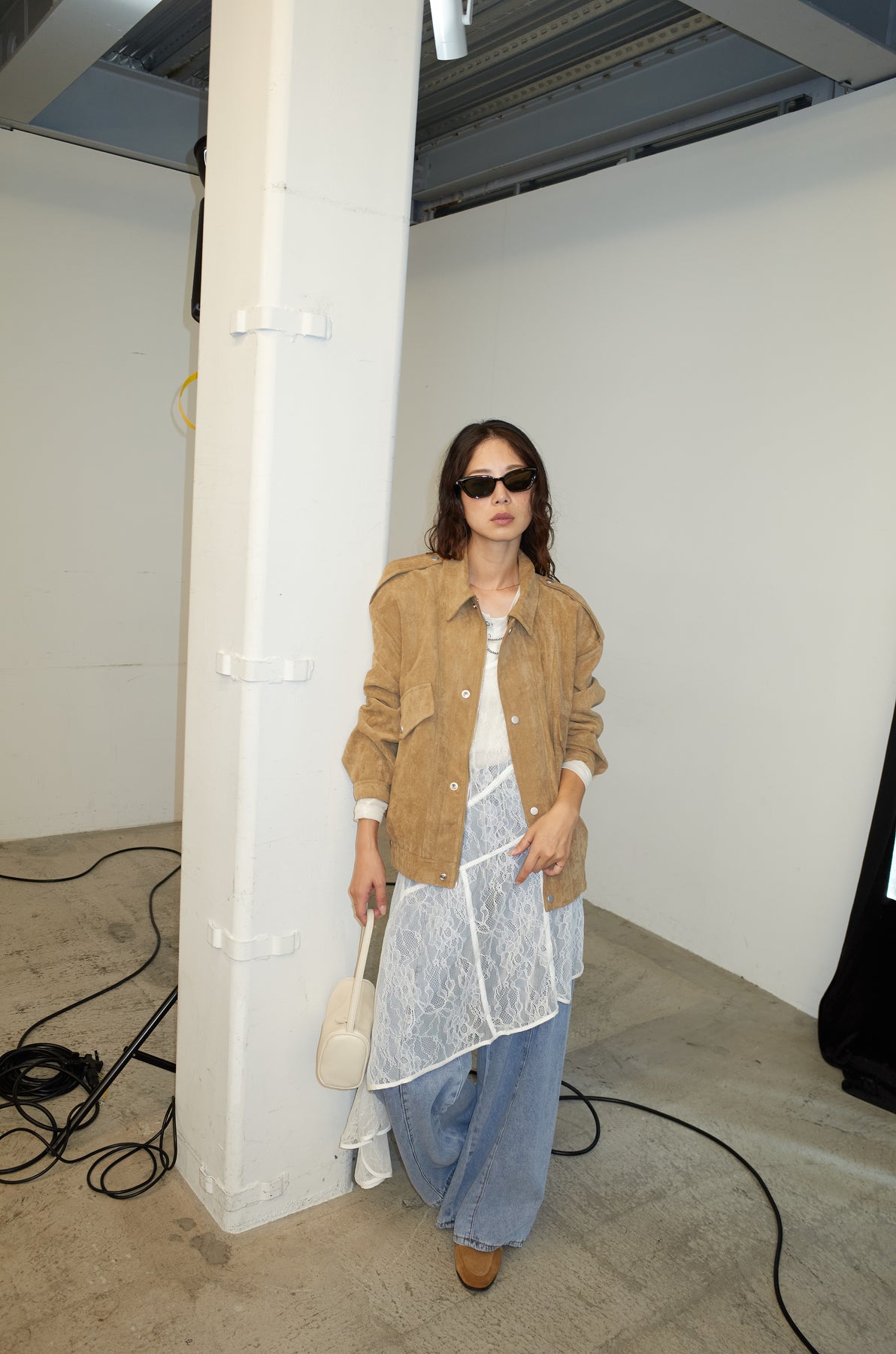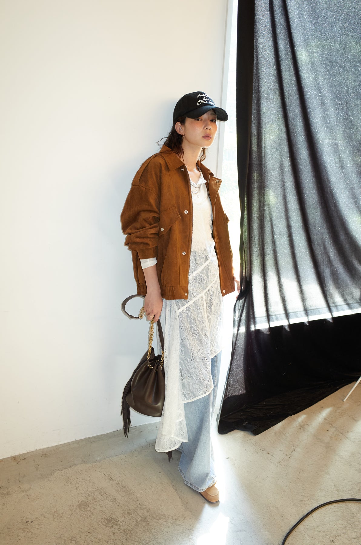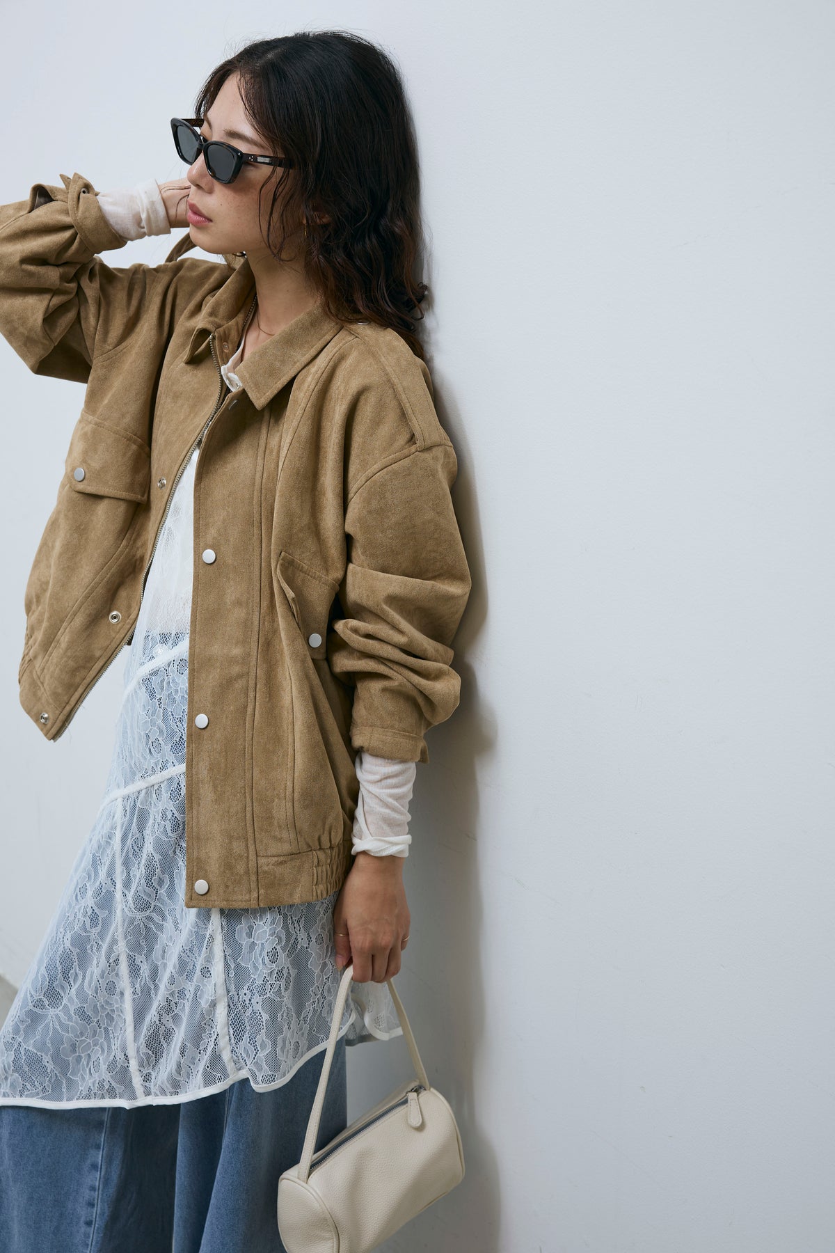 [予約/SET]エポーレット付きスウェードライクブルゾン+シアーヘンリーネックロンT+サイド切り替えデニム(3set)