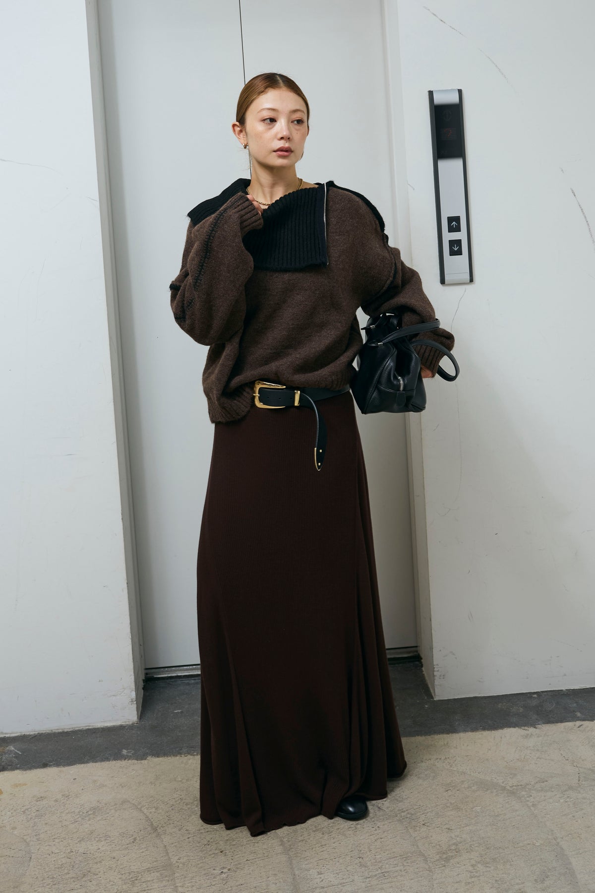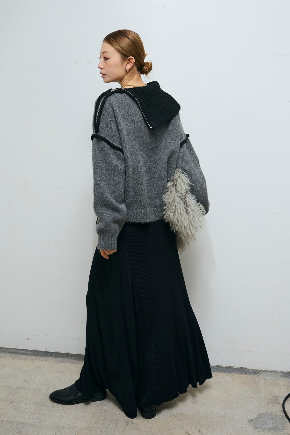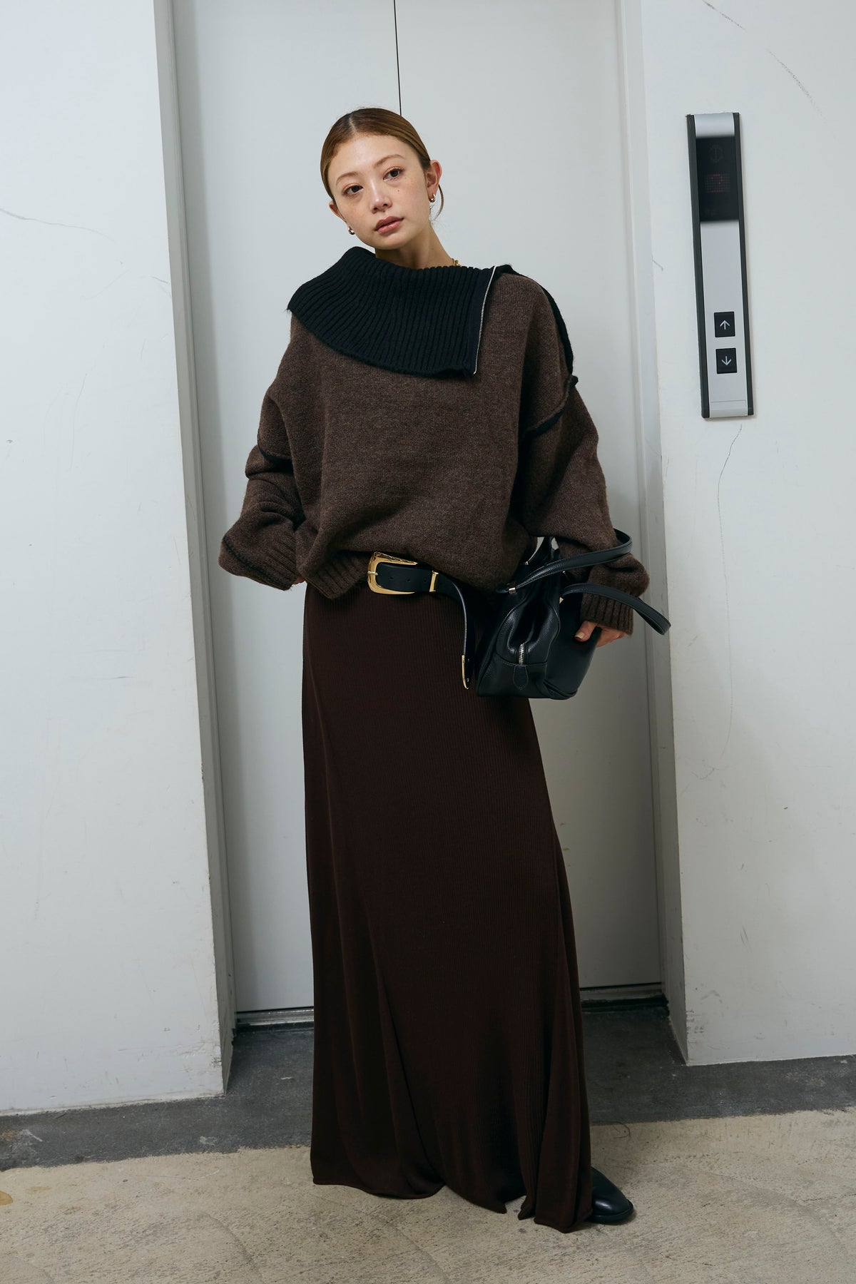 [予約/SET]ハイネックジップデザインニットトップス+切り替えリブニットロングスカート(2set)
