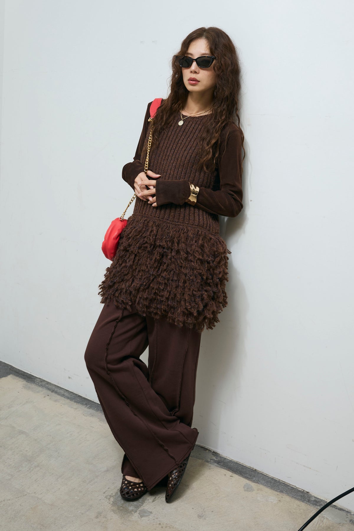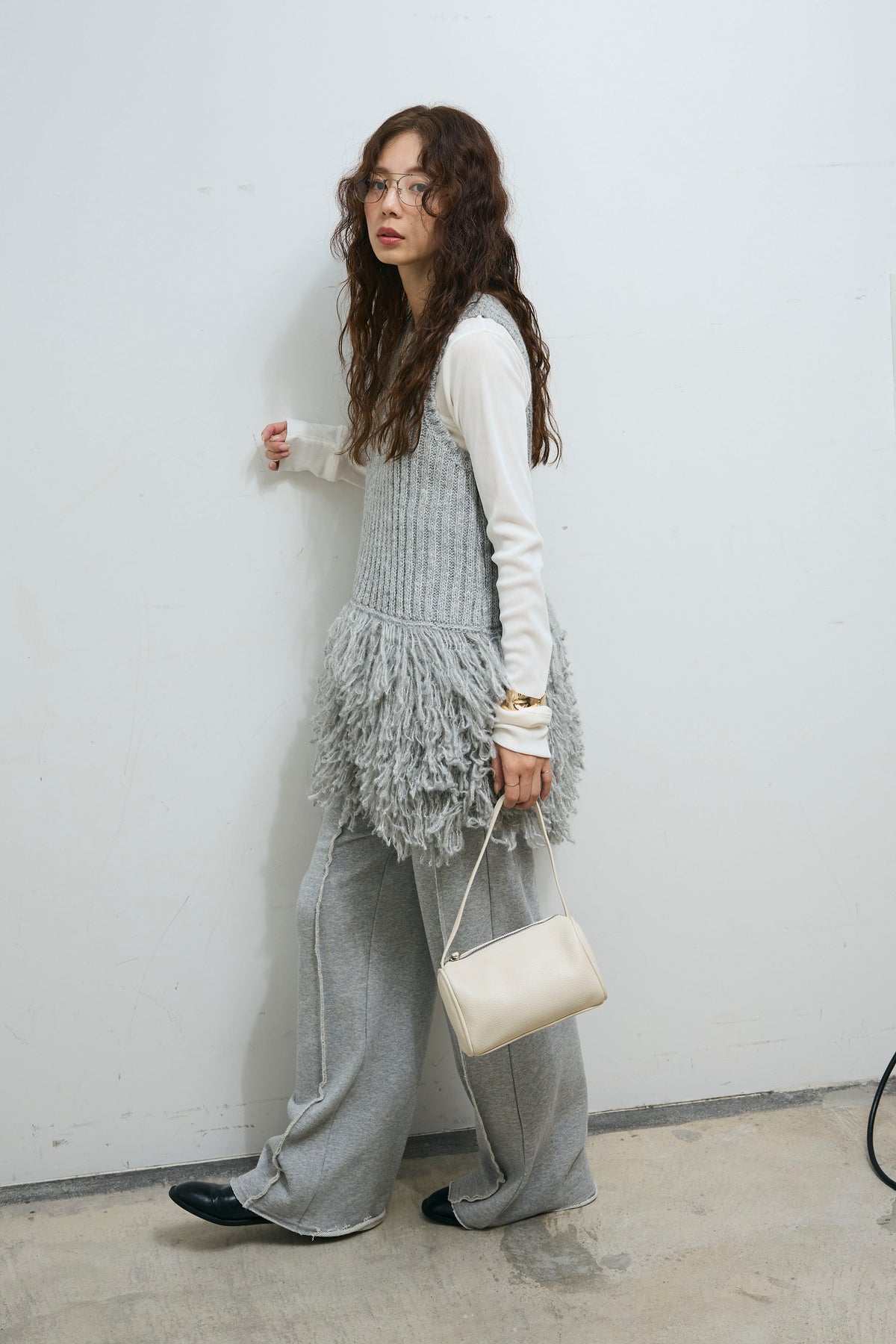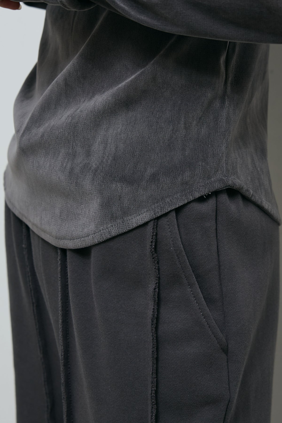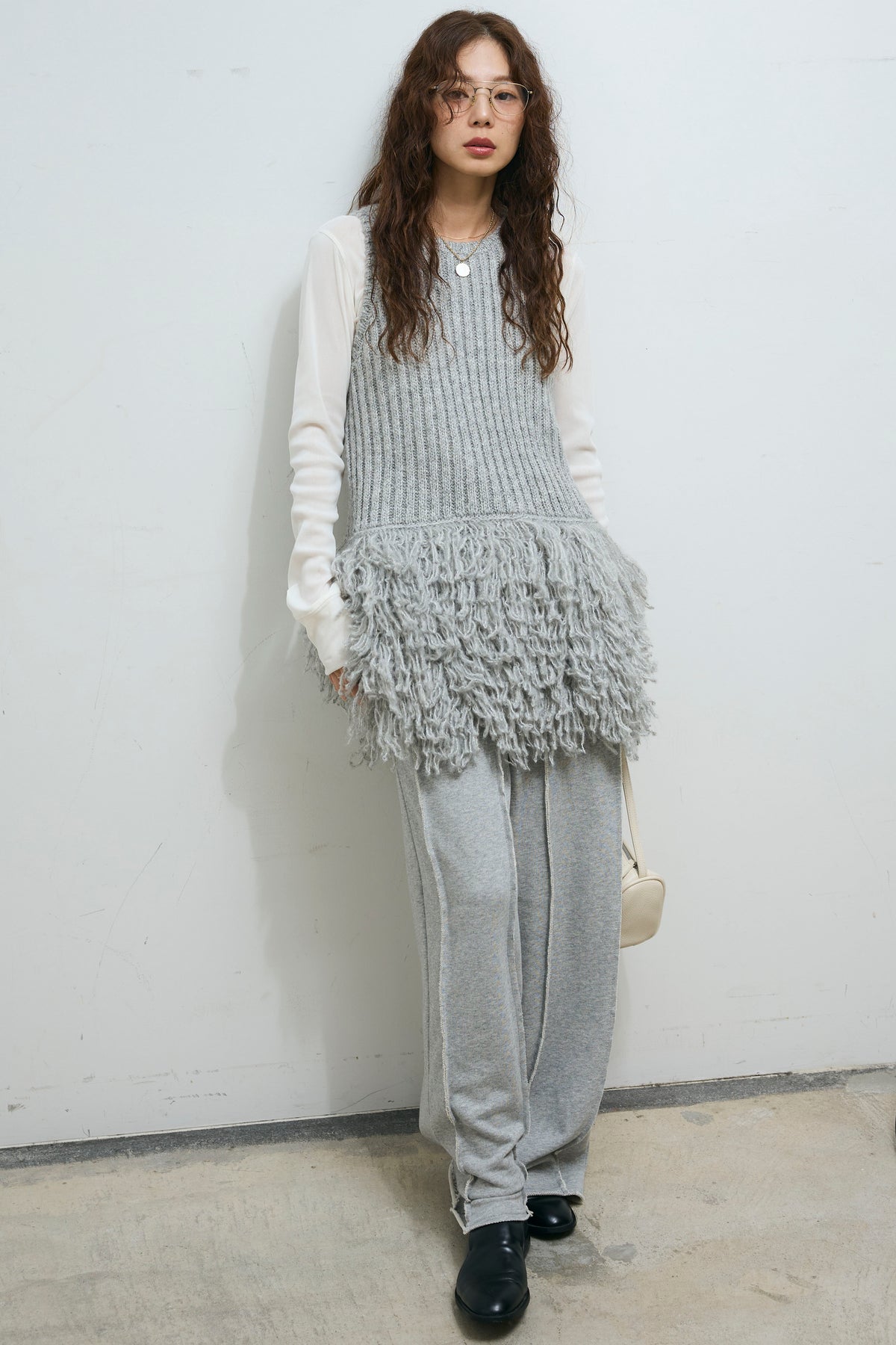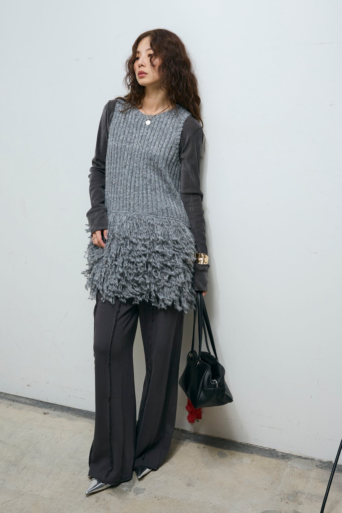 [予約/SET]フリンジ切り替えニットチュニック+ベロアチュールヘンリーネックT+ストレート裏毛パンツ(3set)