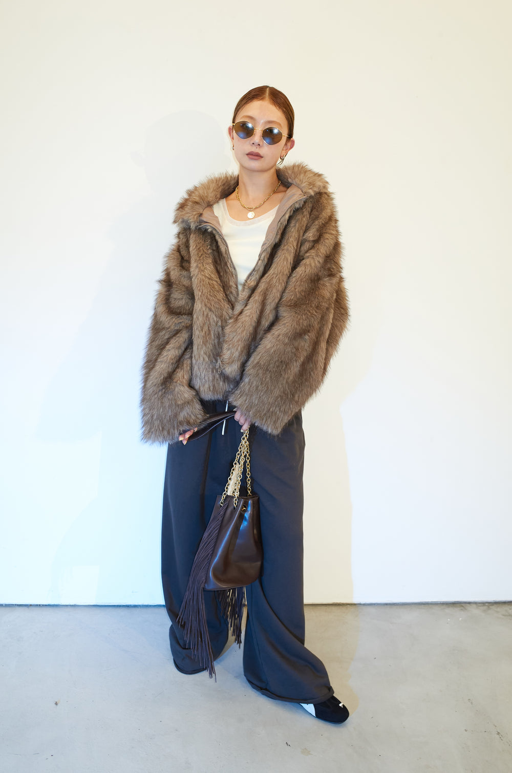 [予約/SET]ラップシャギーポンチョ+オーバーサイズデニムシャツ+リラックスニットパンツ(3set)