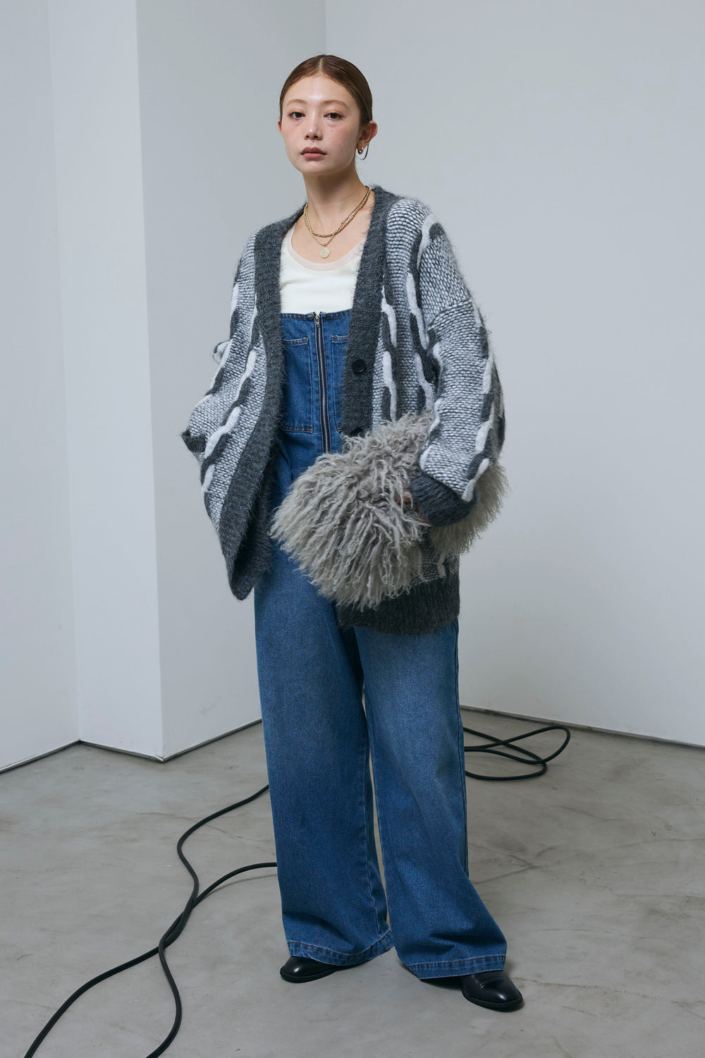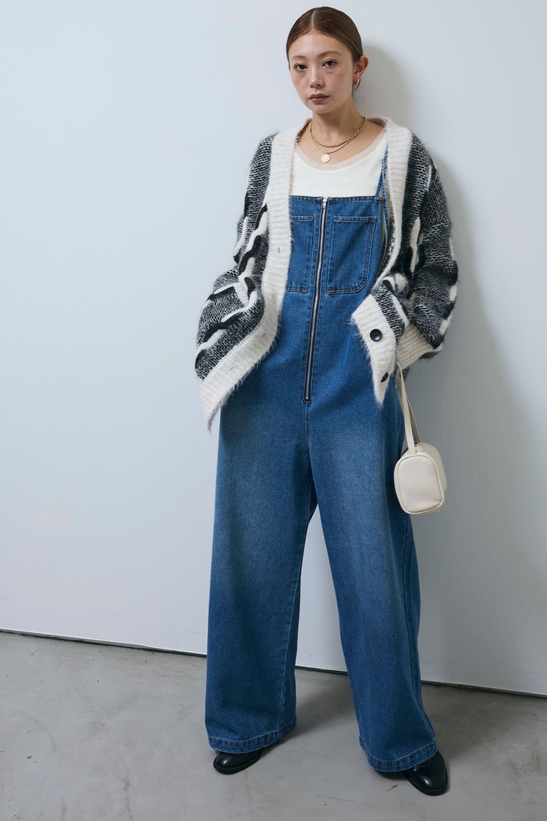 [予約/SET]ロープ柄ボリュームニットカーディガン+フロントジップストラップデザインデニムサロペット(2set)