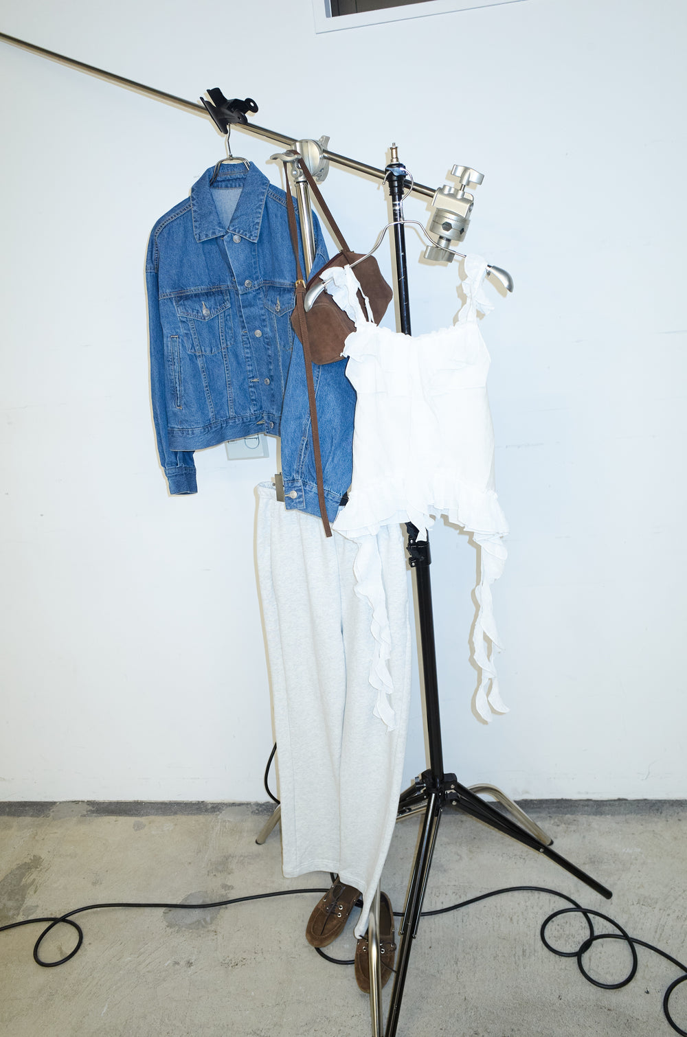 [予約/SET]デニムツイルジャケット+ラッフルフリルキャミソール+スウェットフレアパンツ(3set)