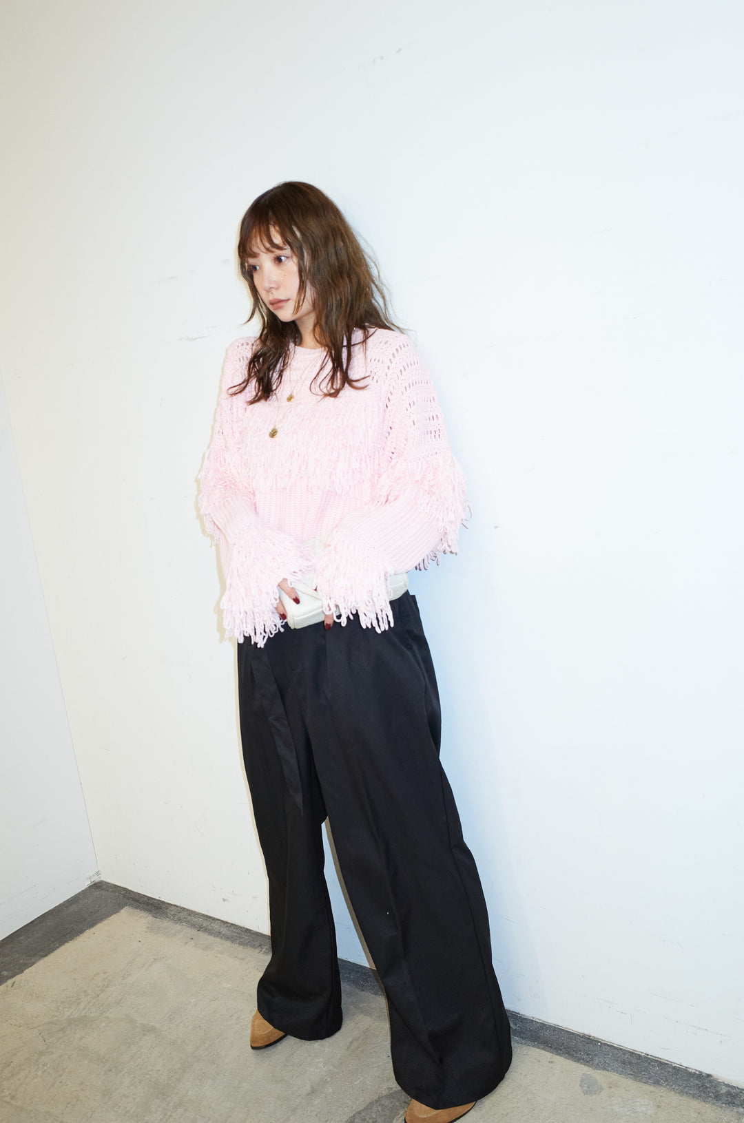 [予約/SET]ループフリンジクルーネックニット+ツイルチノベルトパンツ(2set)